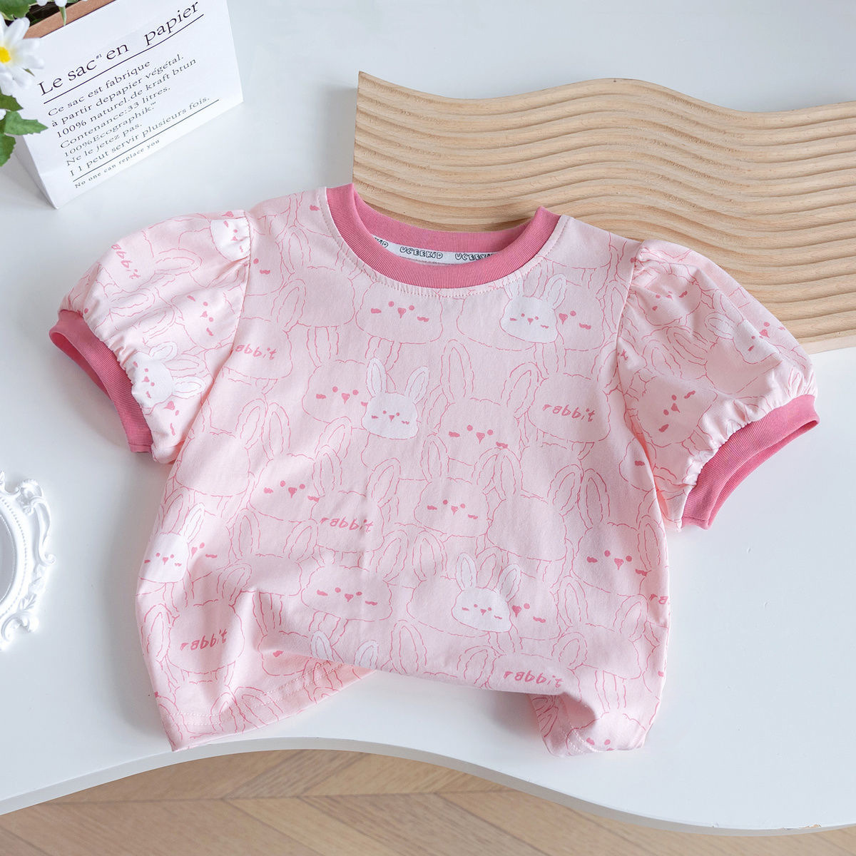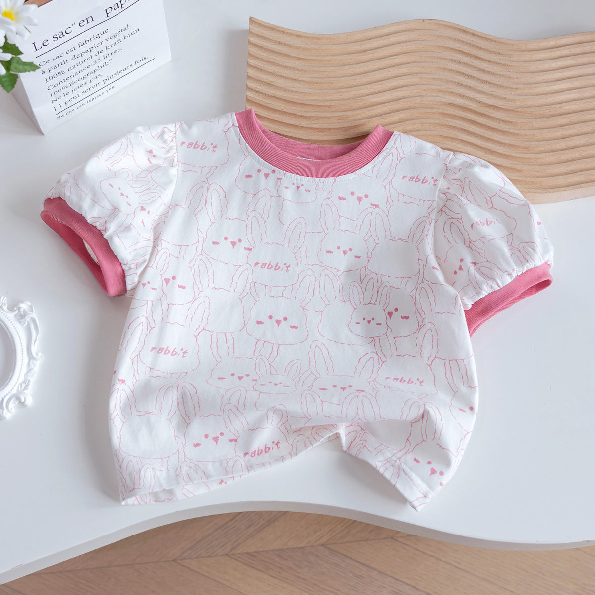 소녀 2025 년 새 여름 어린이 반팔 티셔츠 서양식 올매치 만화 인쇄 여름 둥근 목 반소매 탑