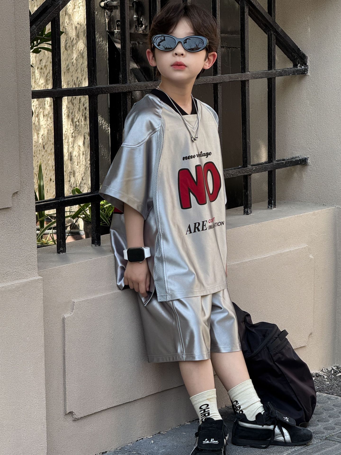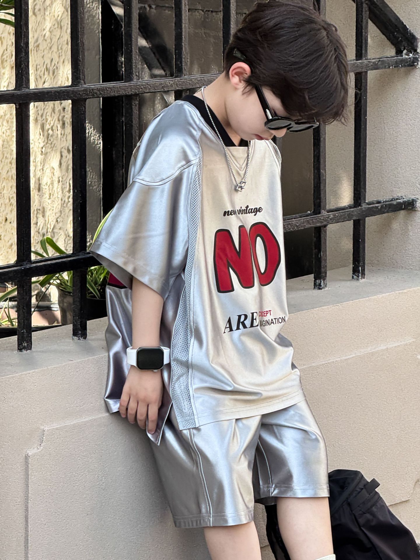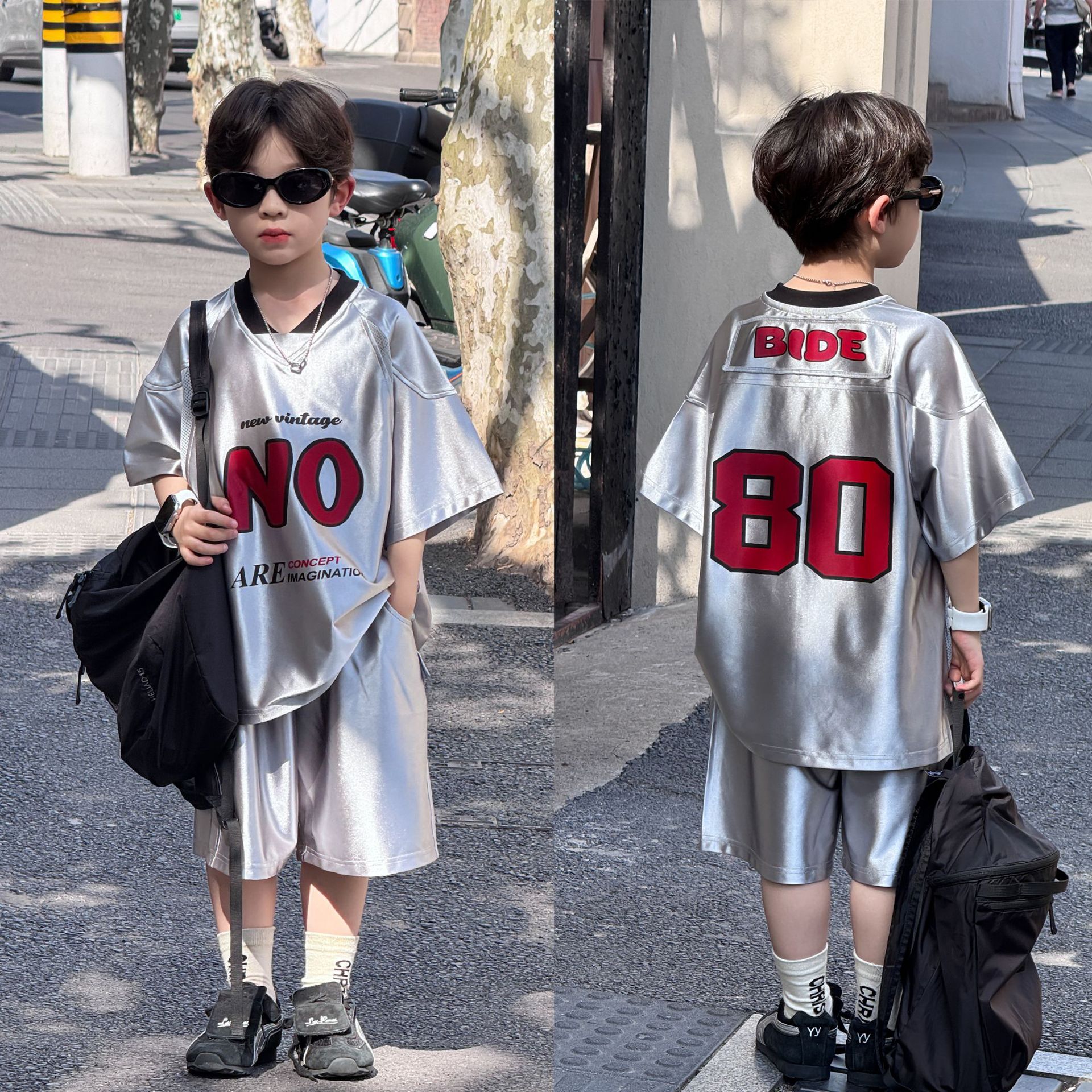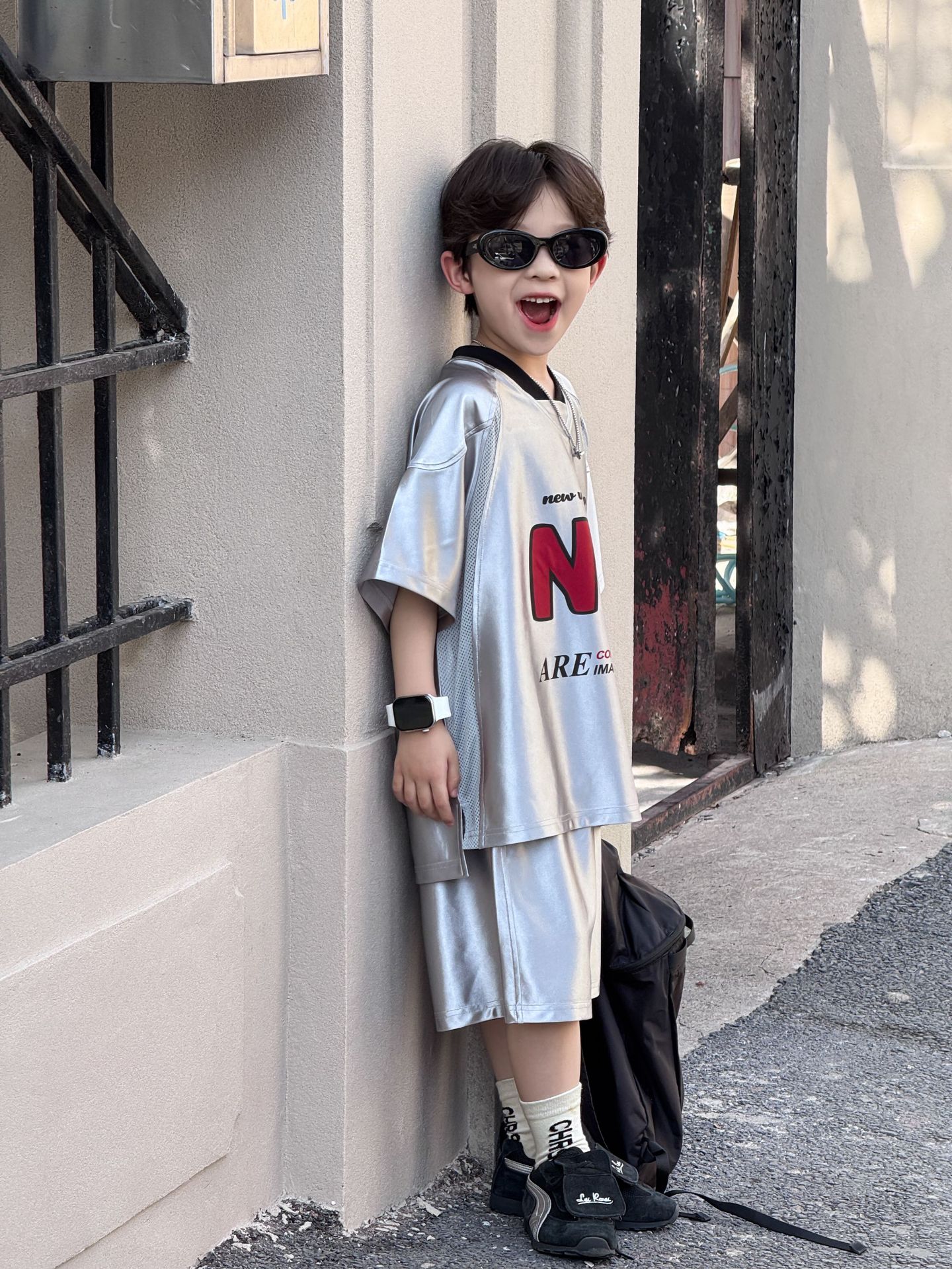 25 여름 새로운 한국 아동복 어린이 소년 실버 편지 인쇄 스포츠 통기성 공 세트 짧은 소매 세트스토어 가기