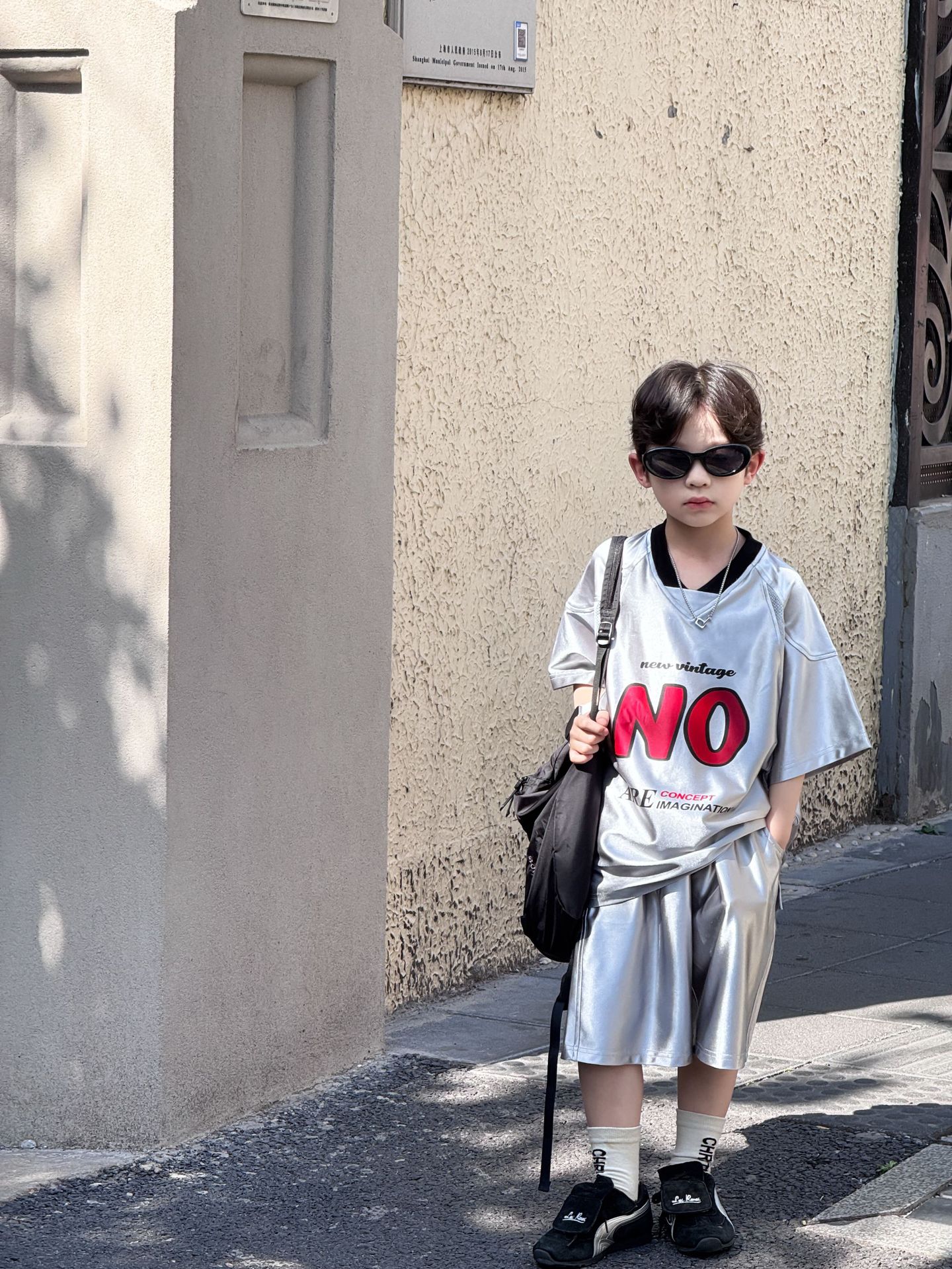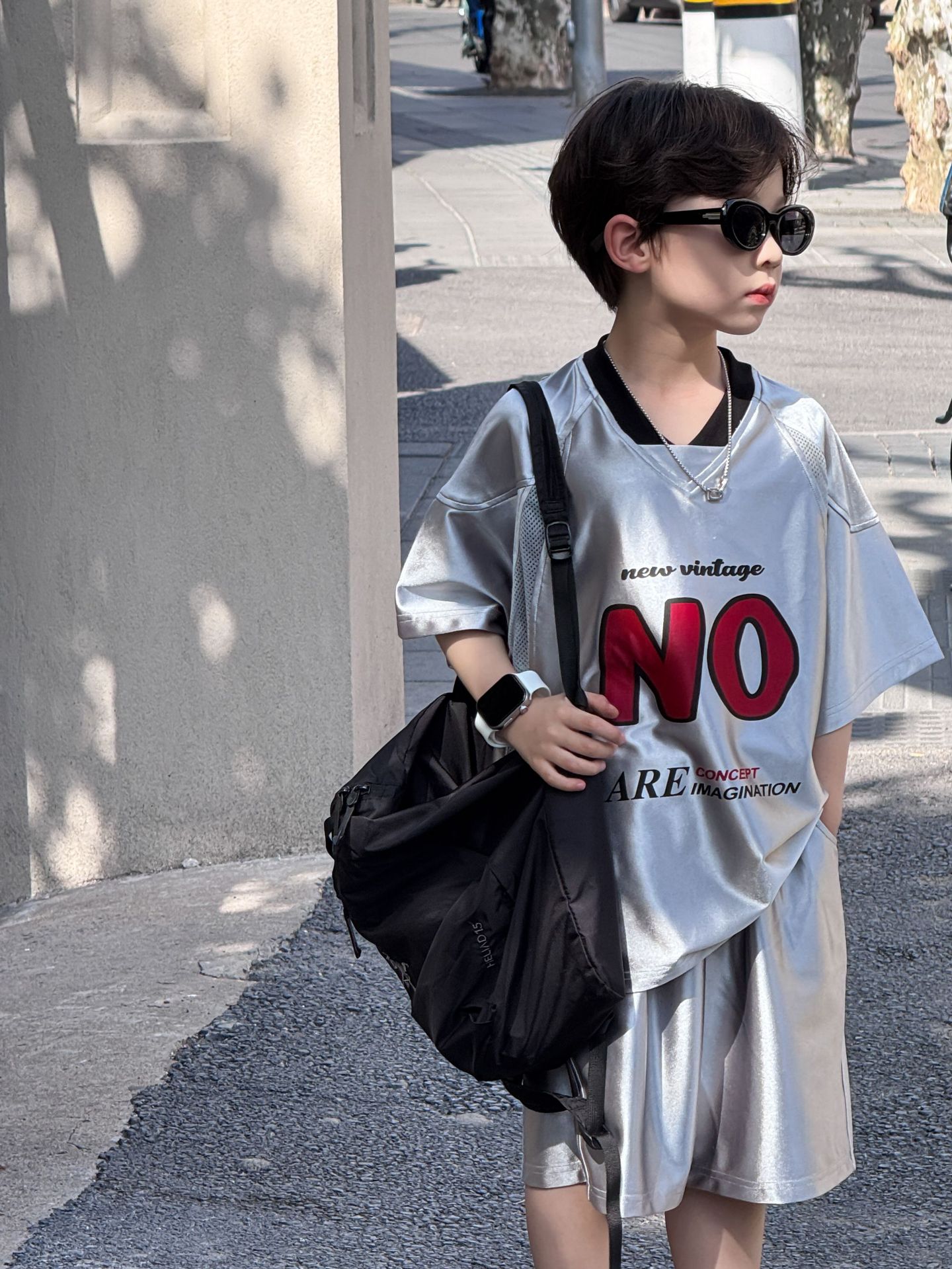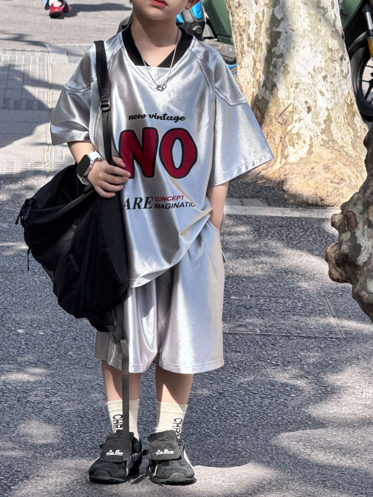25 여름 새로운 한국 아동복 어린이 소년 실버 편지 인쇄 스포츠 통기성 공 세트 짧은 소매 세트스토어 가기