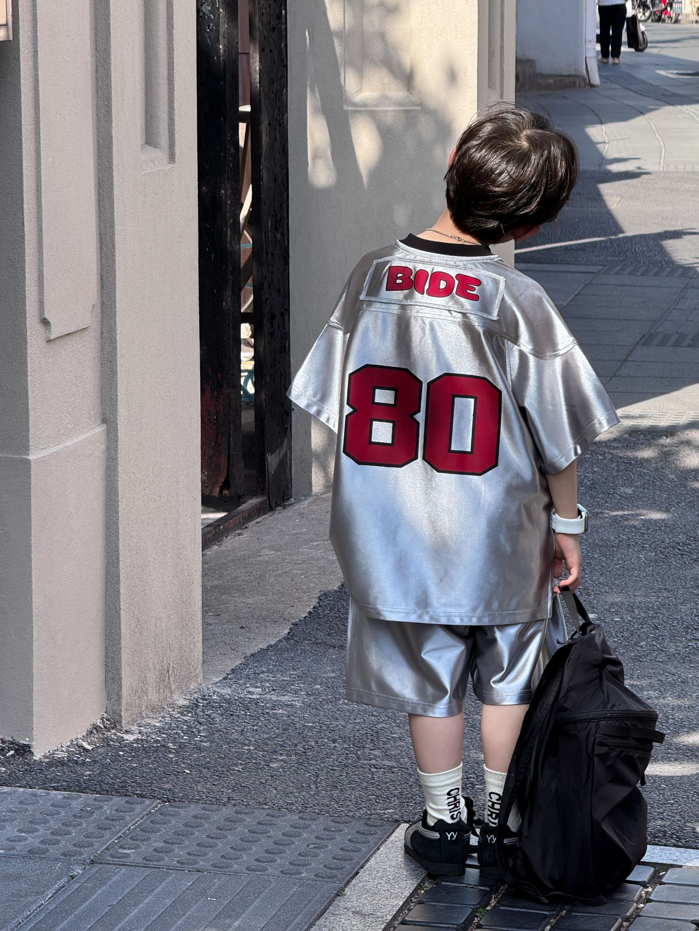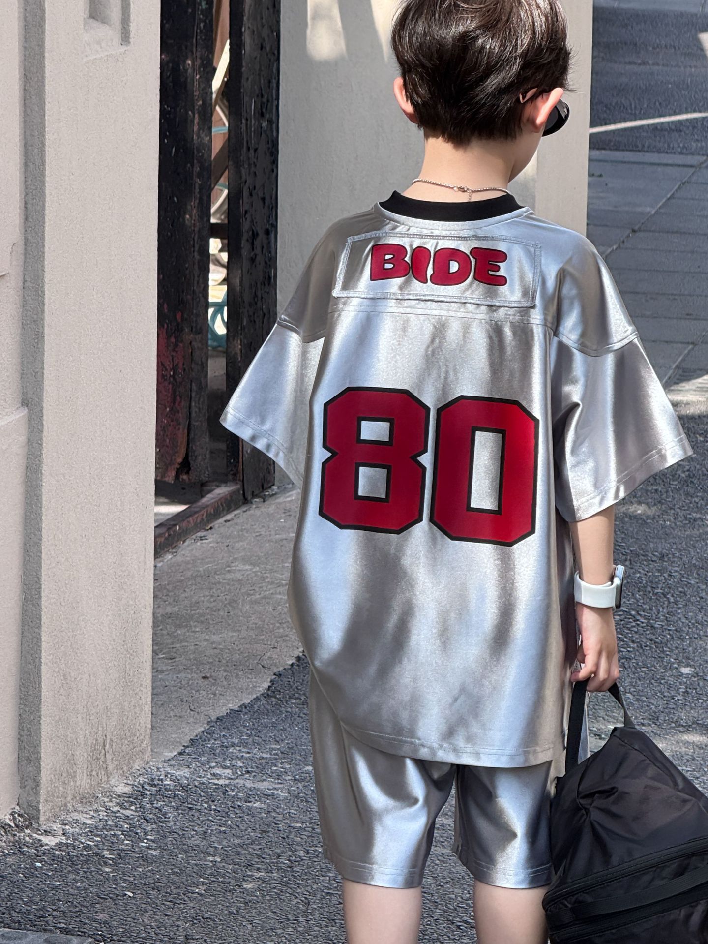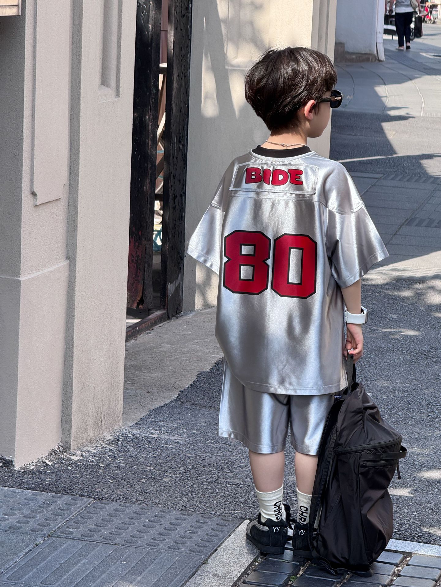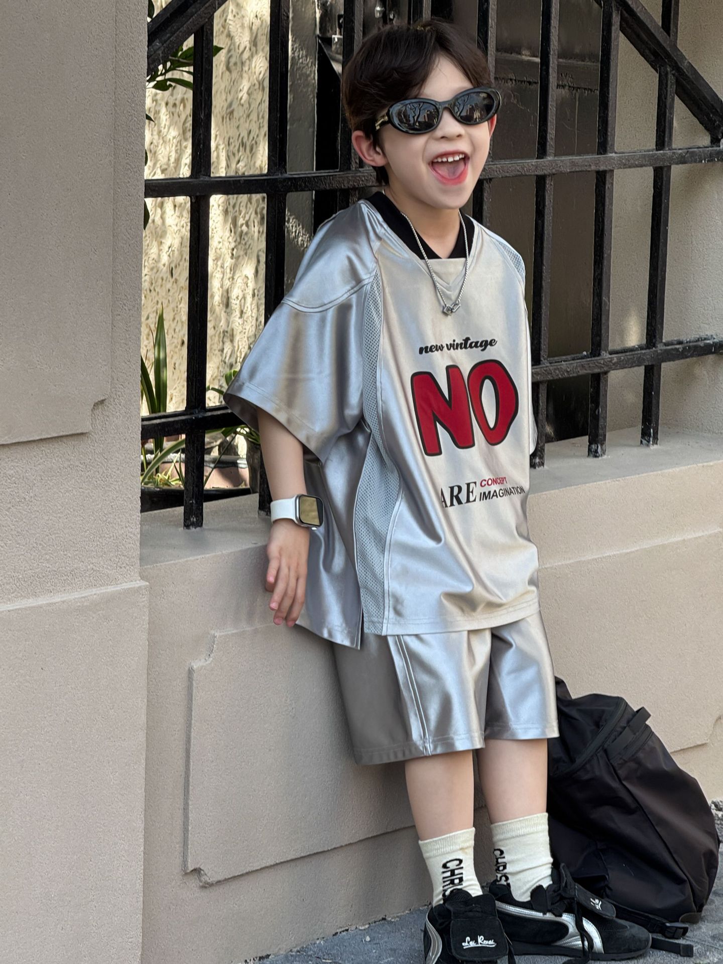 25 여름 새로운 한국 아동복 어린이 소년 실버 편지 인쇄 스포츠 통기성 공 세트 짧은 소매 세트스토어 가기