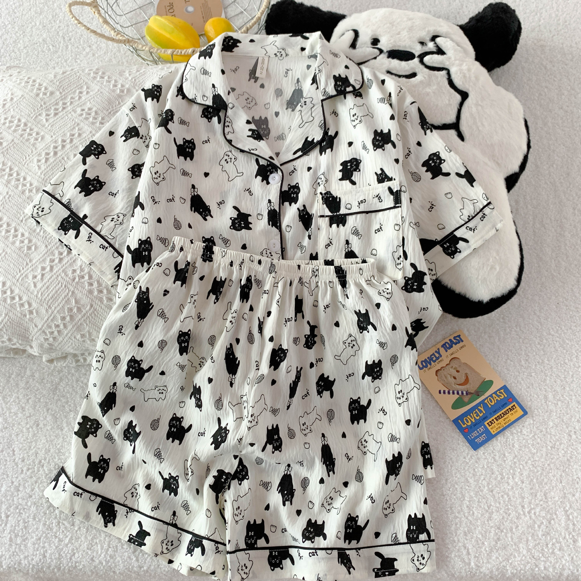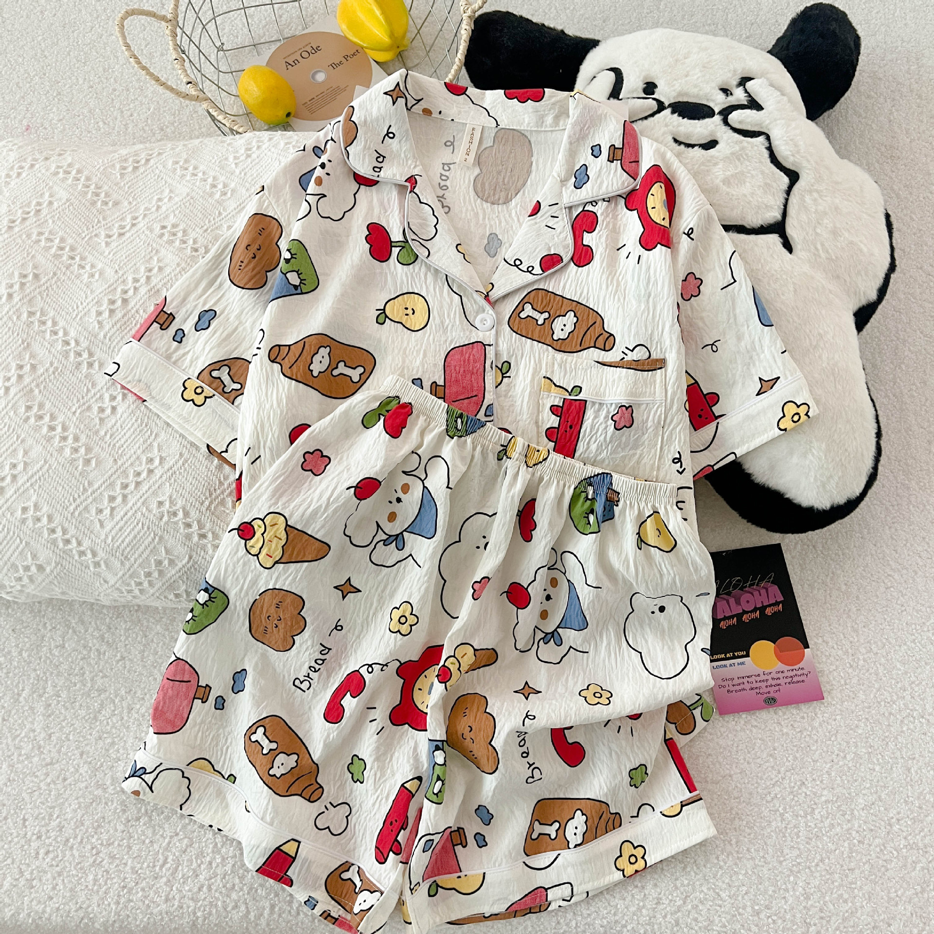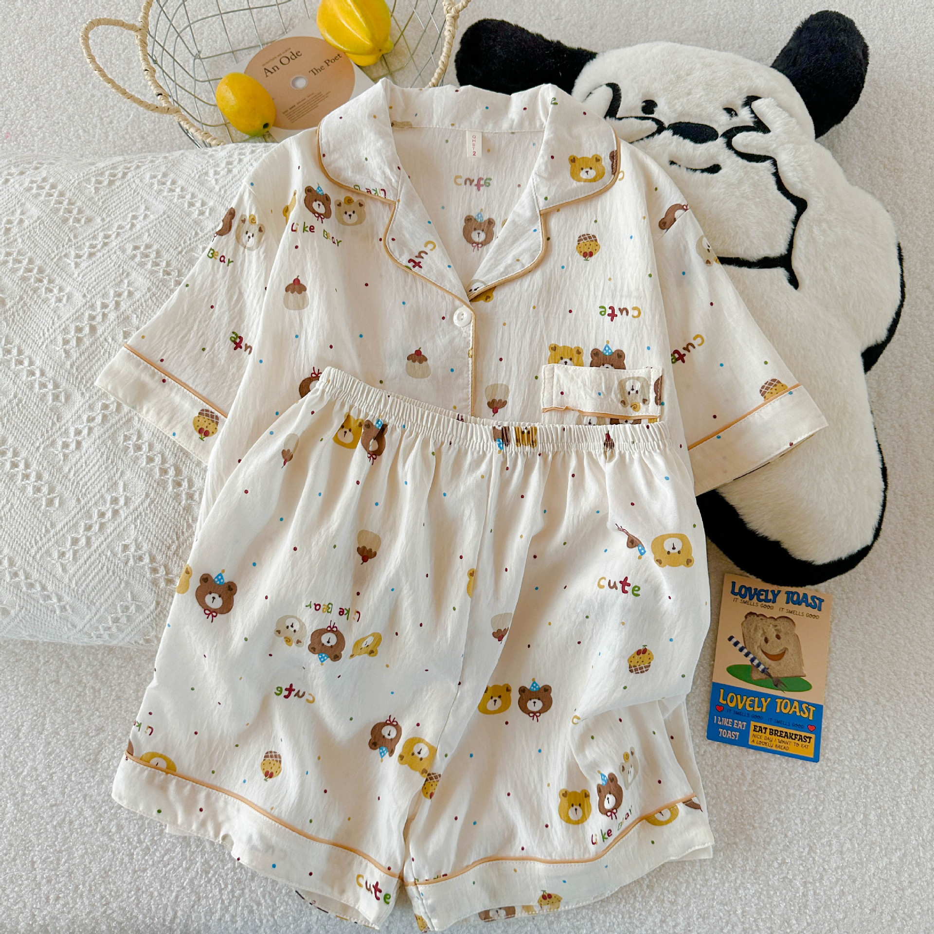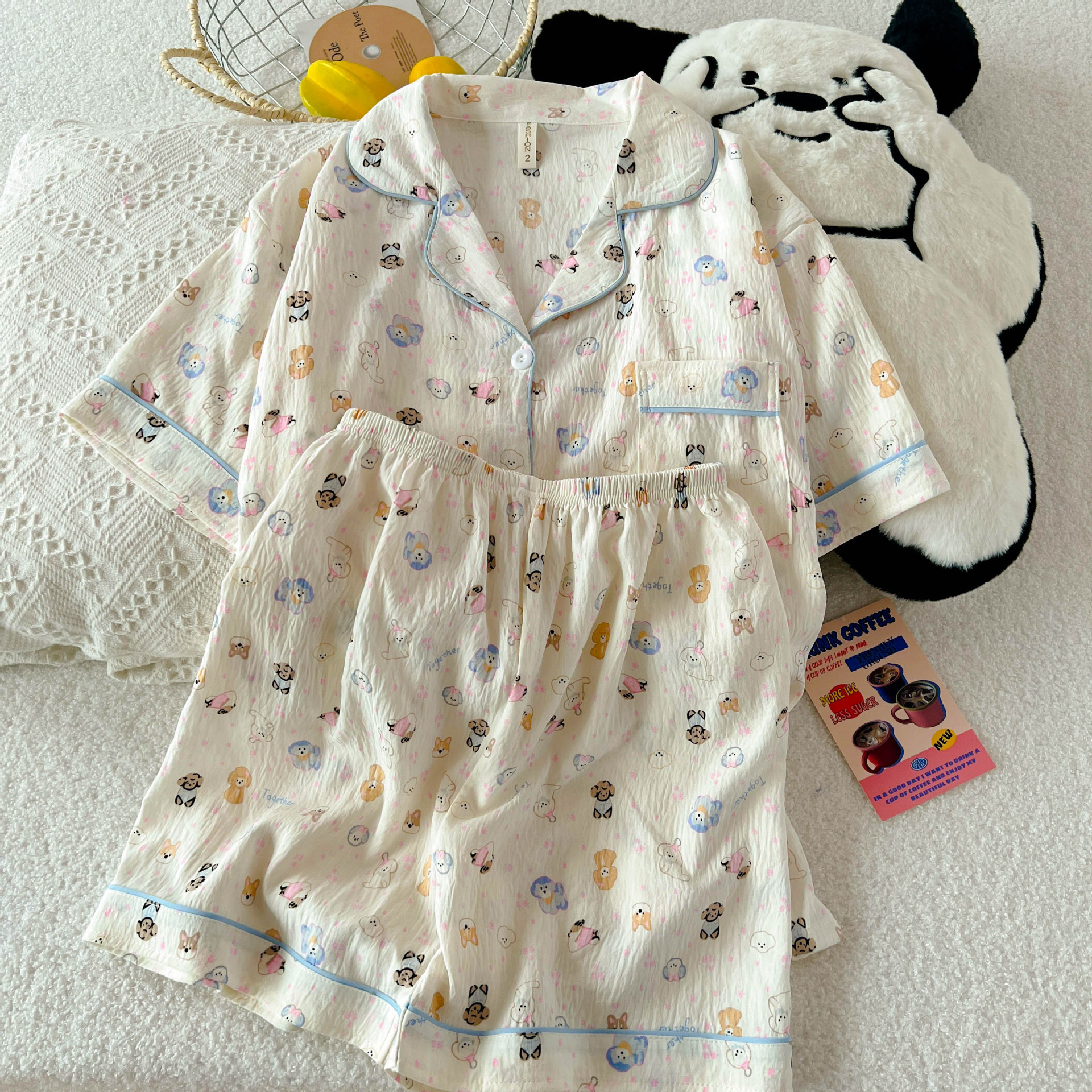 여성을위한 카디건 잠옷 여름 2024 새로운 달콤하고 귀여운 캐주얼 클라우드 코튼 반팔 반바지 홈웨어 세트스토어 가기