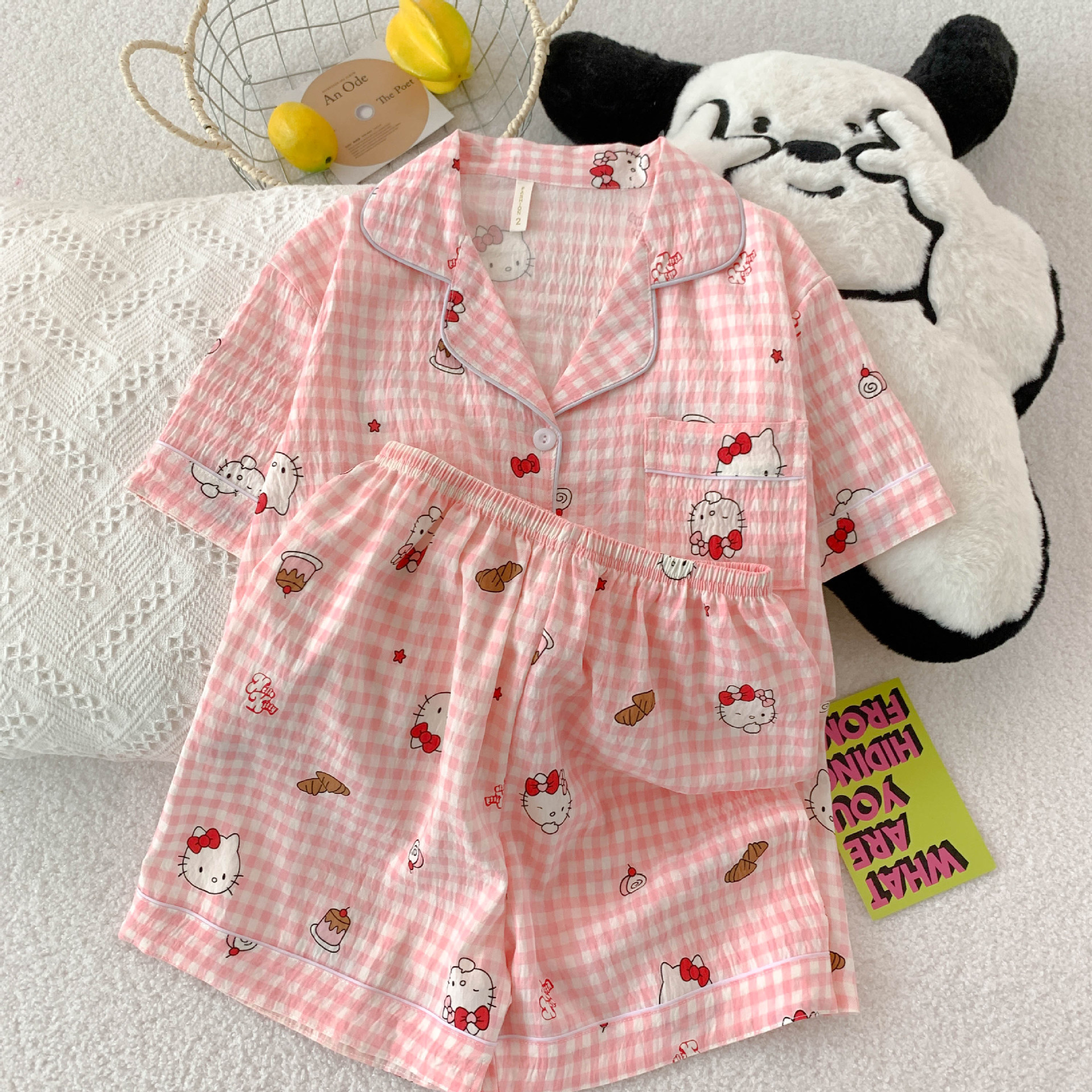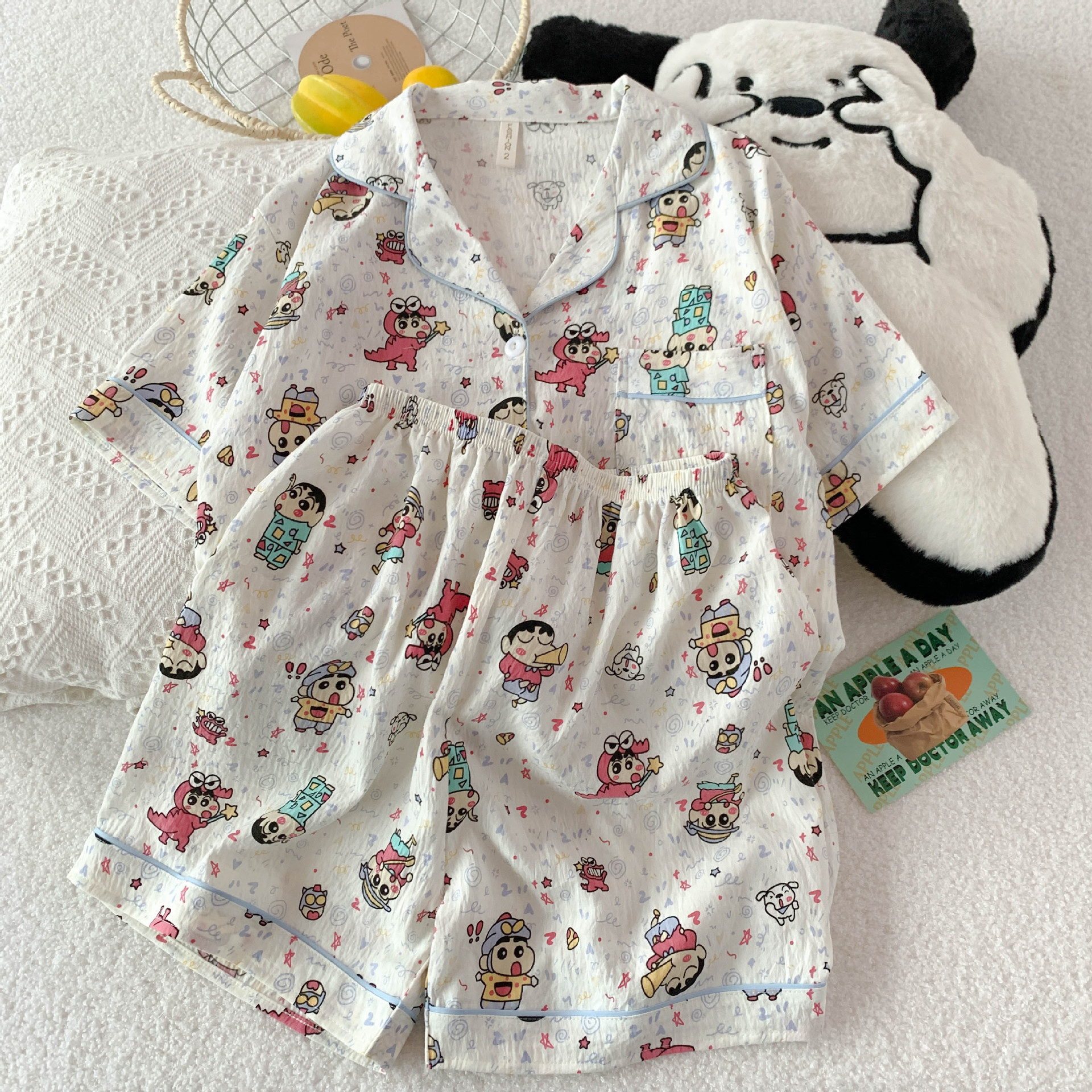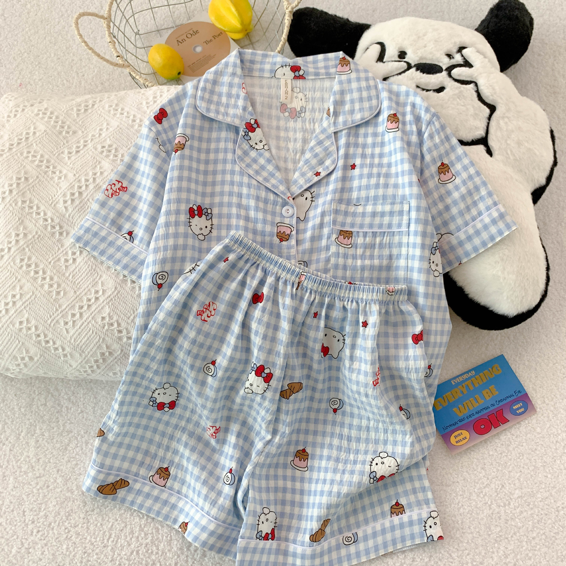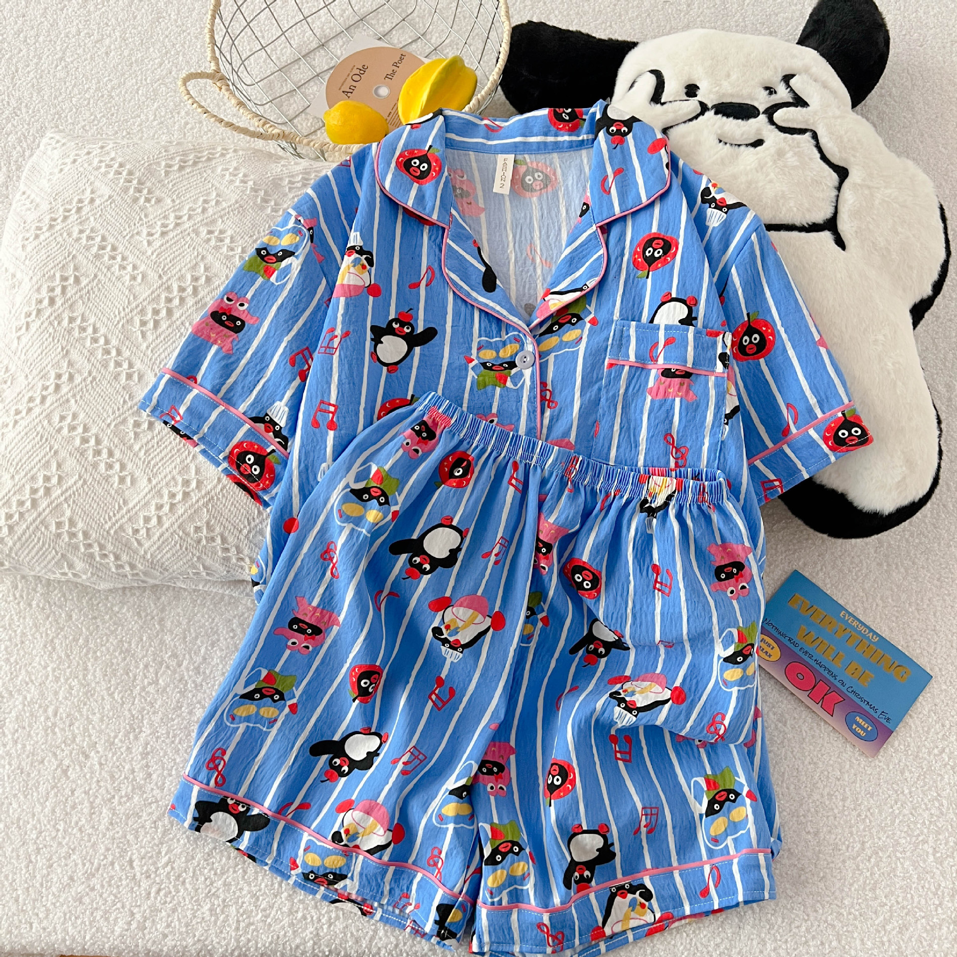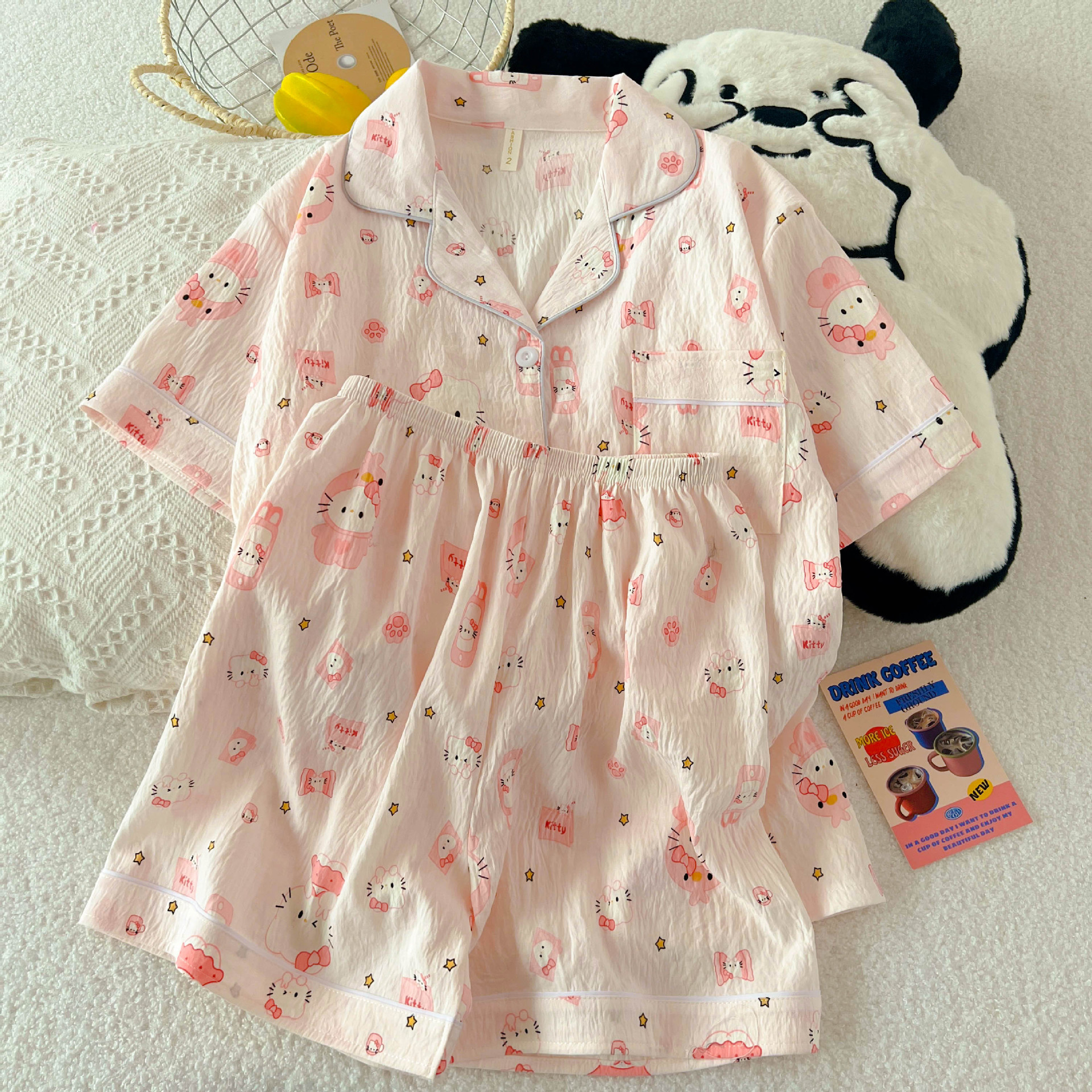 여성을위한 카디건 잠옷 여름 2024 새로운 달콤하고 귀여운 캐주얼 클라우드 코튼 반팔 반바지 홈웨어 세트스토어 가기