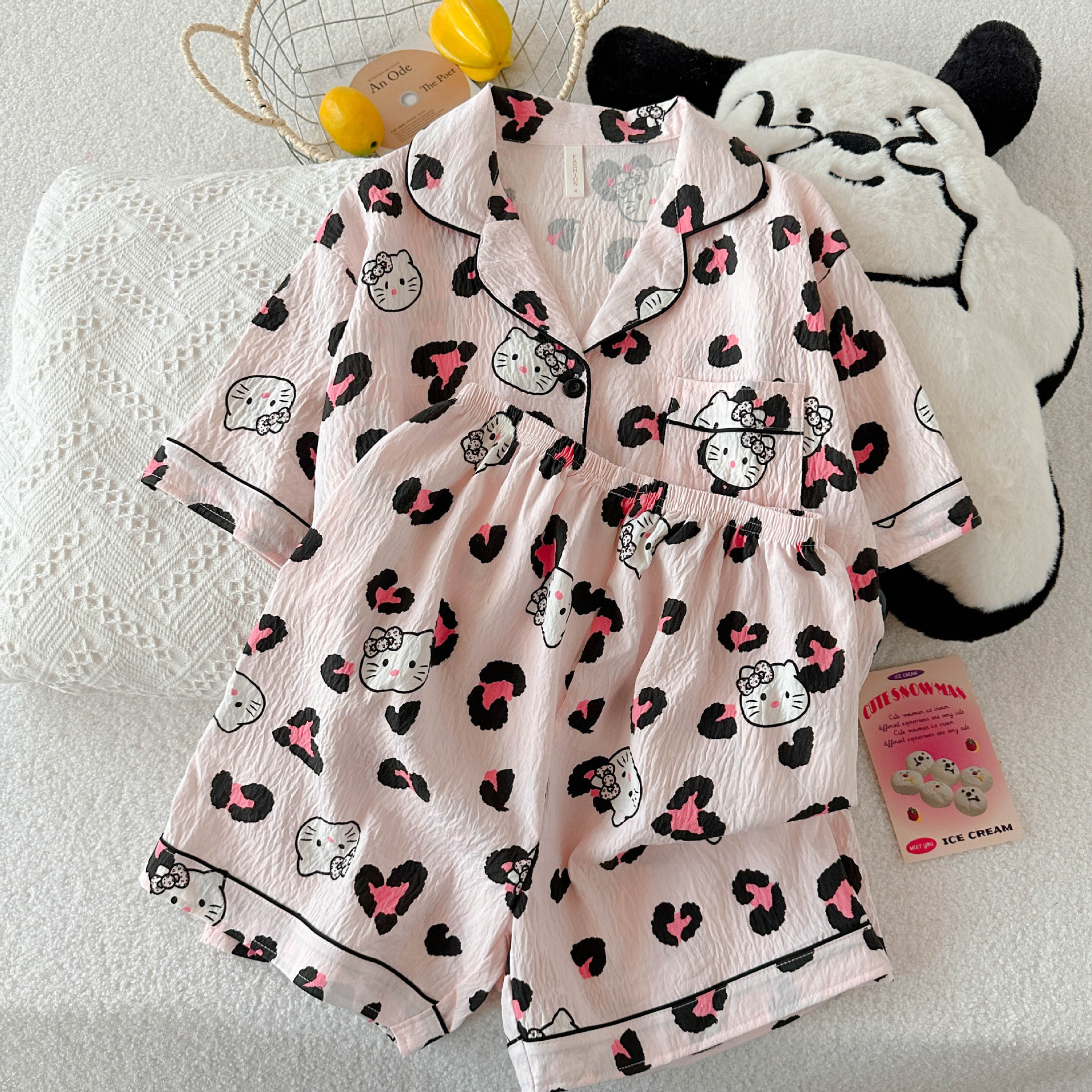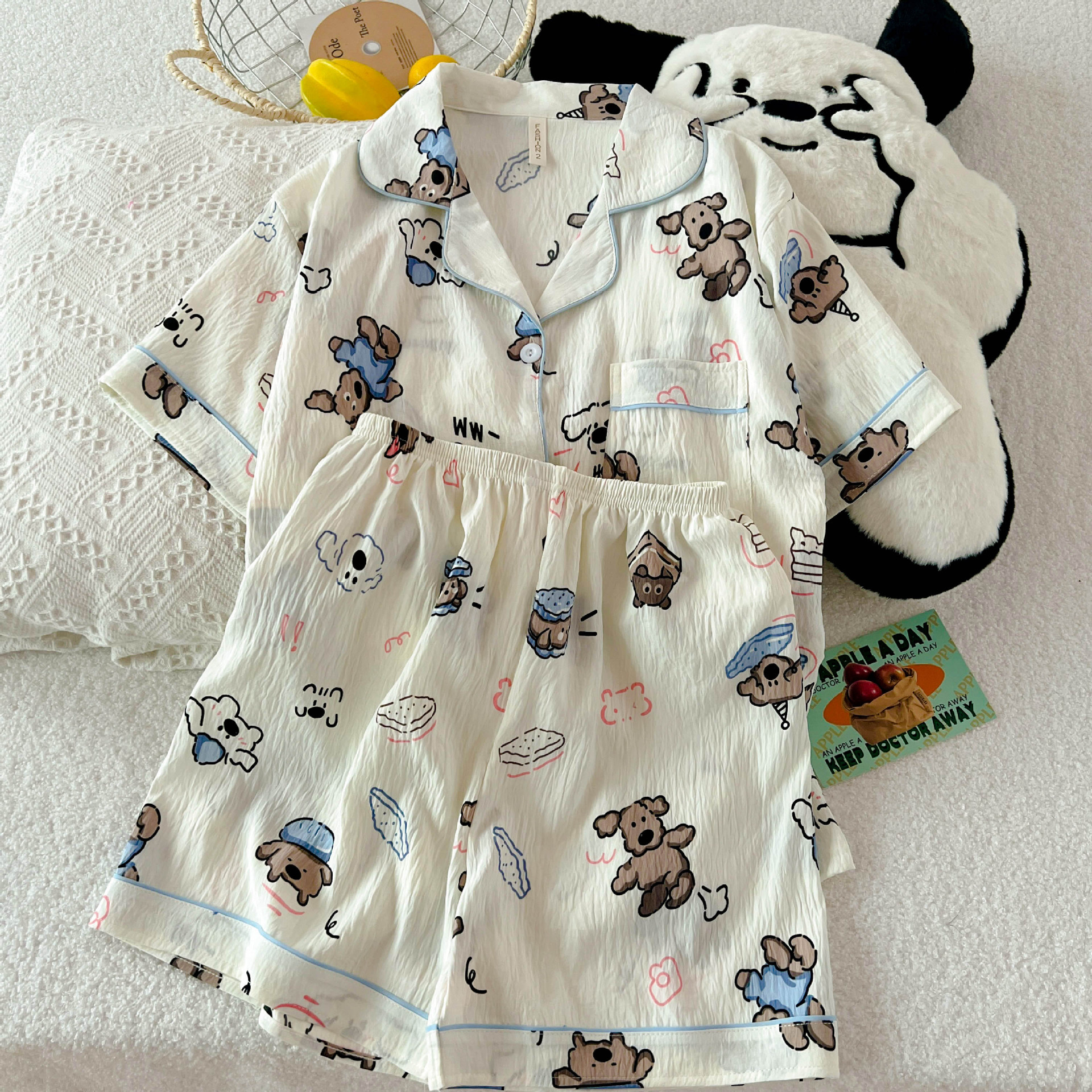 여성을위한 카디건 잠옷 여름 2024 새로운 달콤하고 귀여운 캐주얼 클라우드 코튼 반팔 반바지 홈웨어 세트