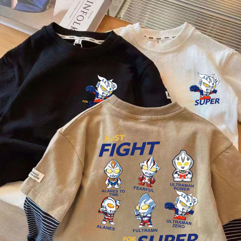 100 면 소년 긴 소매 티셔츠 어린이 봄과 가을 새 만화 울트라 맨베이스 중소 어린이 소년 탑스토어 가기