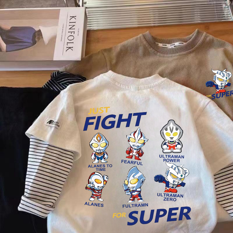 100 면 소년 긴 소매 티셔츠 어린이 봄과 가을 새 만화 울트라 맨베이스 중소 어린이 소년 탑