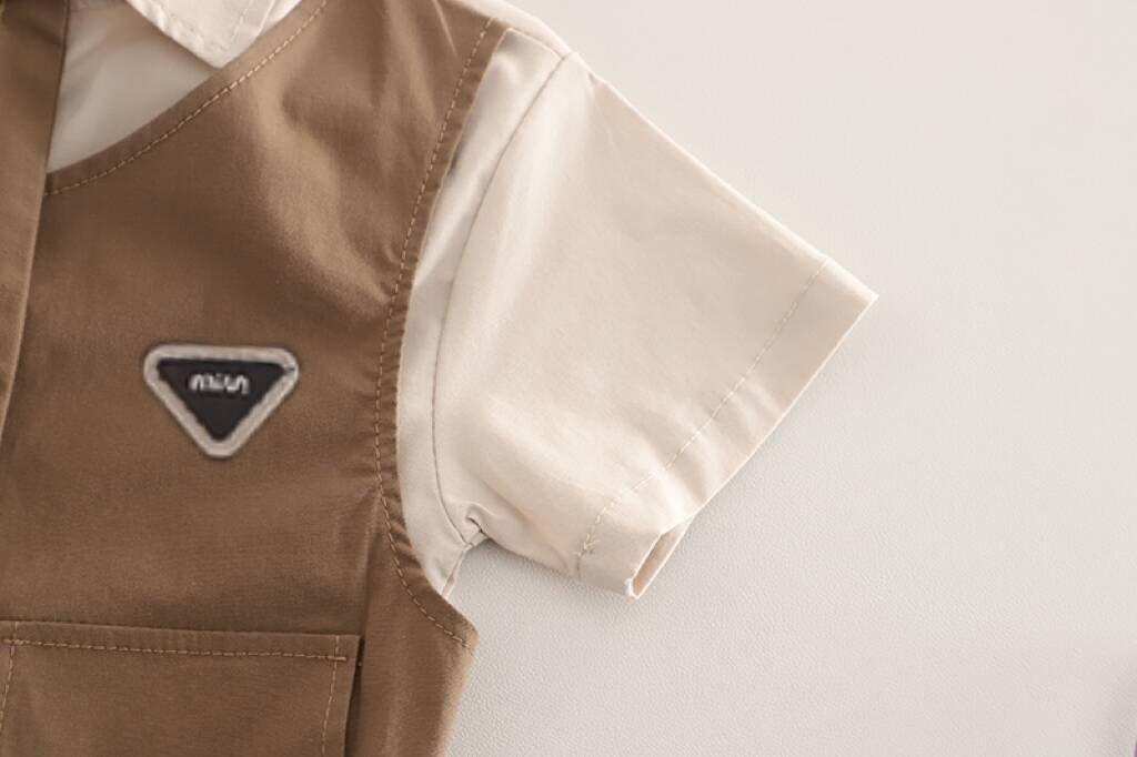 2025 새로운 아동 의류 대학 스타일 가짜 투피스 양복 여름 어린이 유행 반팔 셔츠 소년 바지 반바지스토어 가기
