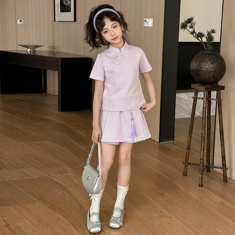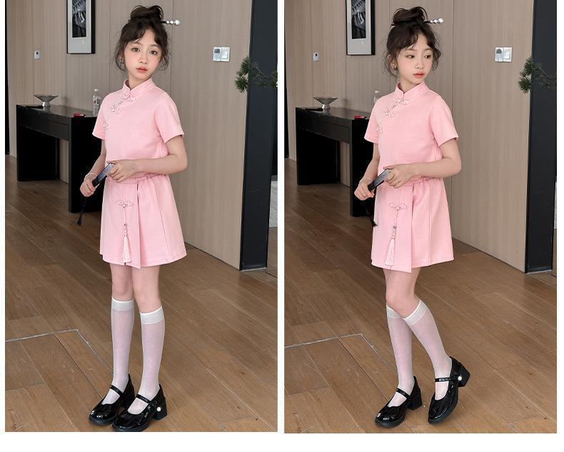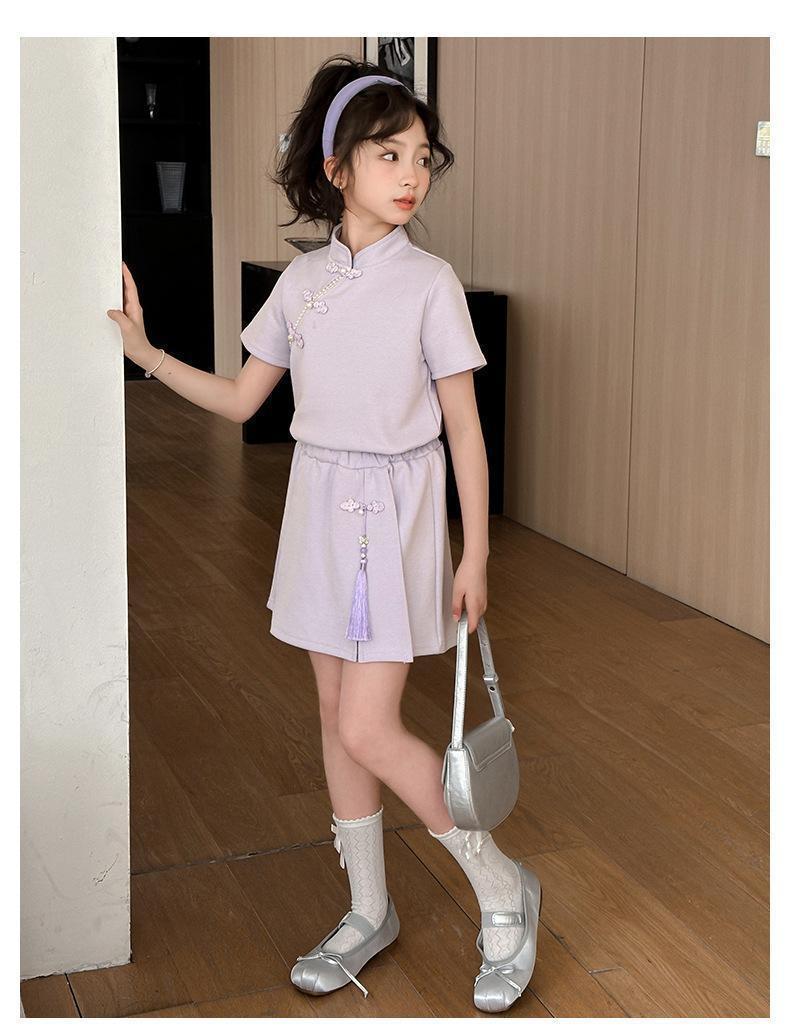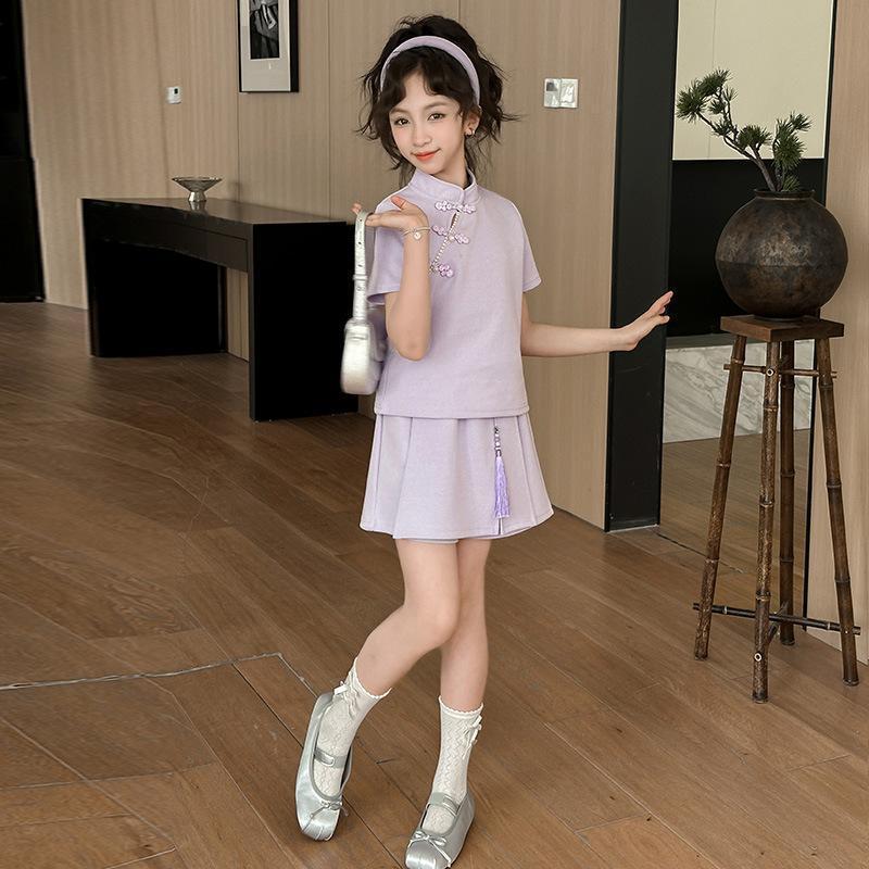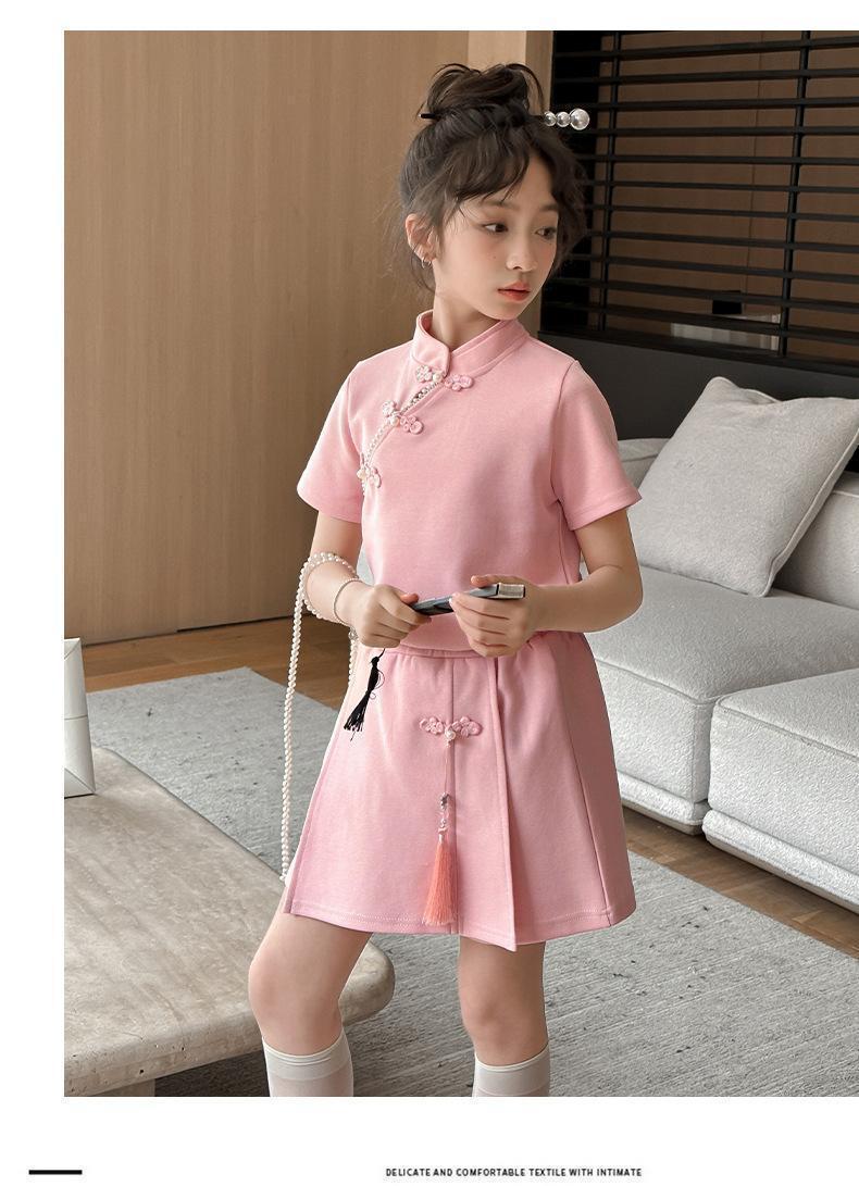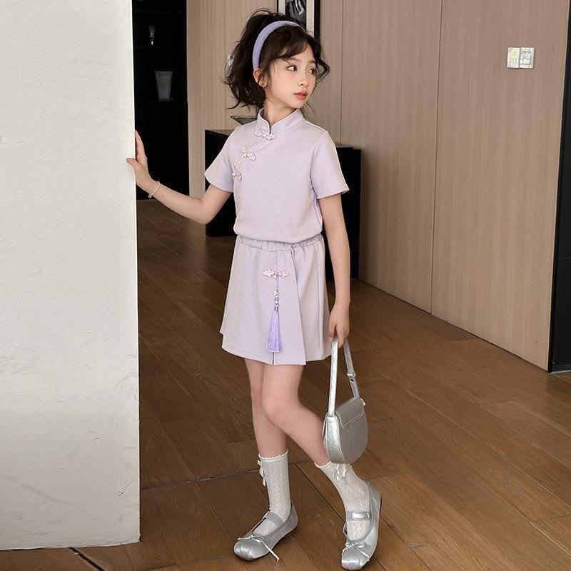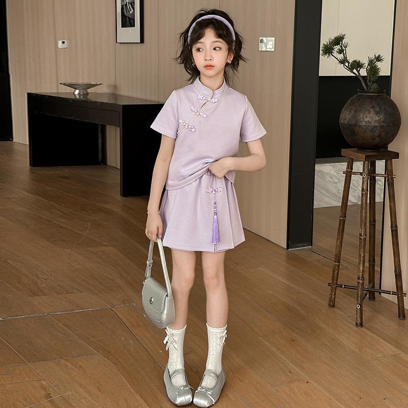 소녀 중국 스타일 캐주얼 스커트 세트 빅 키즈 여름 새로운 서양식 버클 반팔 탑 스커트 투피스 세트스토어 가기