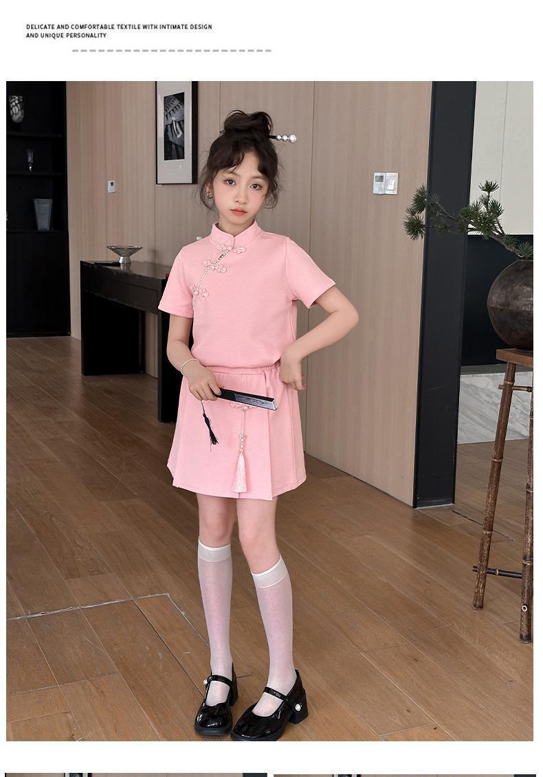 소녀 중국 스타일 캐주얼 스커트 세트 빅 키즈 여름 새로운 서양식 버클 반팔 탑 스커트 투피스 세트