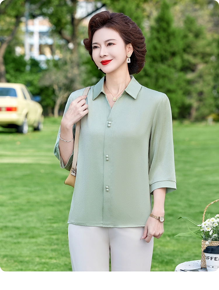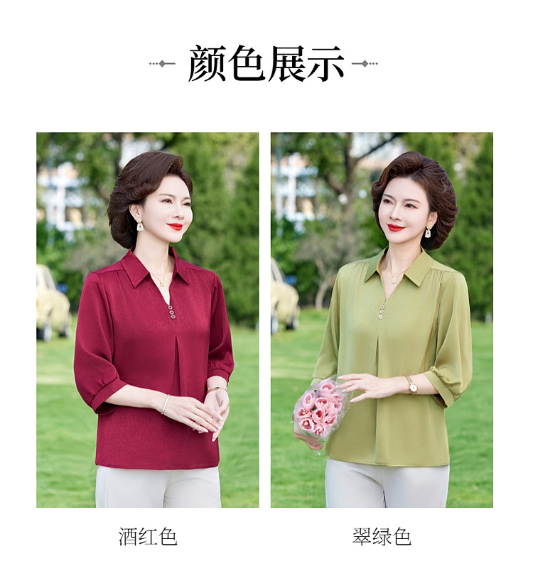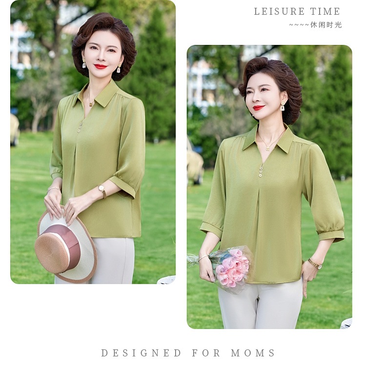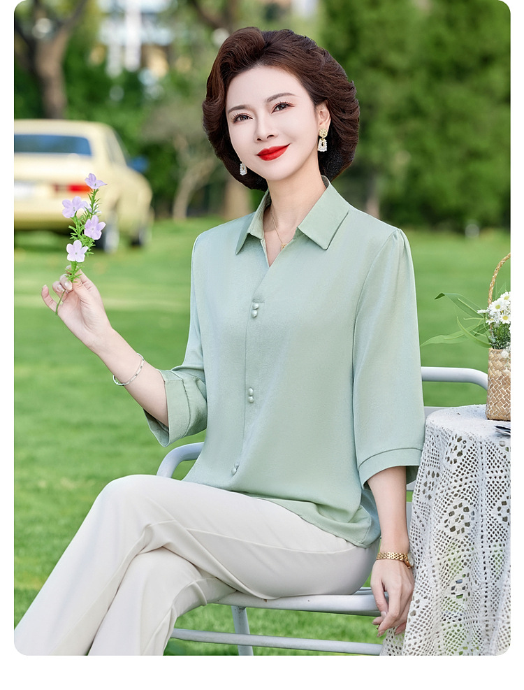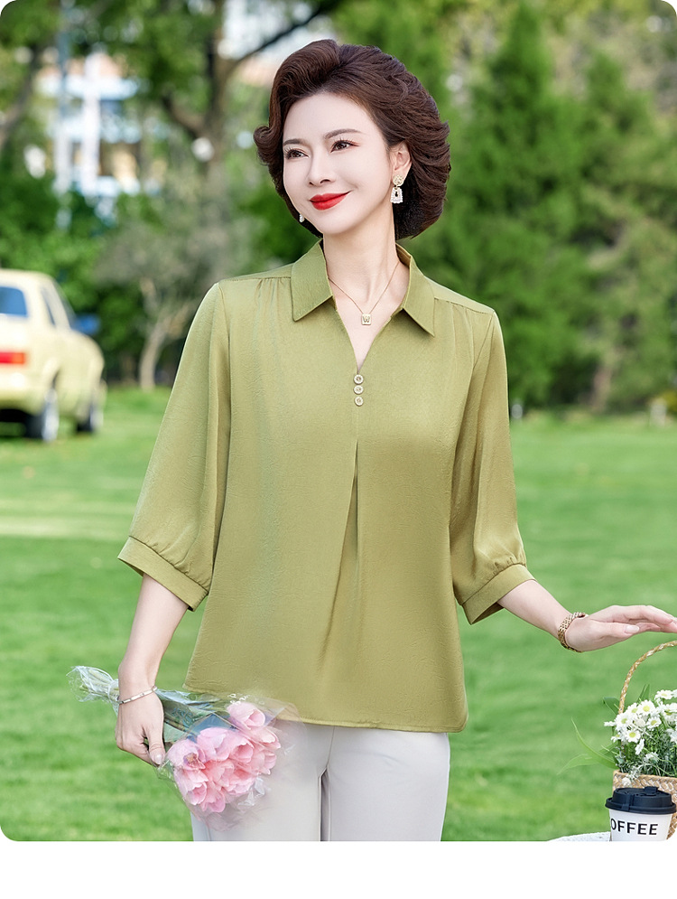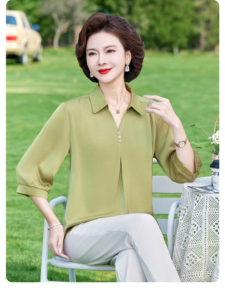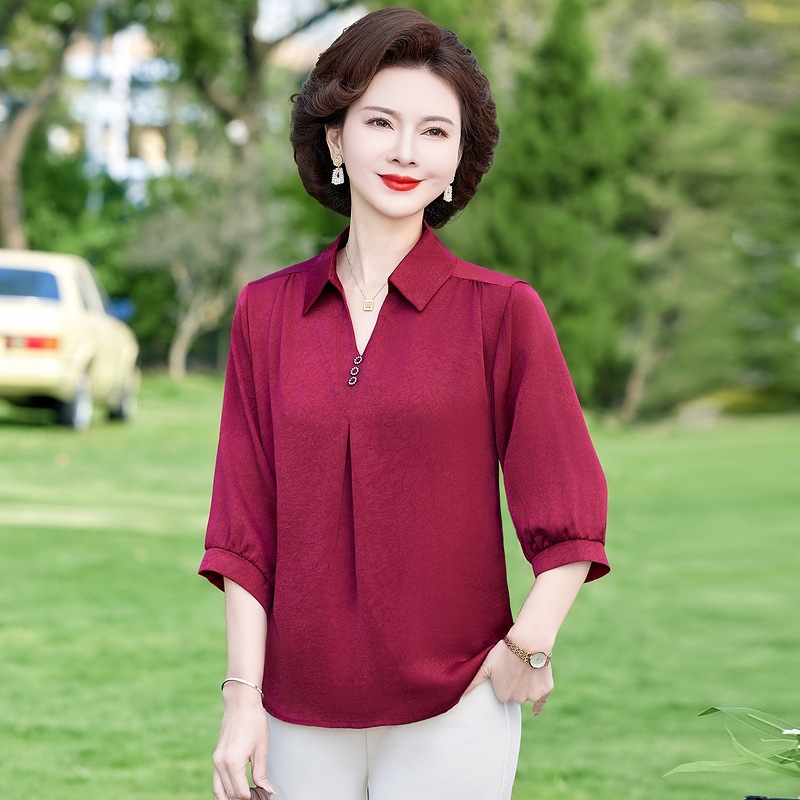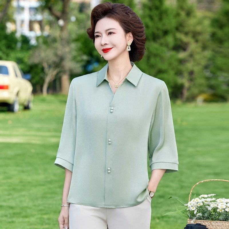 어머니의 반소매 셔츠 최고의 여성 여름 2025 새로운 아이스 실크 랩 캐주얼 느슨한 나이 감소 중년 여성 셔츠