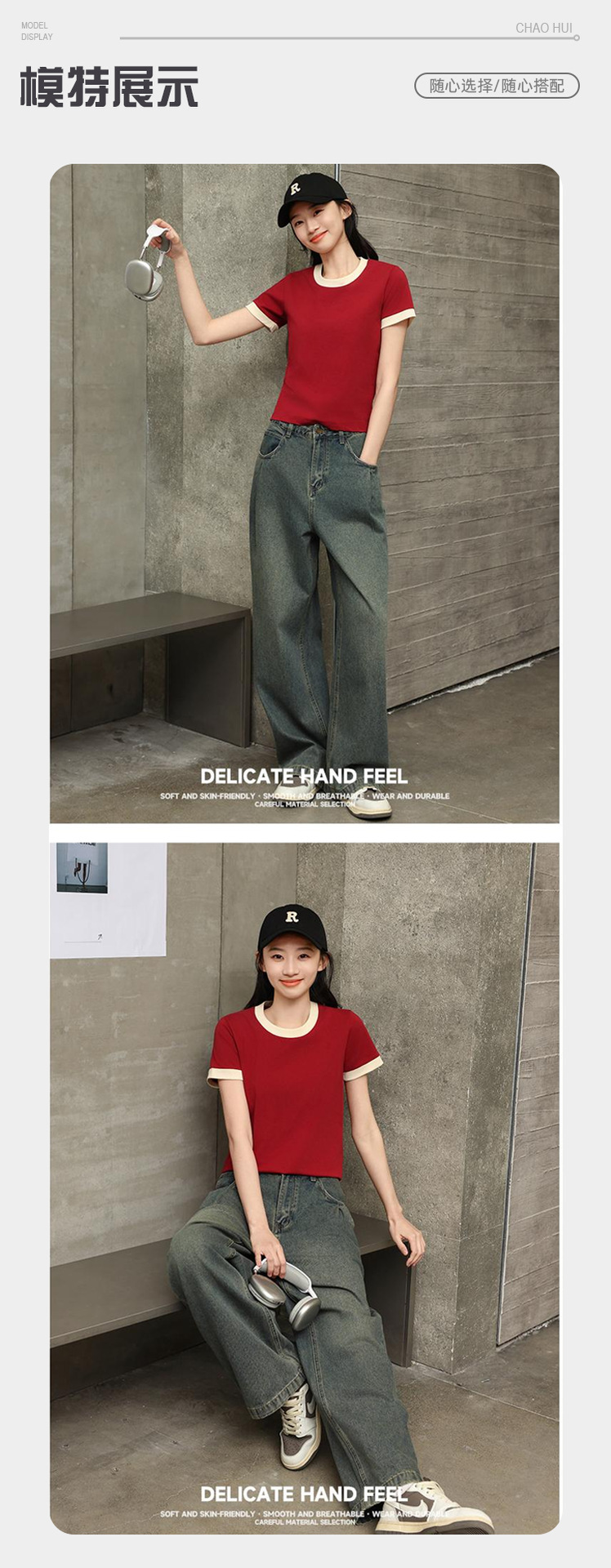 어깨 반팔 티셔츠 여성 230g Solona 컬러 매칭 크루 넥 티셔츠 스파이스 소녀 스타일 슬림 핏 슬림 짧은 하이 엔드 탑 여성스토어 가기
