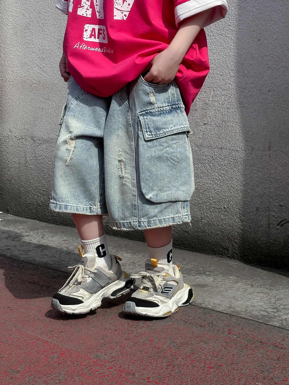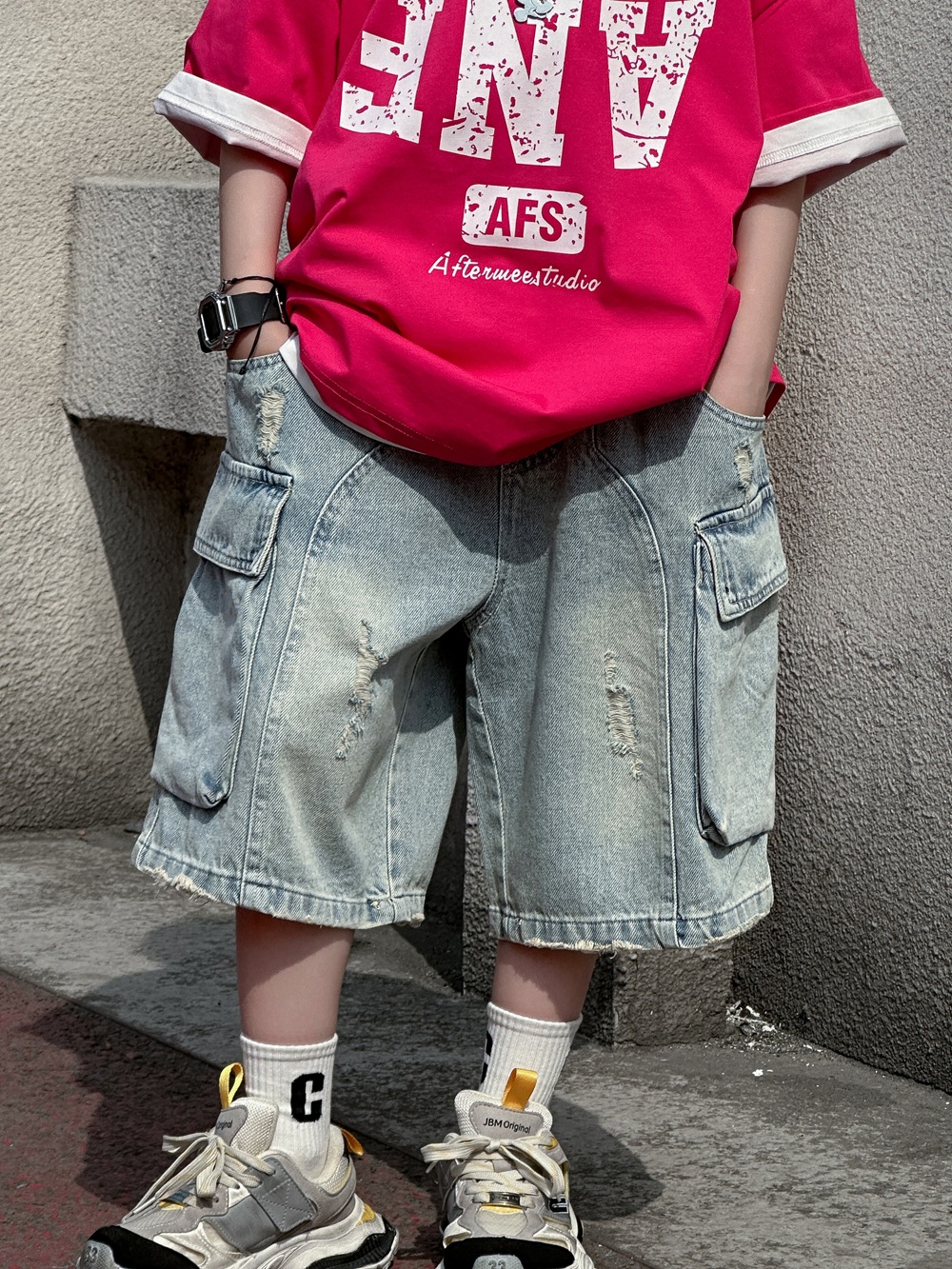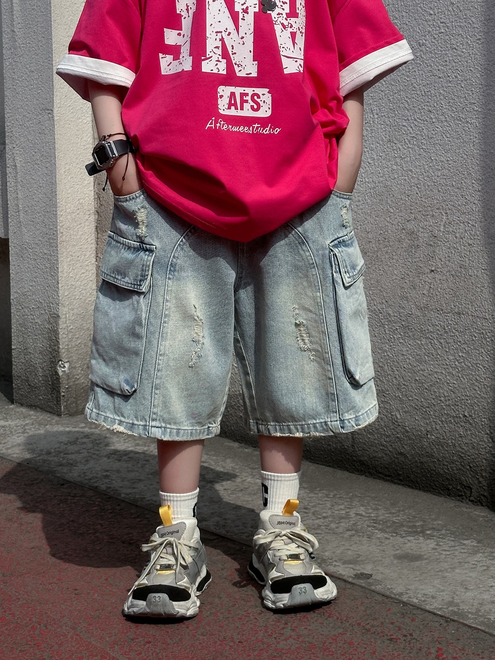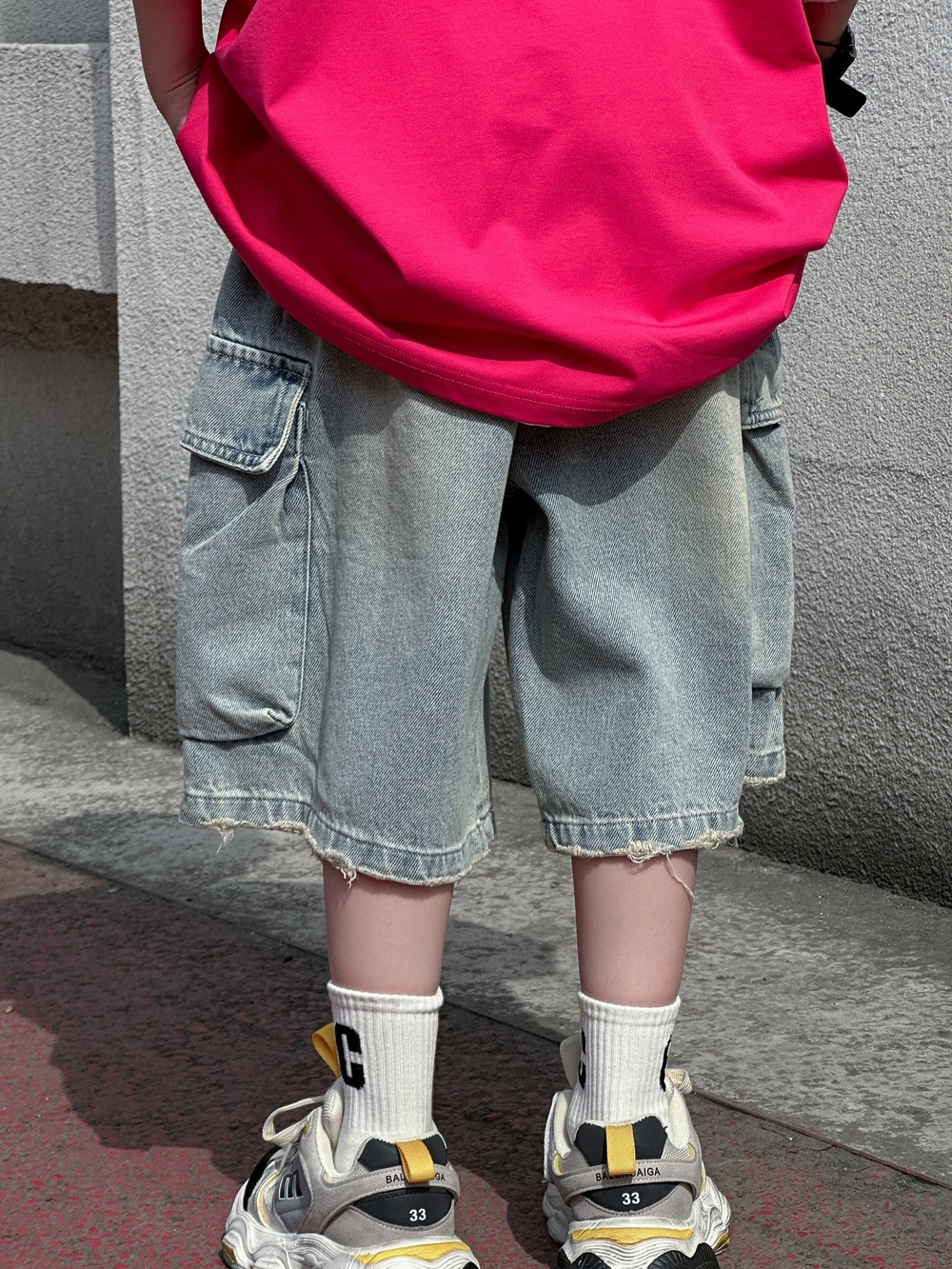 Xiner 2025 여름 새로운 어린이 고양이 스크래치 구멍 작업복 데님 바지 레트로 소년의 다섯 번째 바지 유행 반바지