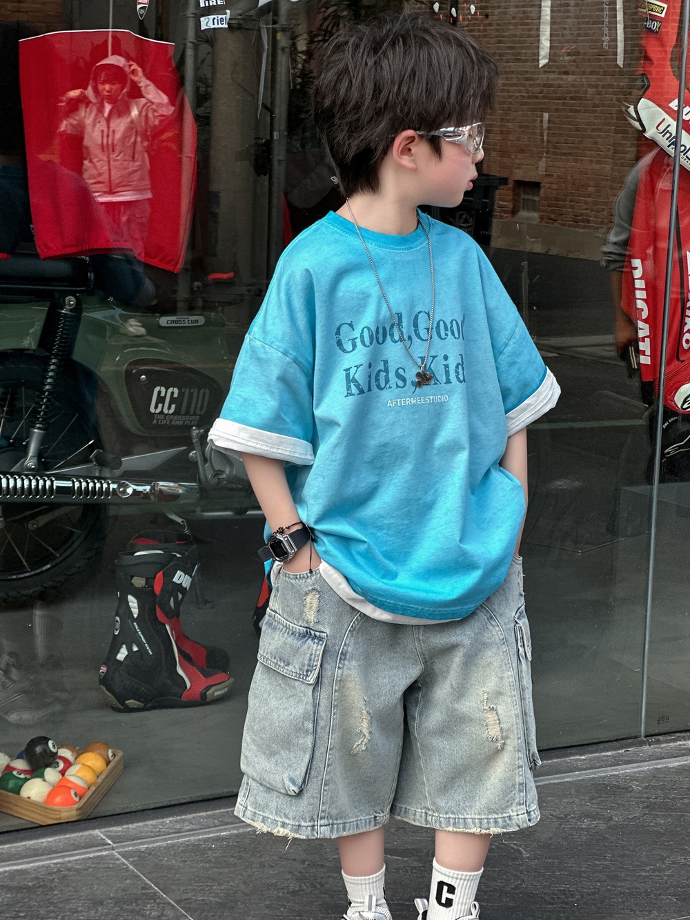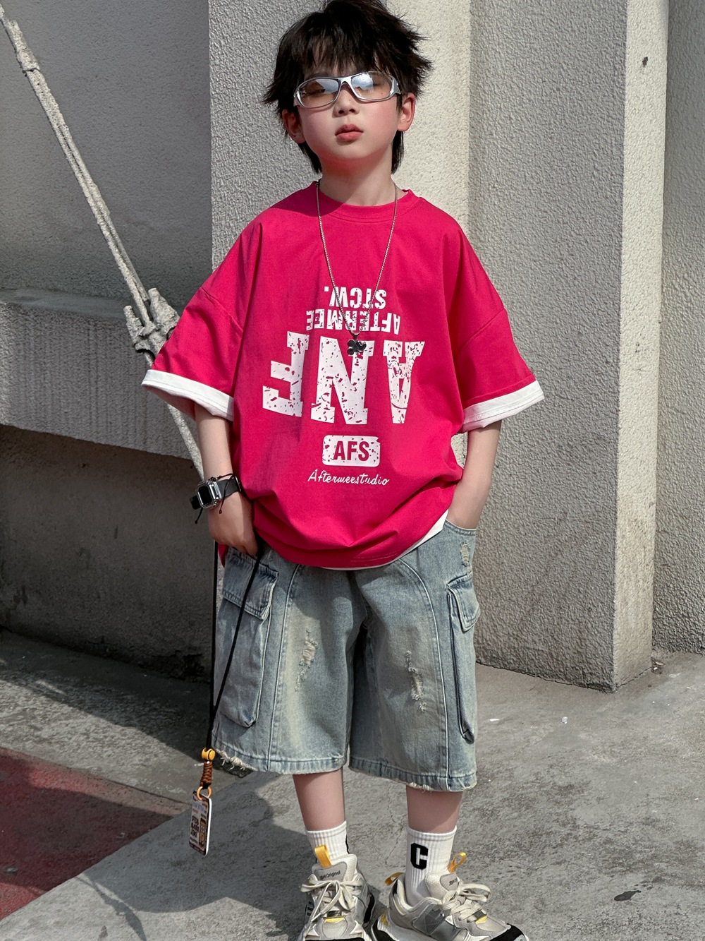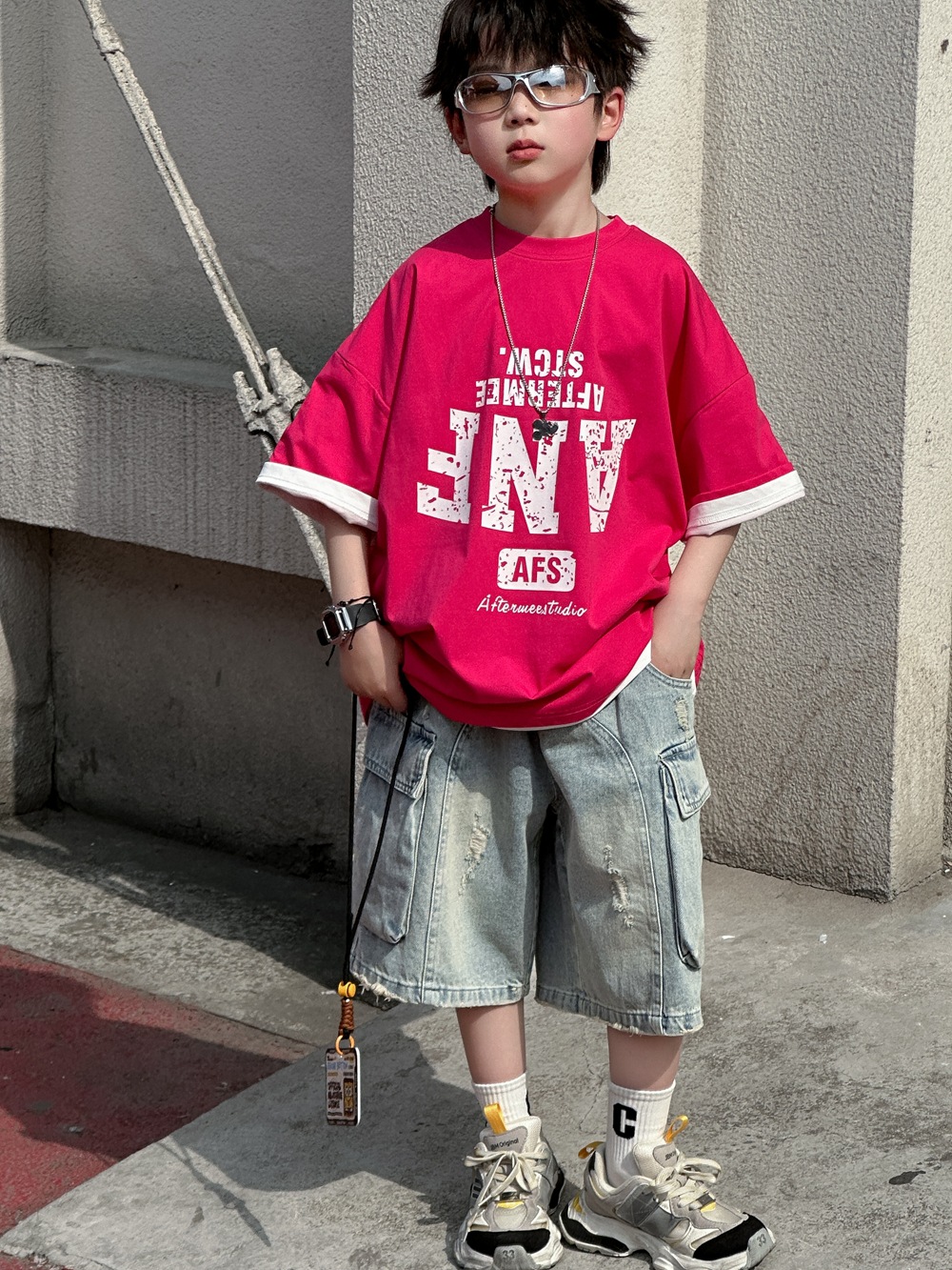 Xiner 2025 여름 새로운 어린이 고양이 스크래치 구멍 작업복 데님 바지 레트로 소년의 다섯 번째 바지 유행 반바지