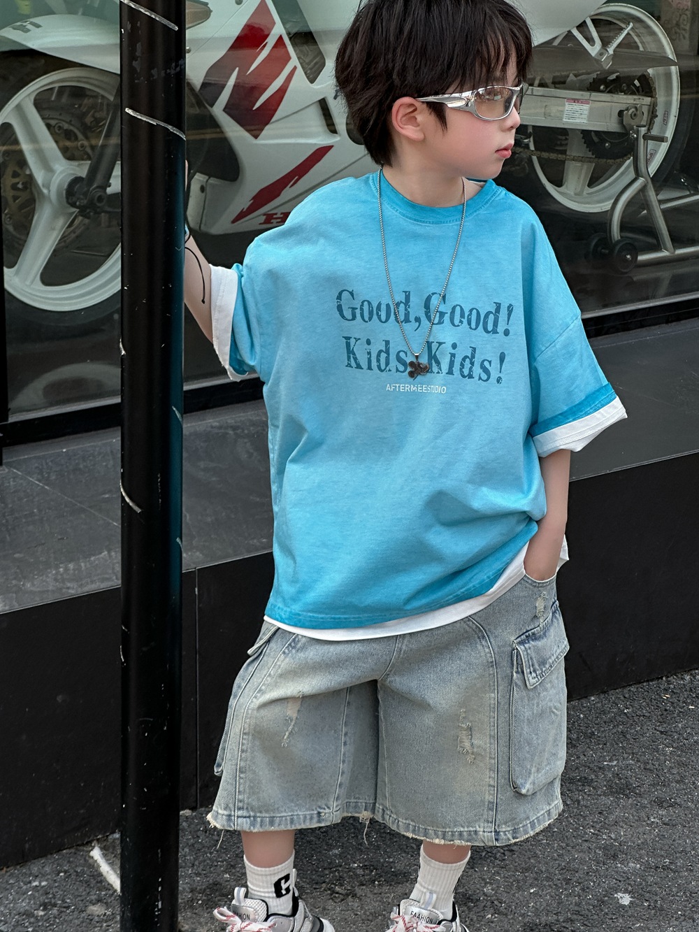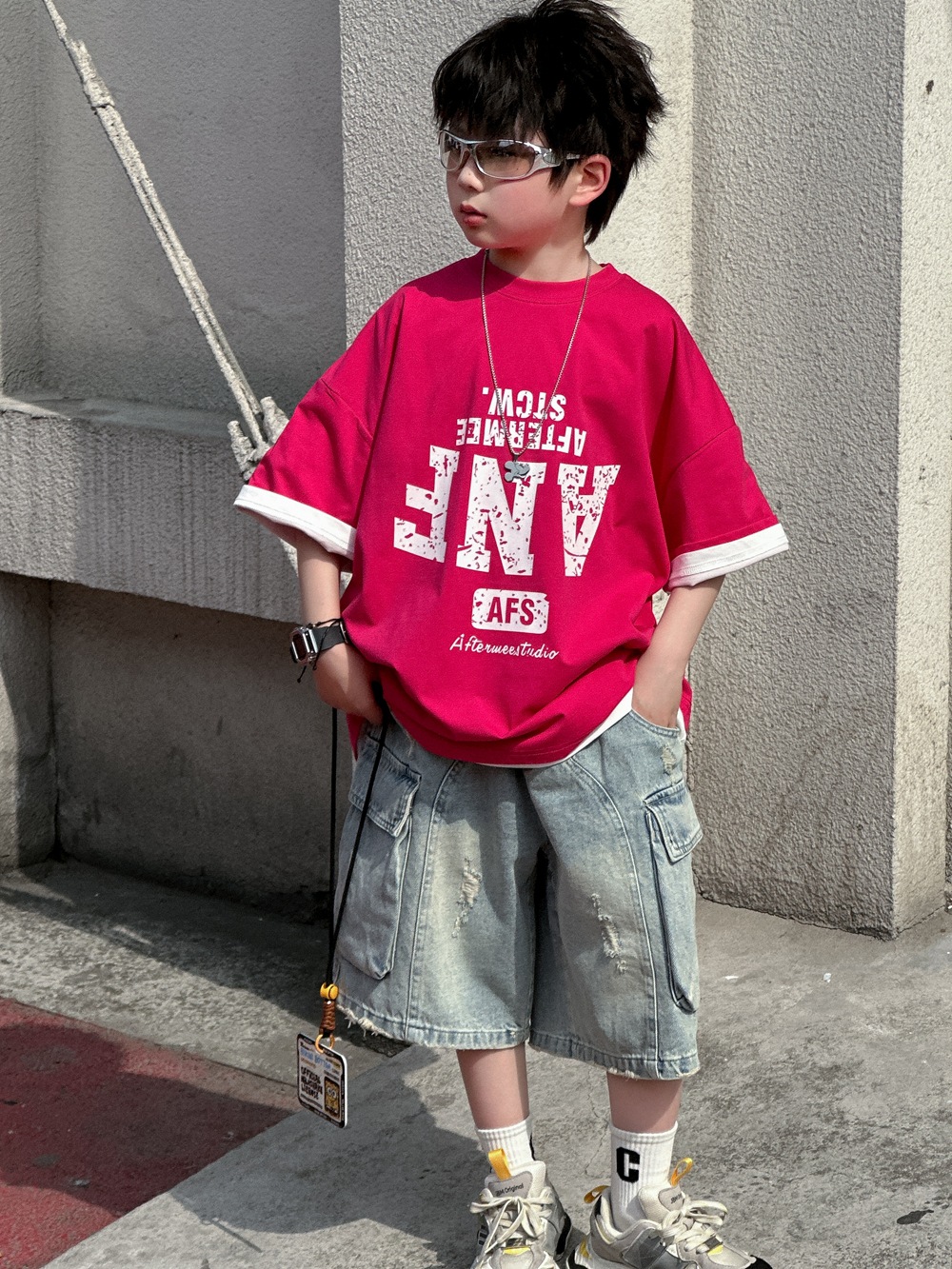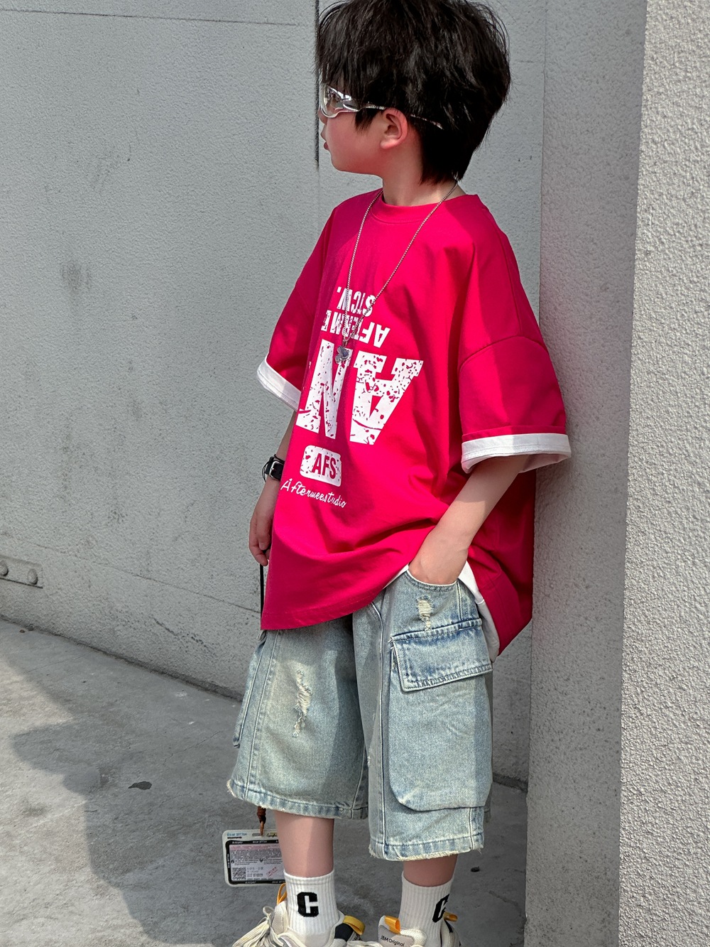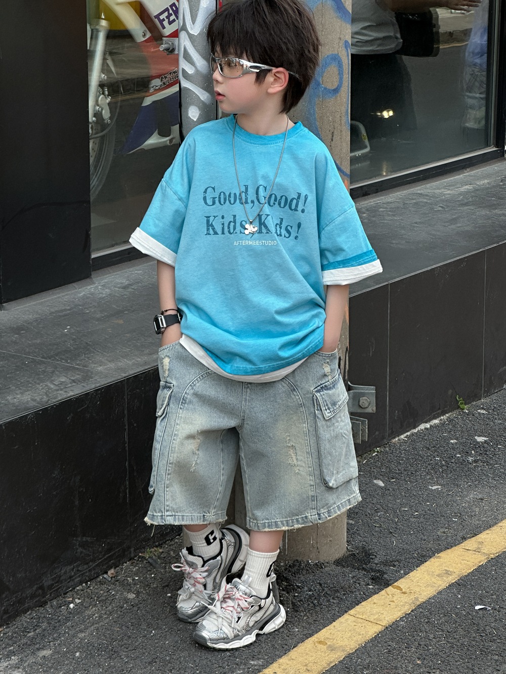 Xiner 2025 여름 새로운 어린이 고양이 스크래치 구멍 작업복 데님 바지 레트로 소년의 다섯 번째 바지 유행 반바지