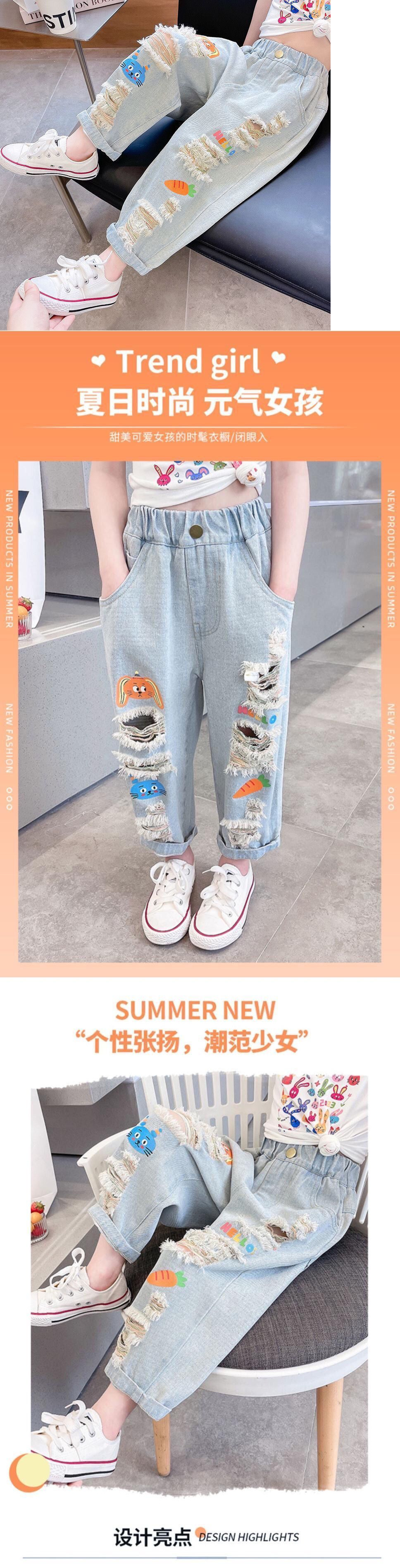 소녀 청바지 여름 2023 새로운 어린이 낙서 구멍 캐주얼 바지 얇은 남자와 여자의 아기 여름 바지스토어 가기