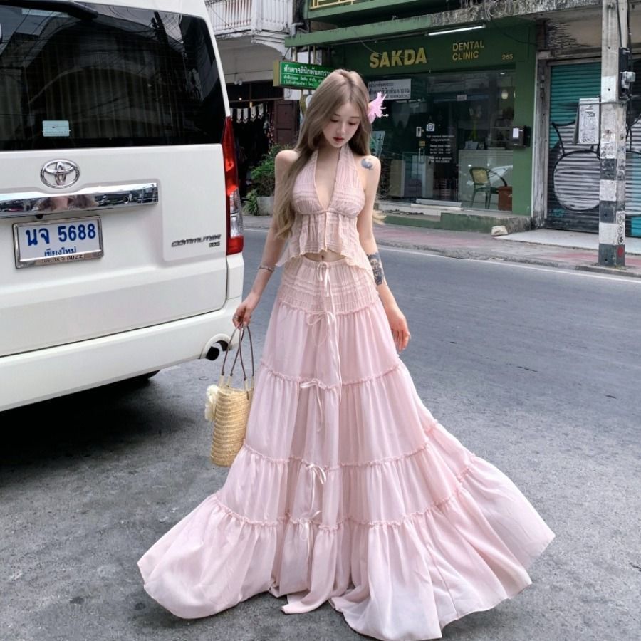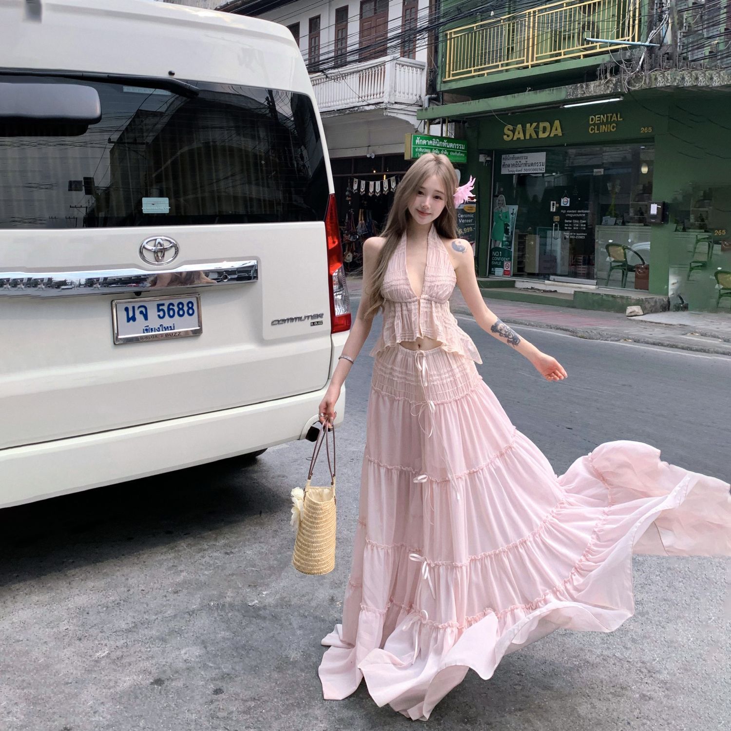 태국 해변 휴가복, 순수하고 섹시한 등이 없는 홀터넥 시스루 하프 길이 3피스 스플릿 수영복 여성용