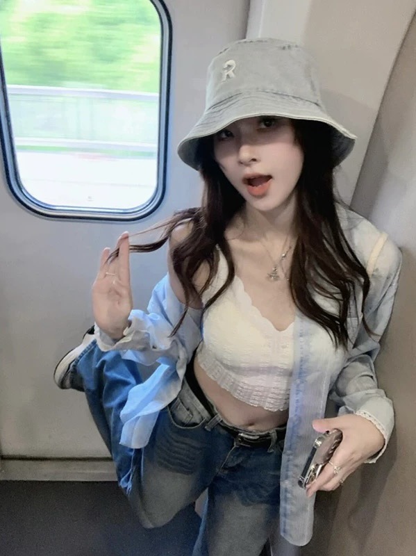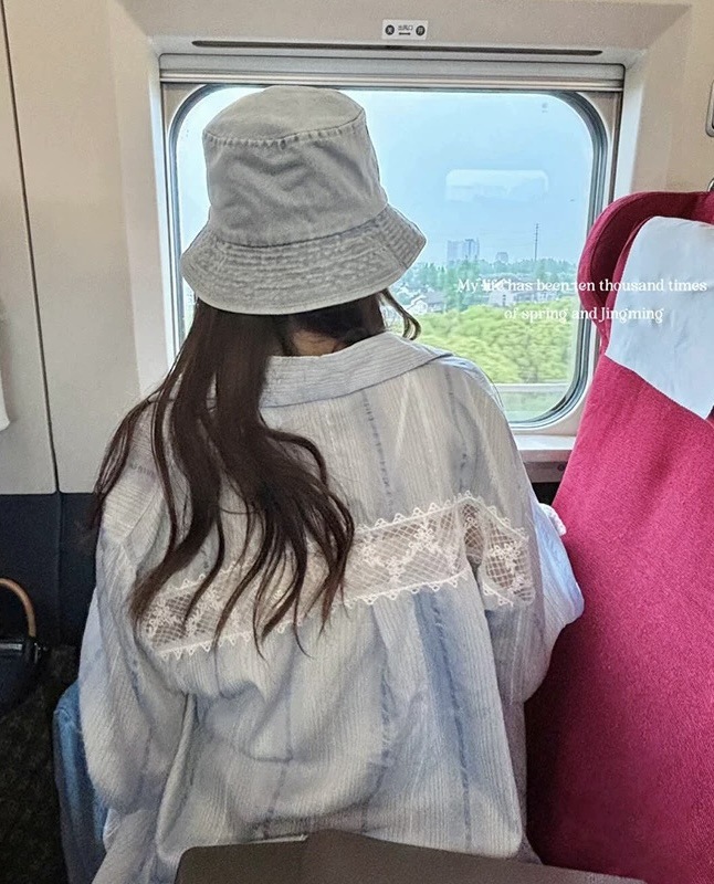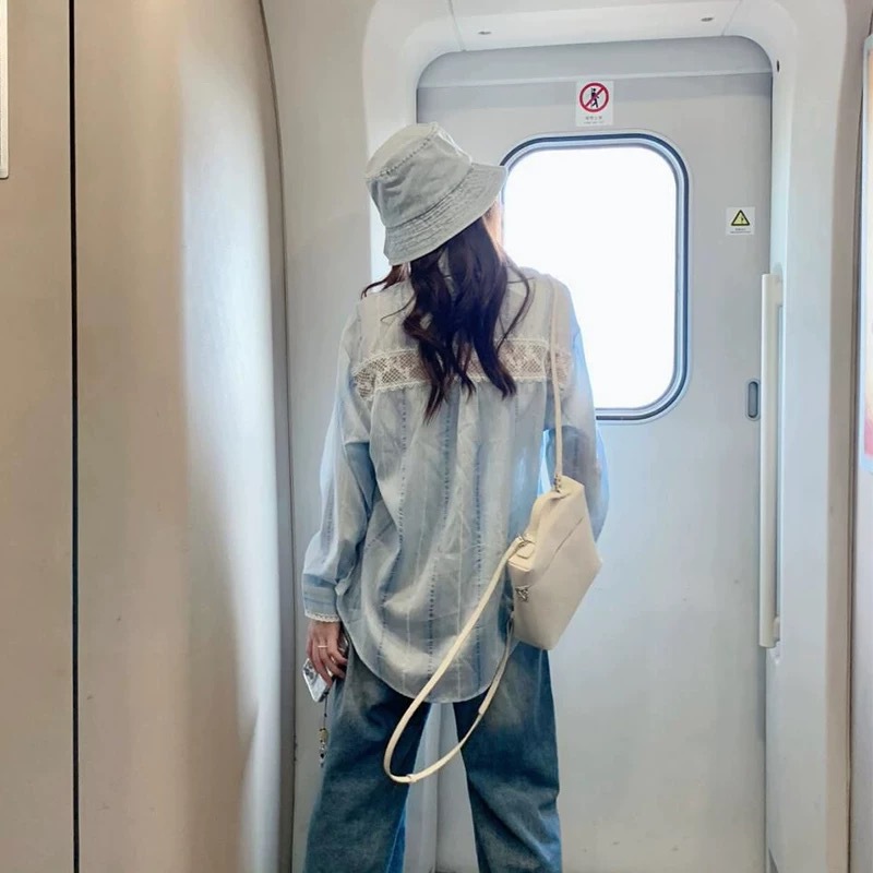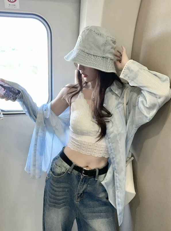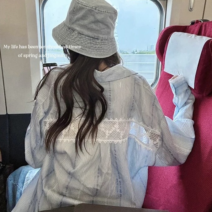 디자인 센스 레이스 블루 스트라이프 셔츠 여성의 봄과 여름 새로운 게으른 느슨한 긴팔 태양 보호 셔츠 탑스토어 가기