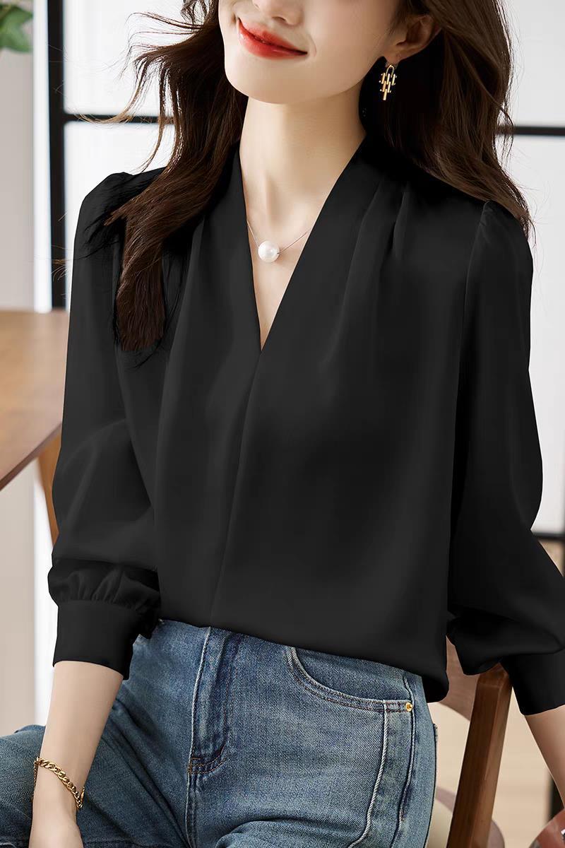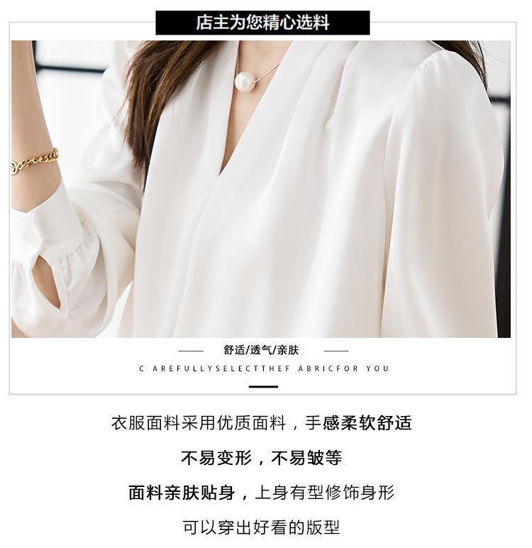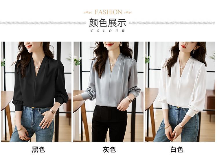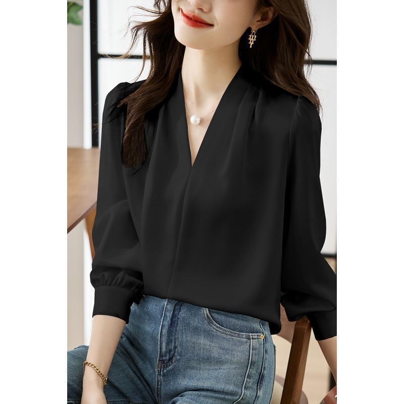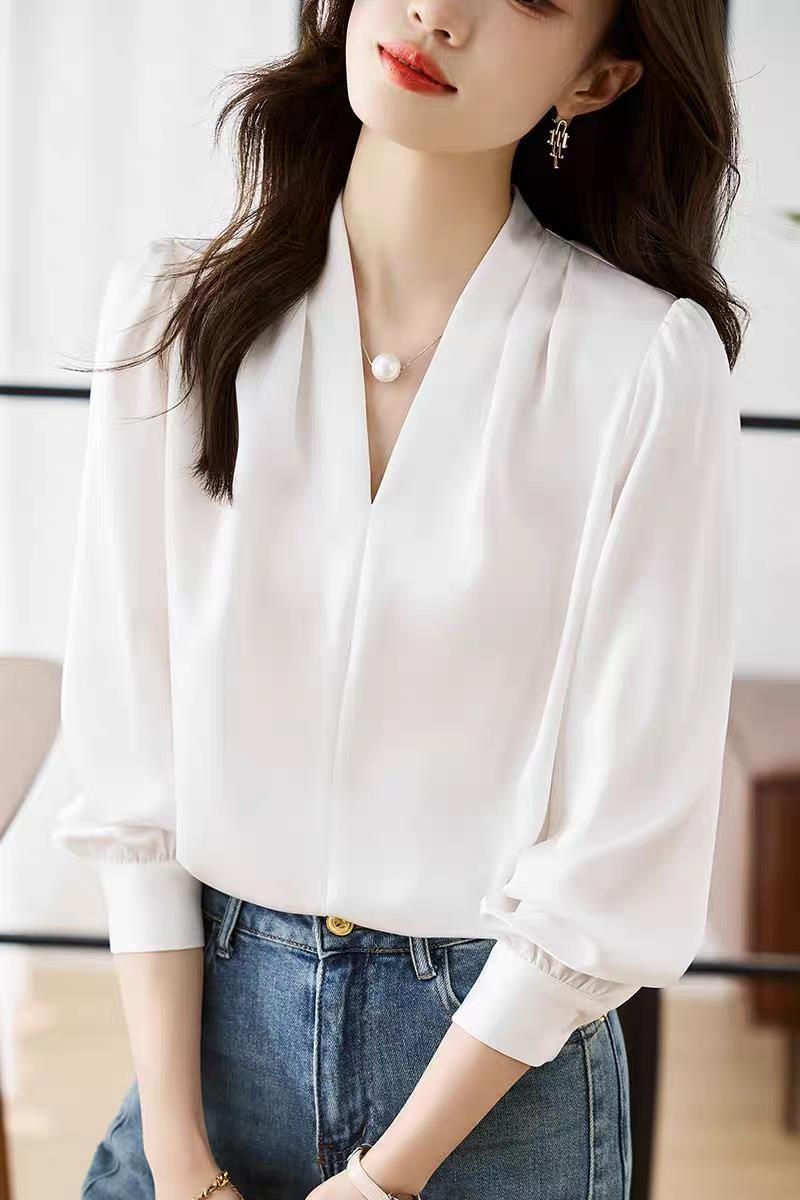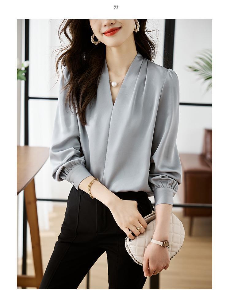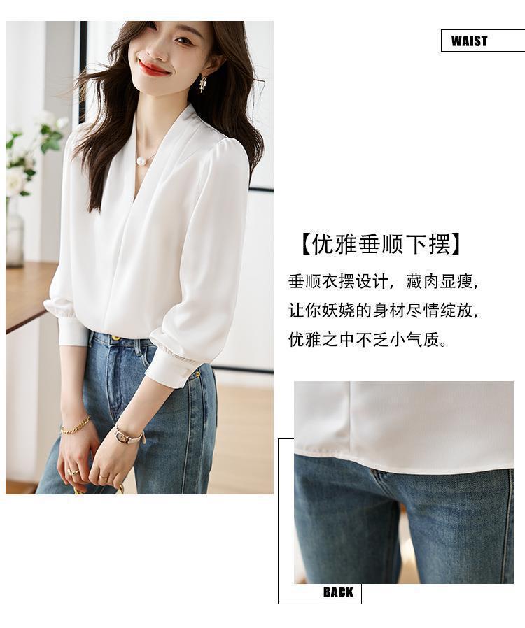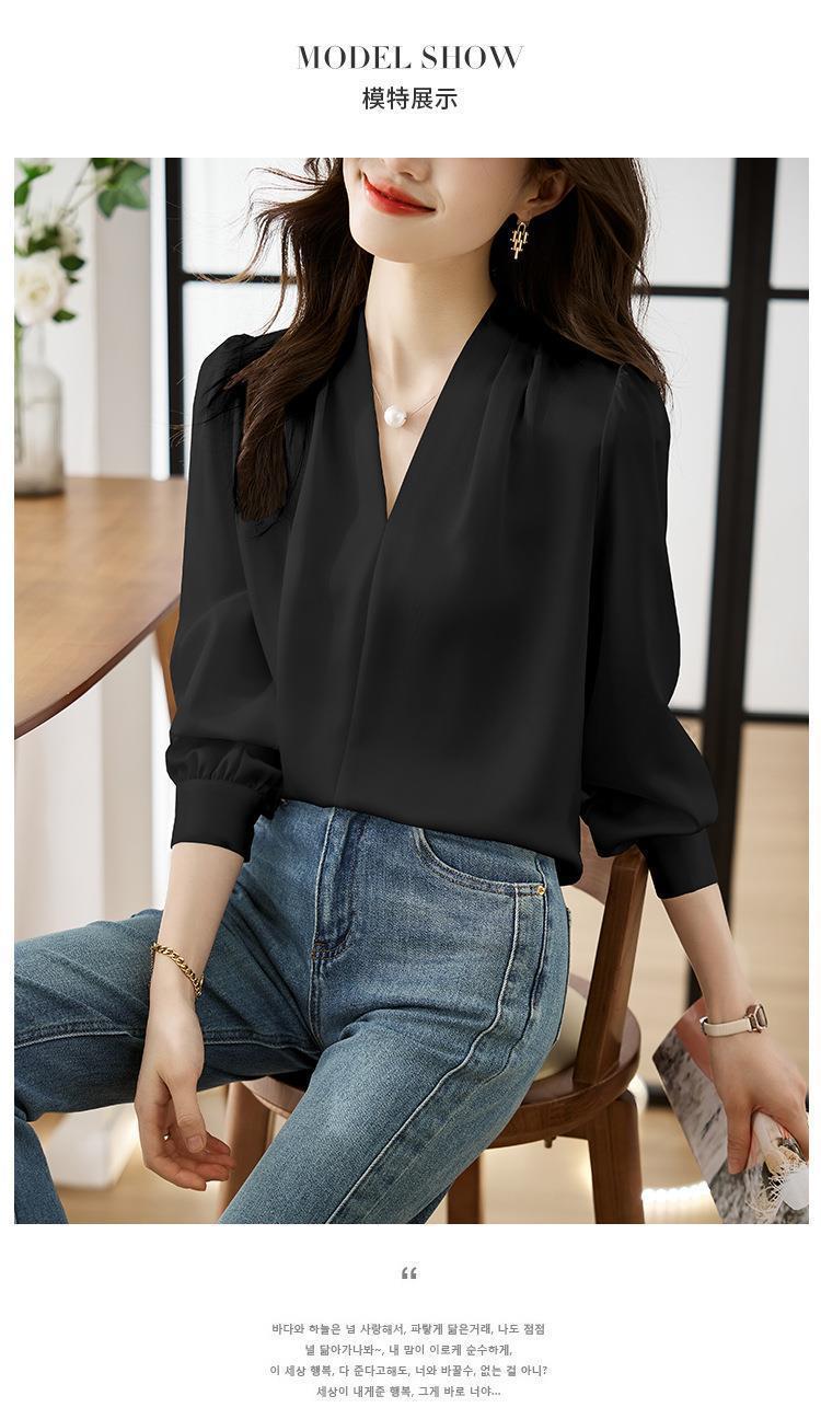 디자인감이 심플한 여성용 봄, 가을 셔츠, 우아한 브이넥, 가볍고 성숙한 스타일, 출퇴근용 쉬폰 셔츠, 프렌치 스타일의 부드러움스토어 가기