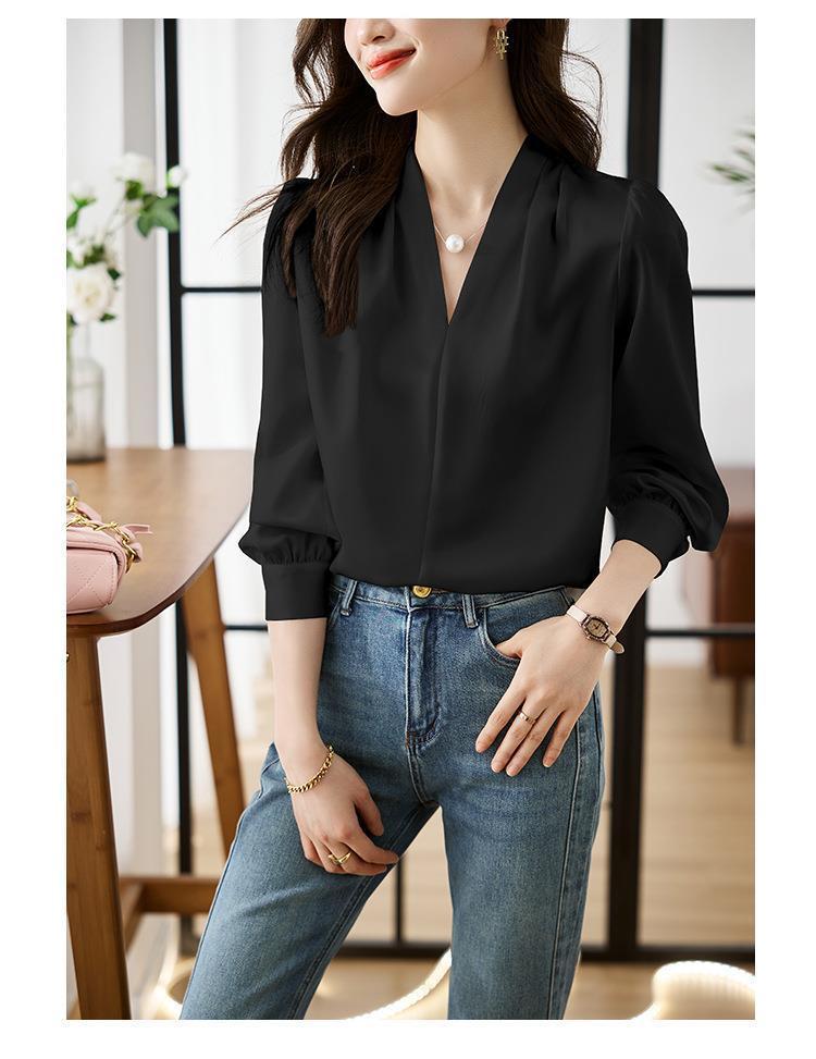 디자인감이 심플한 여성용 봄, 가을 셔츠, 우아한 브이넥, 가볍고 성숙한 스타일, 출퇴근용 쉬폰 셔츠, 프렌치 스타일의 부드러움