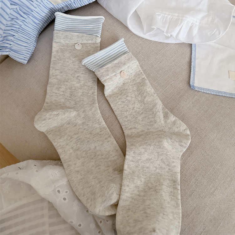 한국 스타일의 흰색 파란색 얇은 양말 여성 튜브 양말 면봉 fritillary 천 표준 유행 양말 턴 오버 올 매치 여성 양말스토어 가기