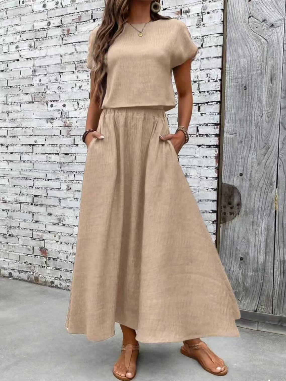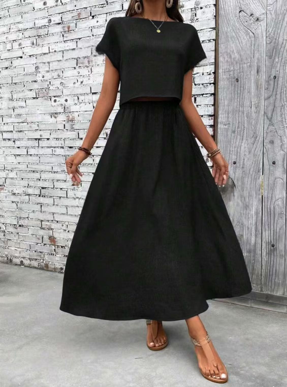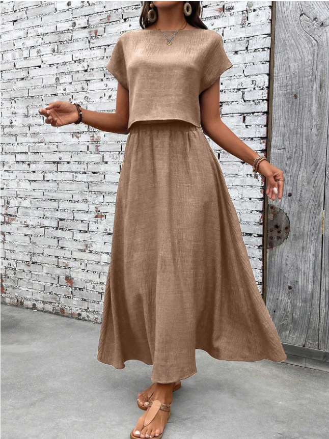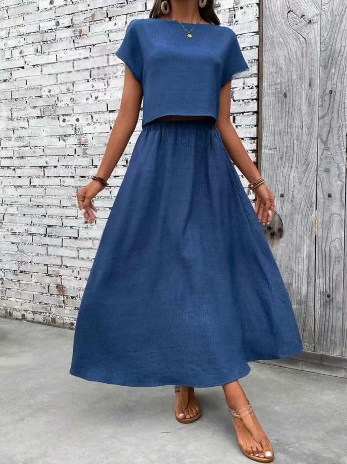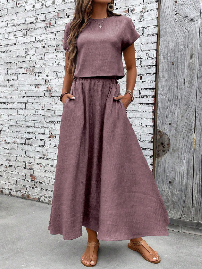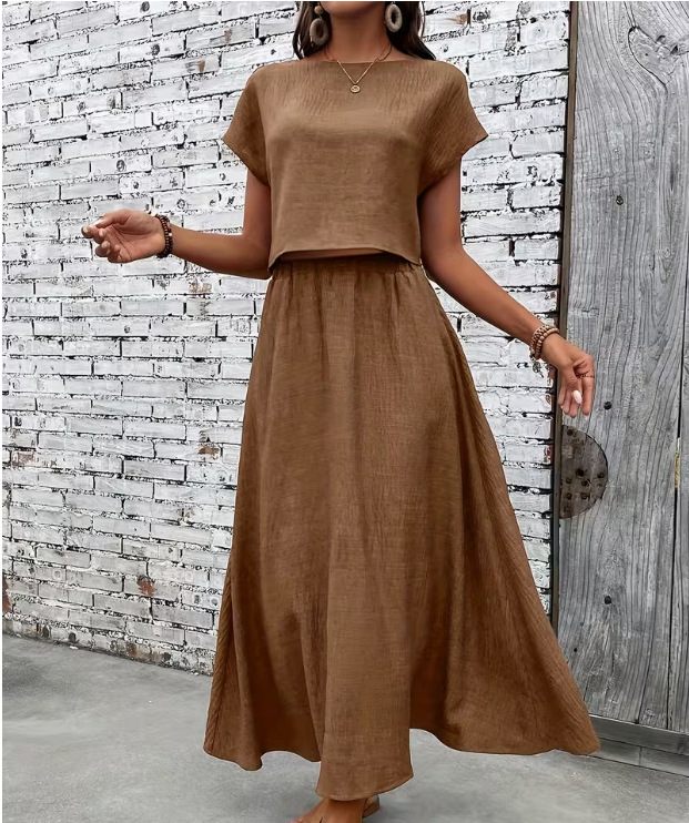 Spot Cross-border Amazon 유럽 및 미국 AliExpress 2피스 여성용 솔리드 컬러 반팔 탑 및 캐주얼 A라인 스커트 세트
