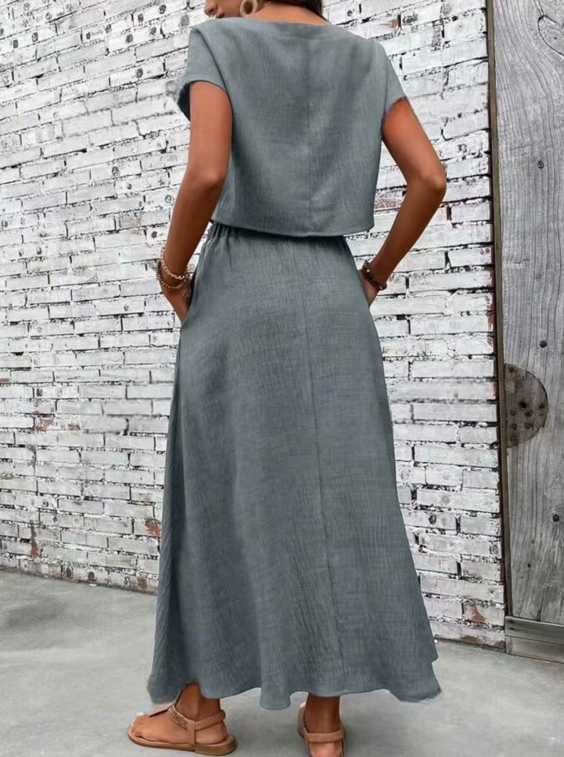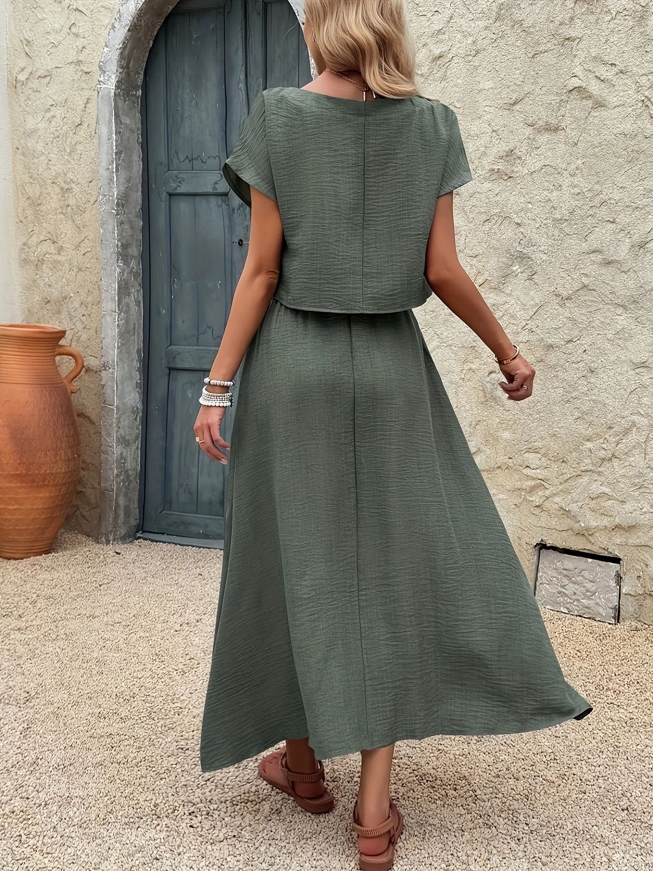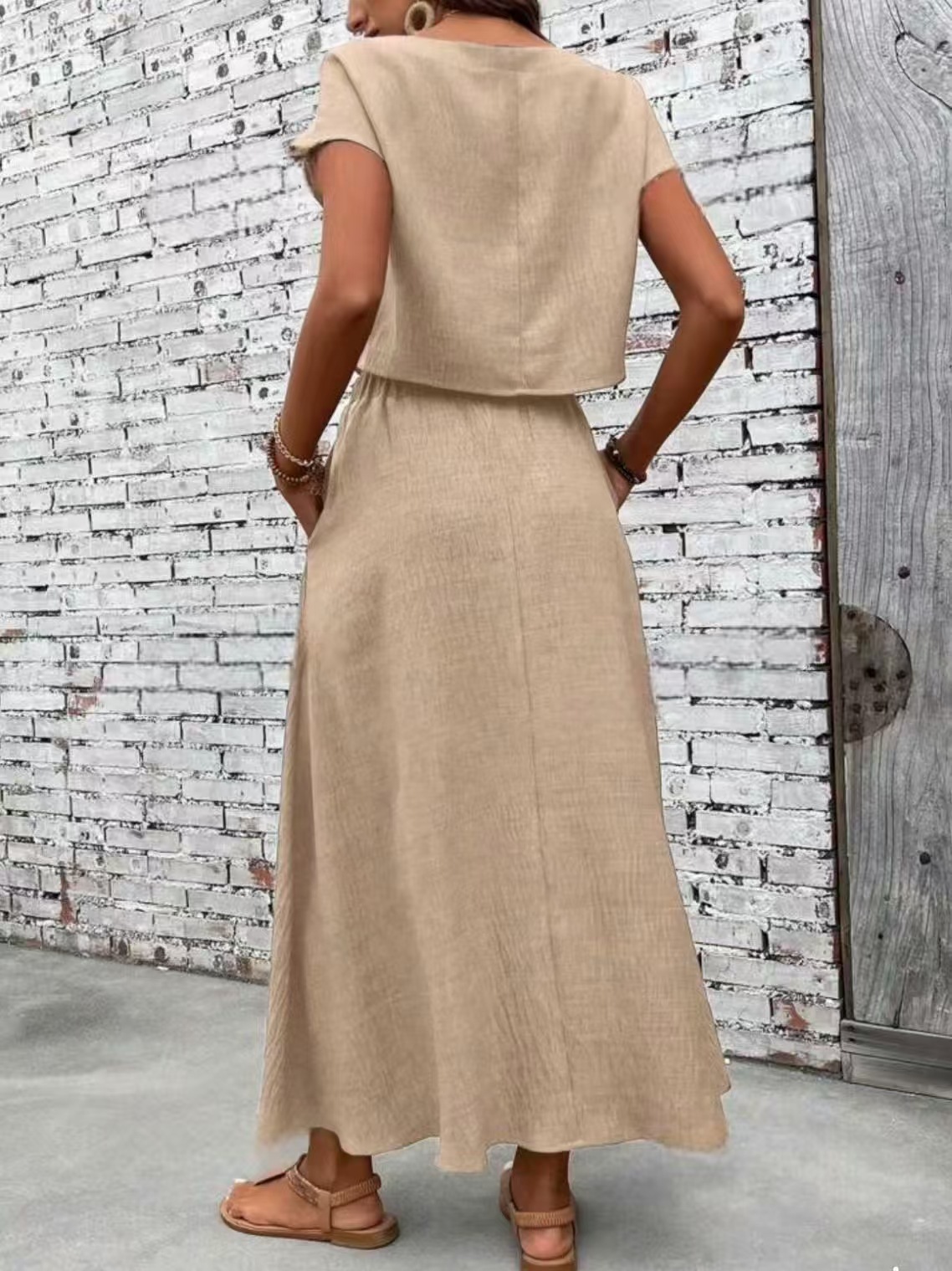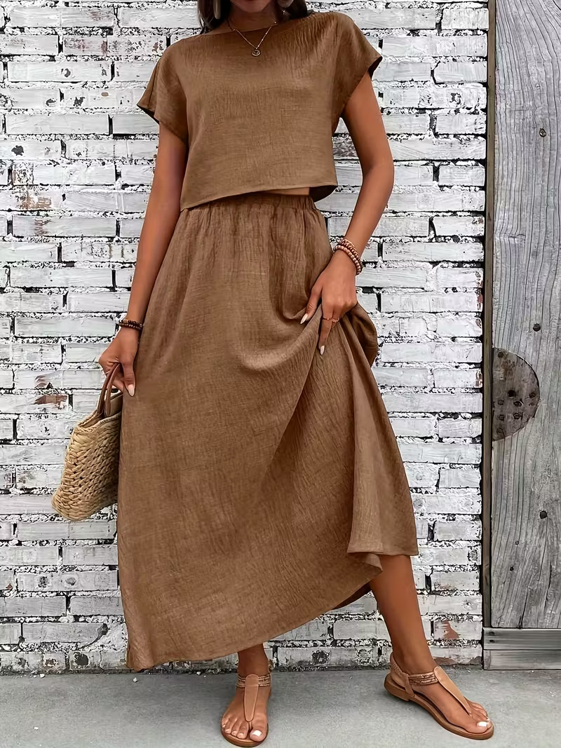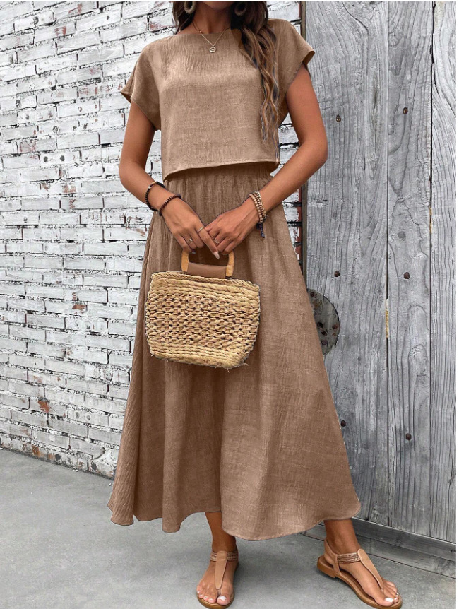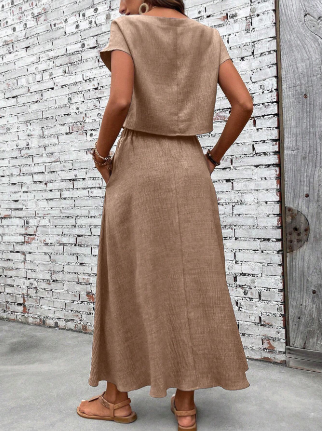 Spot Cross-border Amazon 유럽 및 미국 AliExpress 2피스 여성용 솔리드 컬러 반팔 탑 및 캐주얼 A라인 스커트 세트