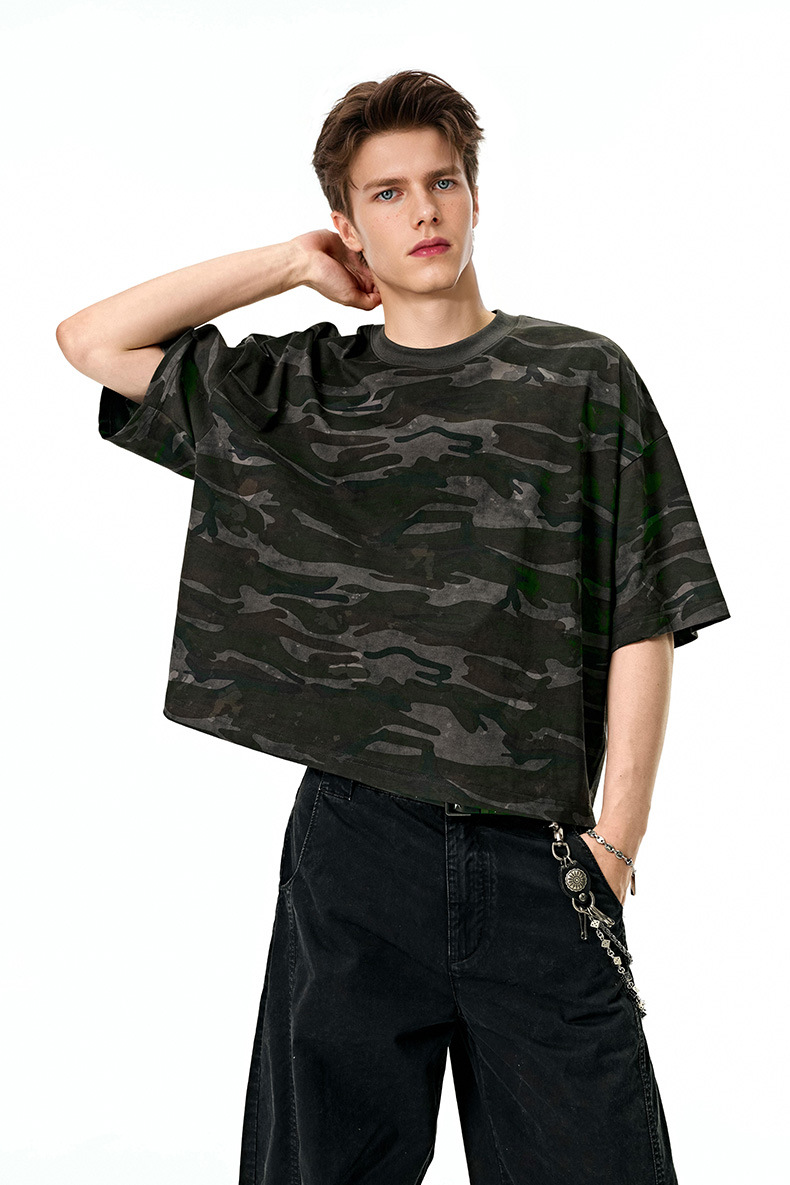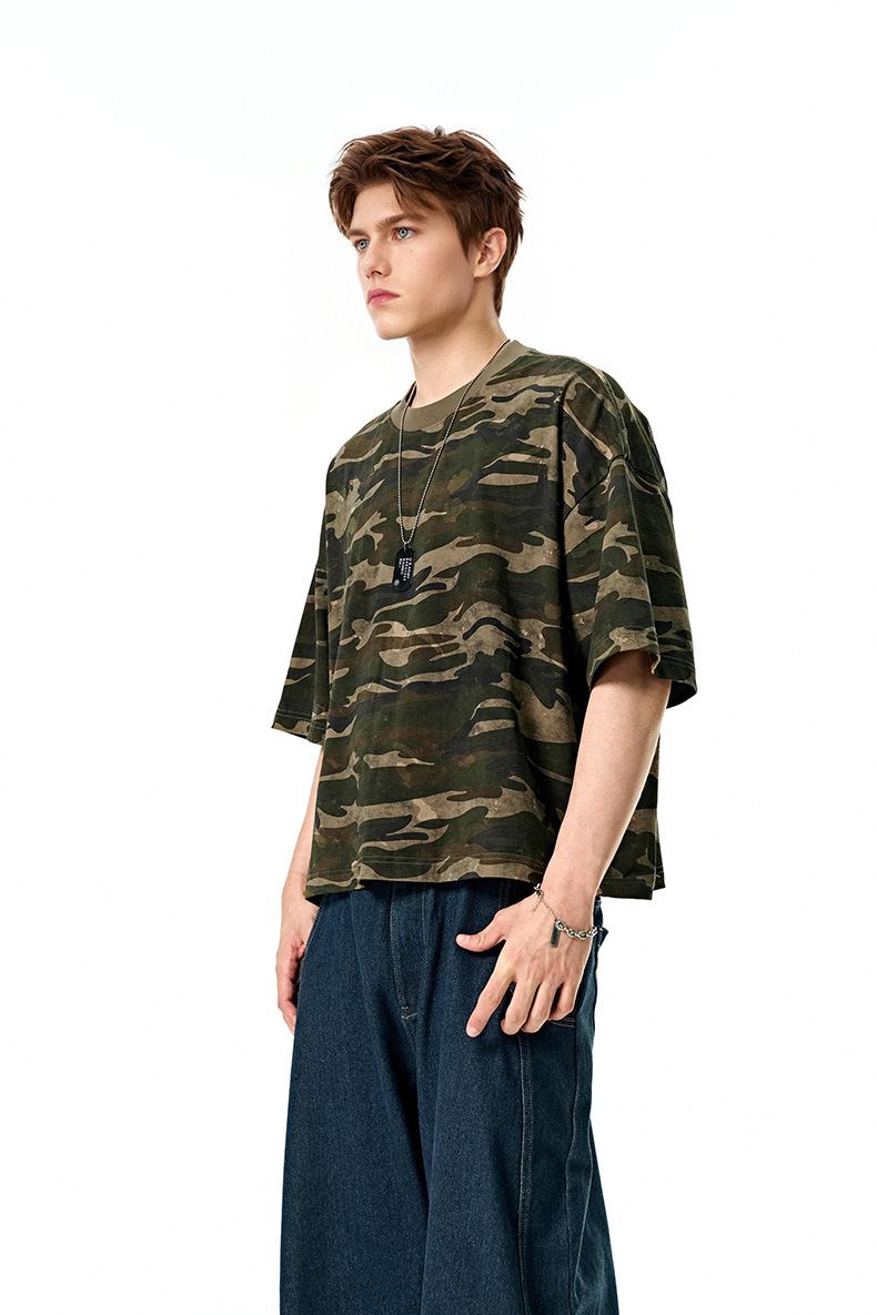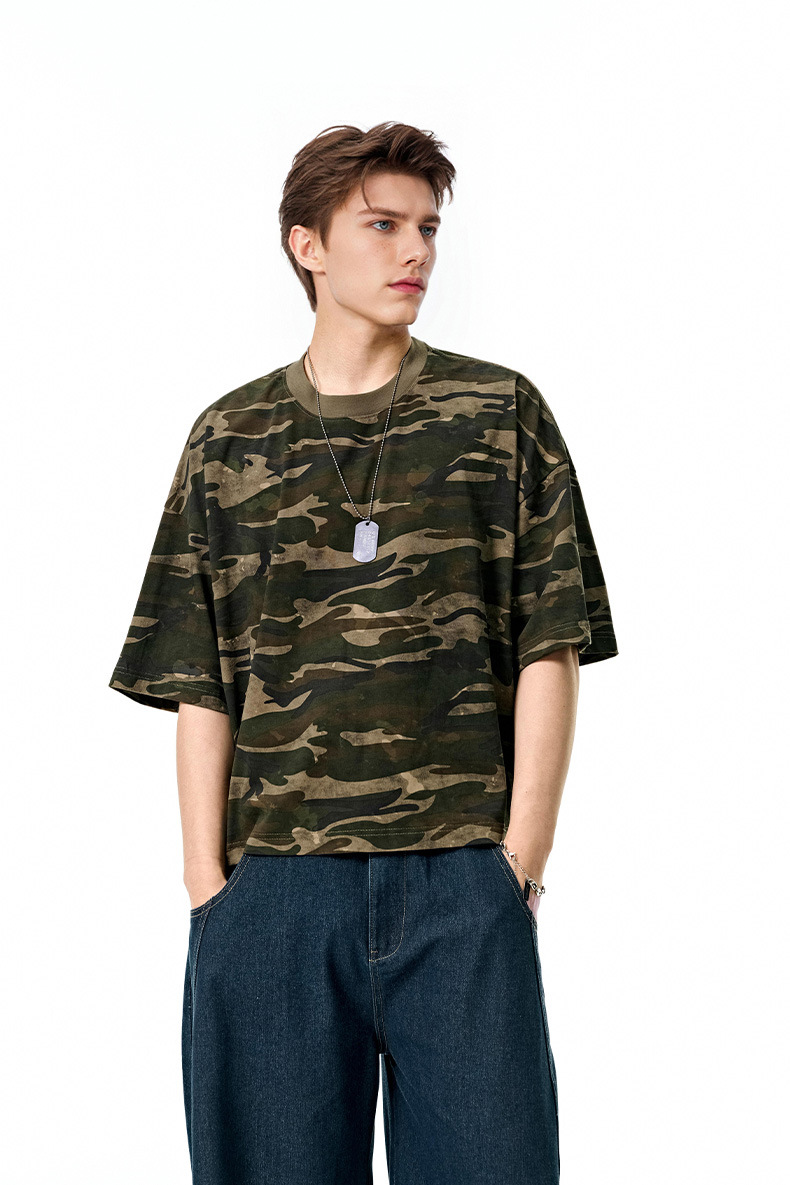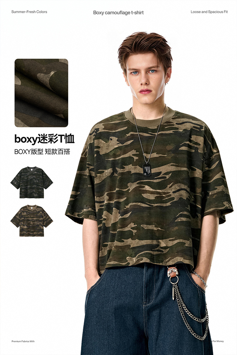 Jie Zhan 남성복 | 박스 위장 티셔츠 2025 봄/여름 새로운 조수 브랜드 아메리칸 스트리트 코튼 짧은 소매 5 점 소매 남성스토어 가기