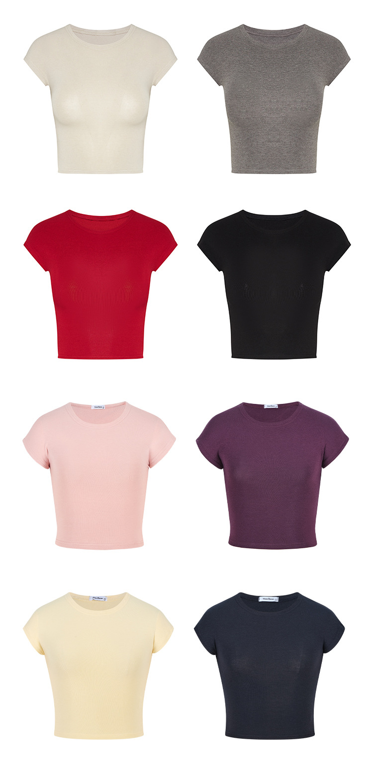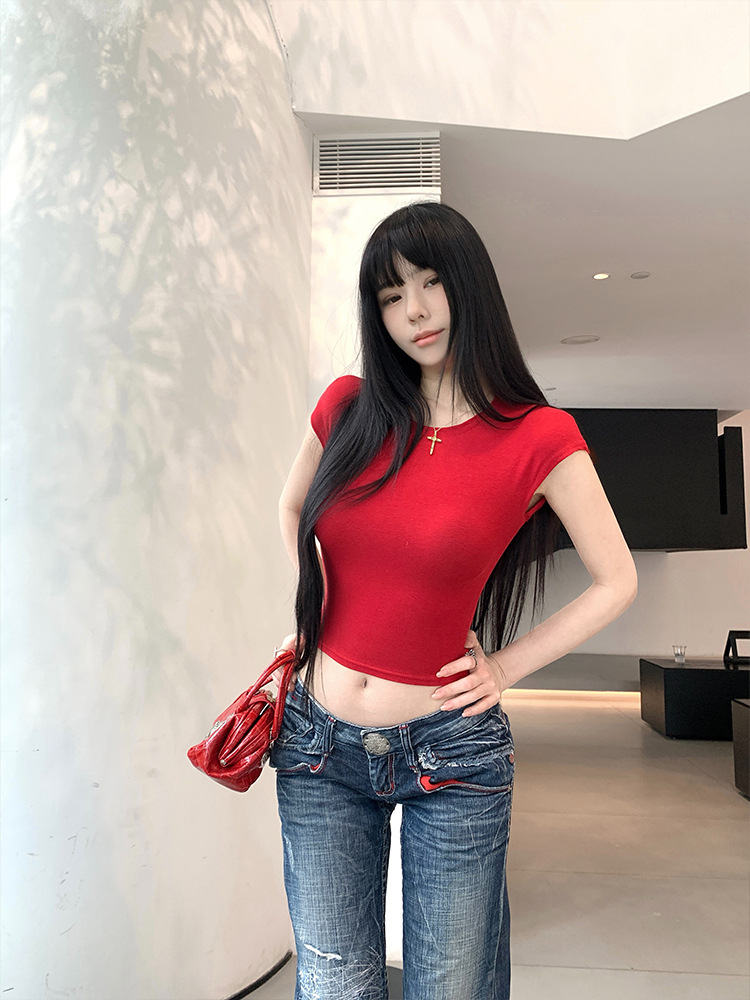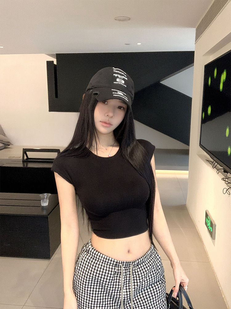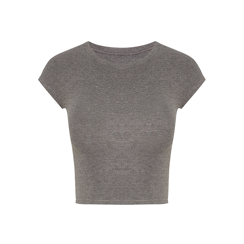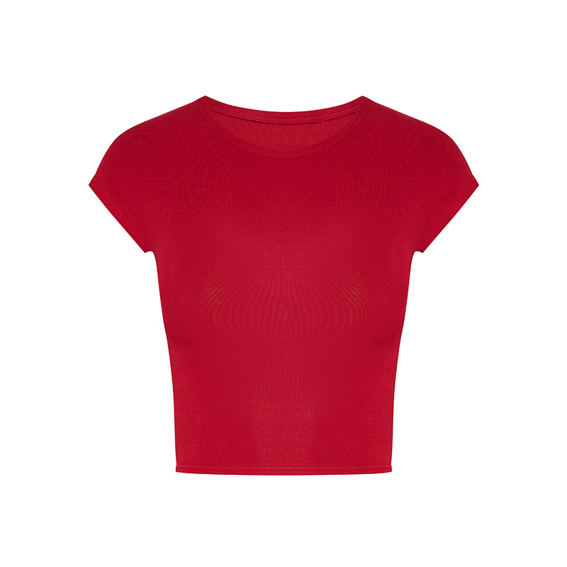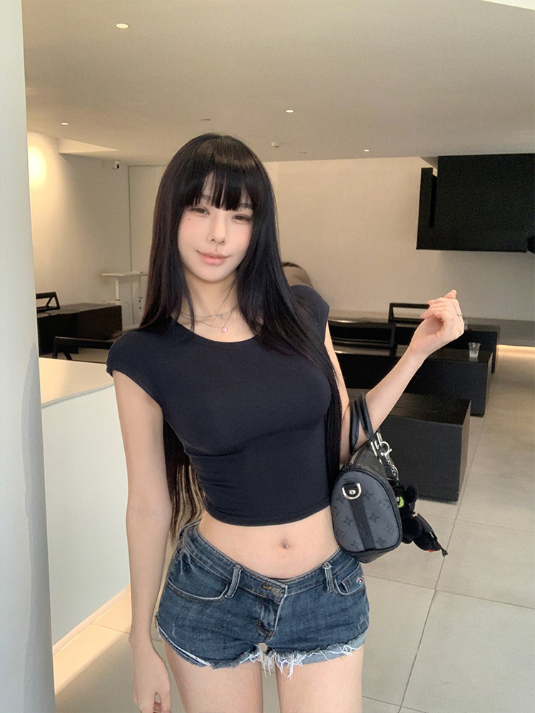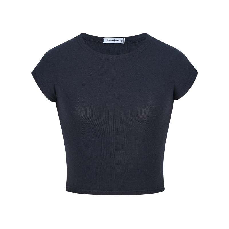 Moxi Queen 여름 몸매 보여주는 반팔 티셔츠 여성 라운드 넥 심플 바닥 솔리드 컬러 쇼트 탑 62169