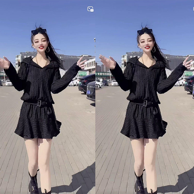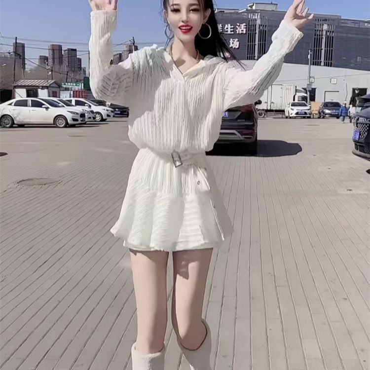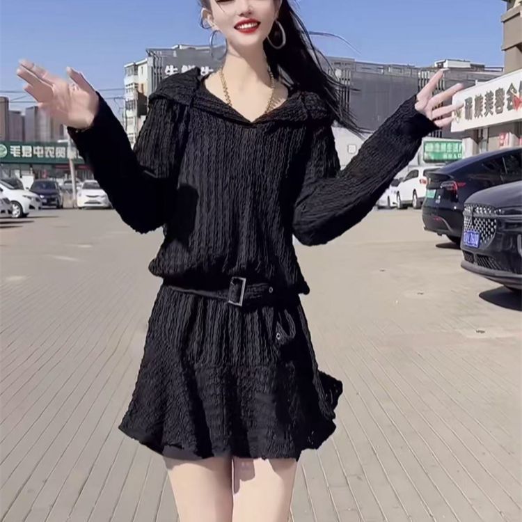 슬리밍 원피스 여성의 2025 새로운 빈티지 패션 느슨한 우아한 허리 배꼽이 중간 길이의 귀여운 모자를 입고 외부