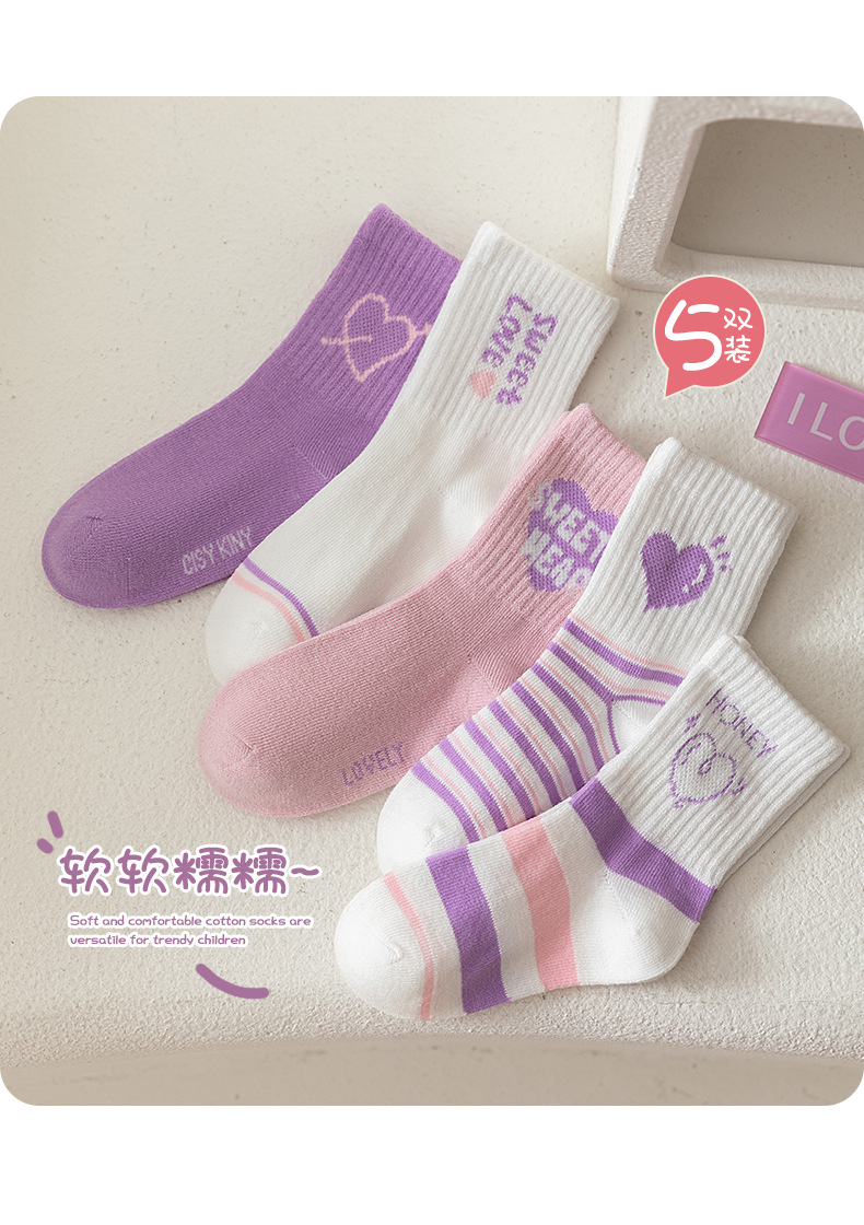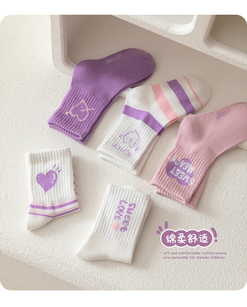 엄선된 새로운 가을 겨울 여아 양말, A급 면 양말, 중간 길이 양말, 보라색 고탄성, 편안하고 신축성이 없는 아동 양말