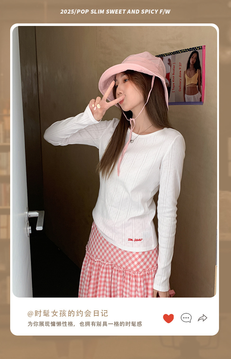 한국식 화이트 자카드 텍스처 크루 넥 긴팔 티셔츠 여성용 봄과 여름 슬림핏 슬리밍 탑