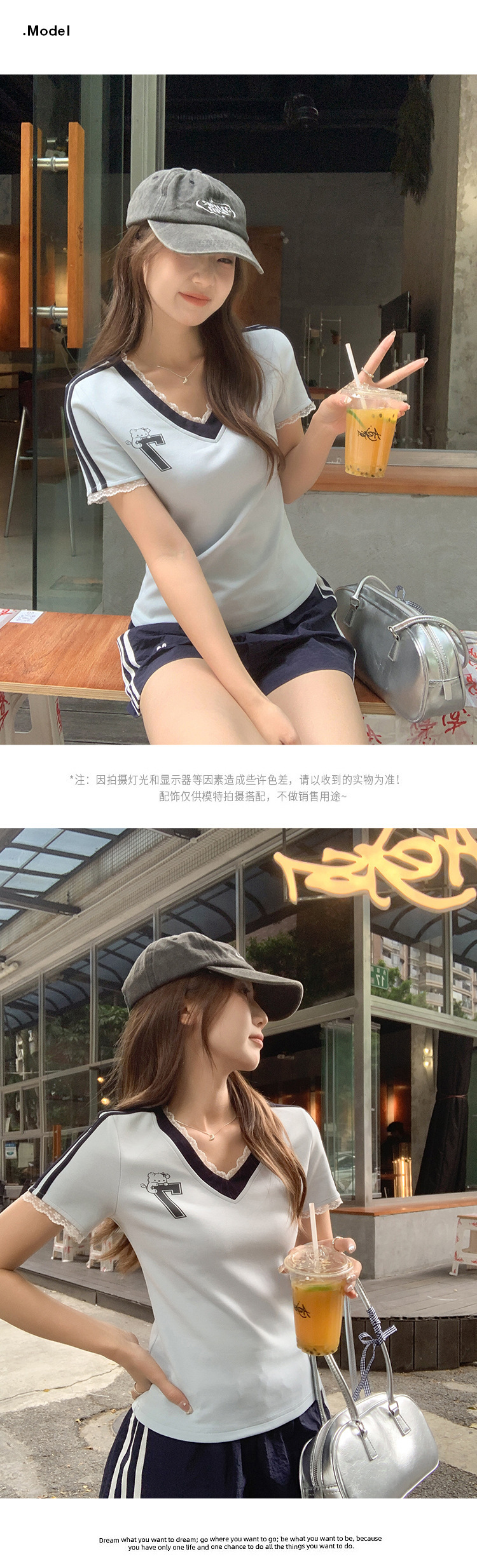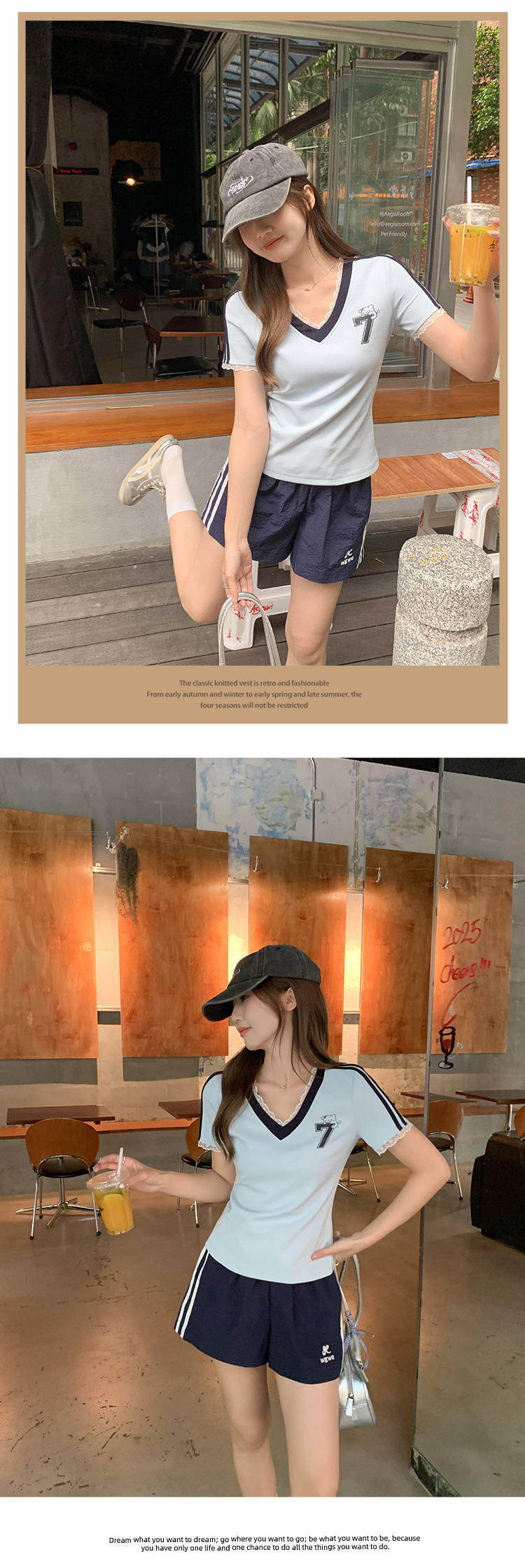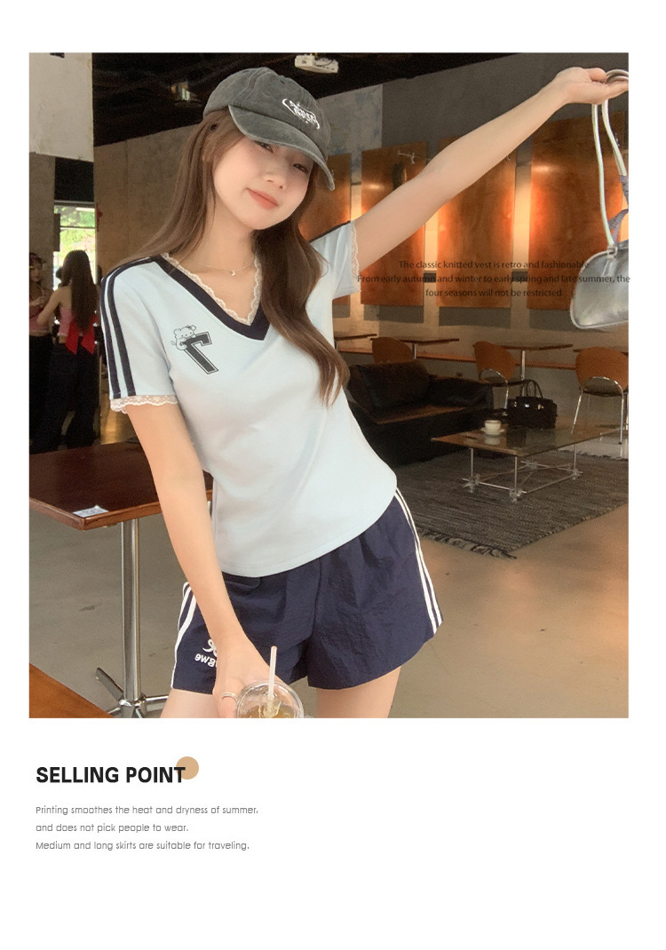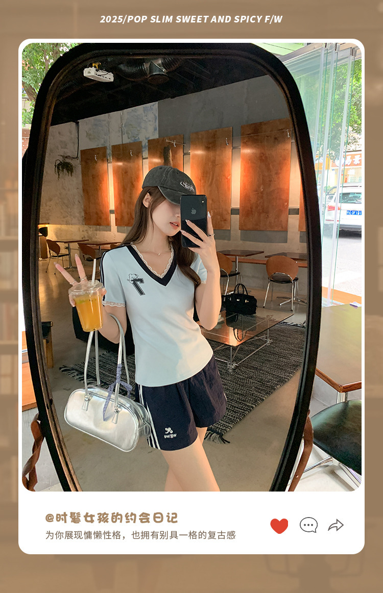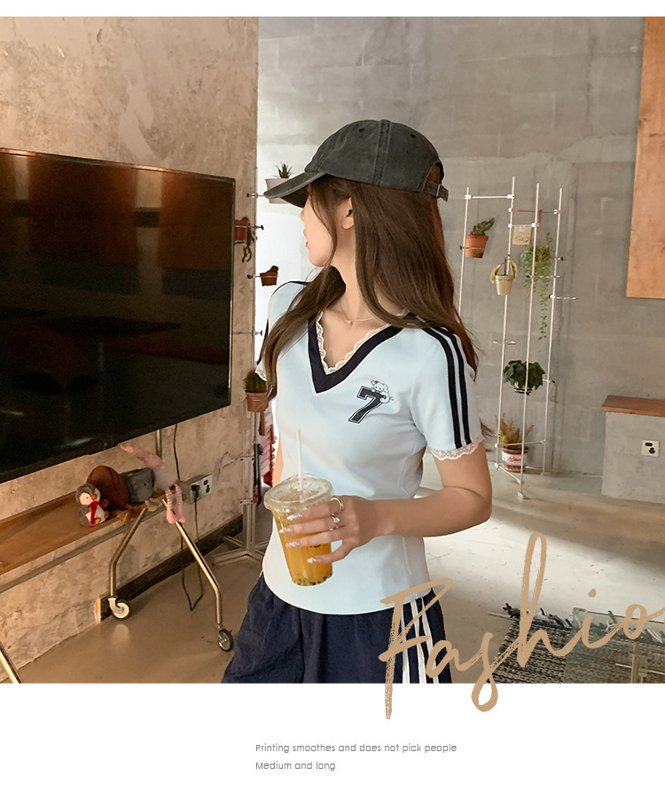 하이 엔드 레이스 스티칭 블루 V 넥 숄더 반팔 티셔츠 여성 여름 디자인 순수한 욕망 스타일 세련된 여성 아우터웨어스토어 가기