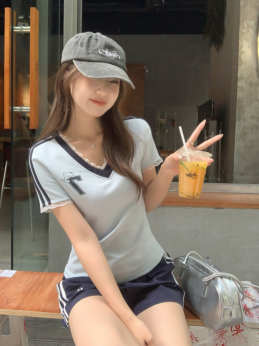 하이 엔드 레이스 스티칭 블루 V 넥 숄더 반팔 티셔츠 여성 여름 디자인 순수한 욕망 스타일 세련된 여성 아우터웨어