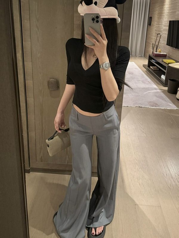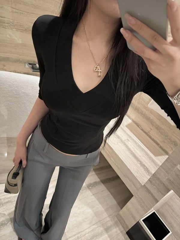 블랙 V 넥 긴팔 니트 티셔츠 여성용 여름 반소매 슬림-적합 허리 내부 스파이스 소녀 타이트한 피규어-쇼 탑스토어 가기