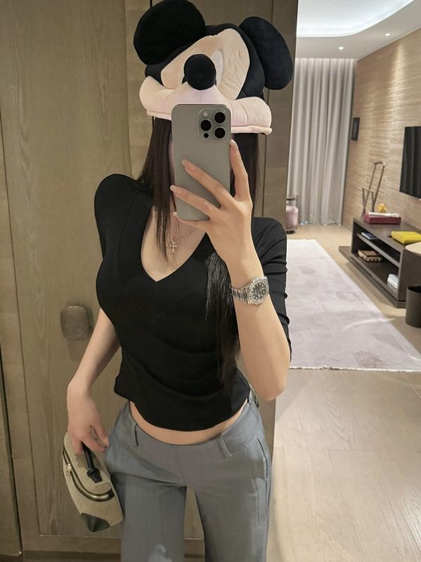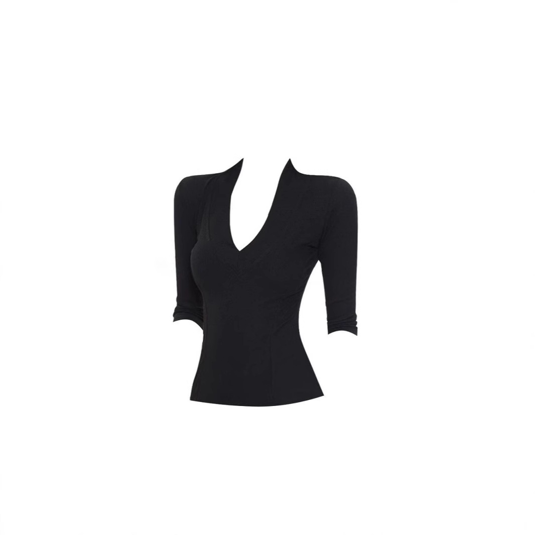 블랙 V 넥 긴팔 니트 티셔츠 여성용 여름 반소매 슬림-적합 허리 내부 스파이스 소녀 타이트한 피규어-쇼 탑