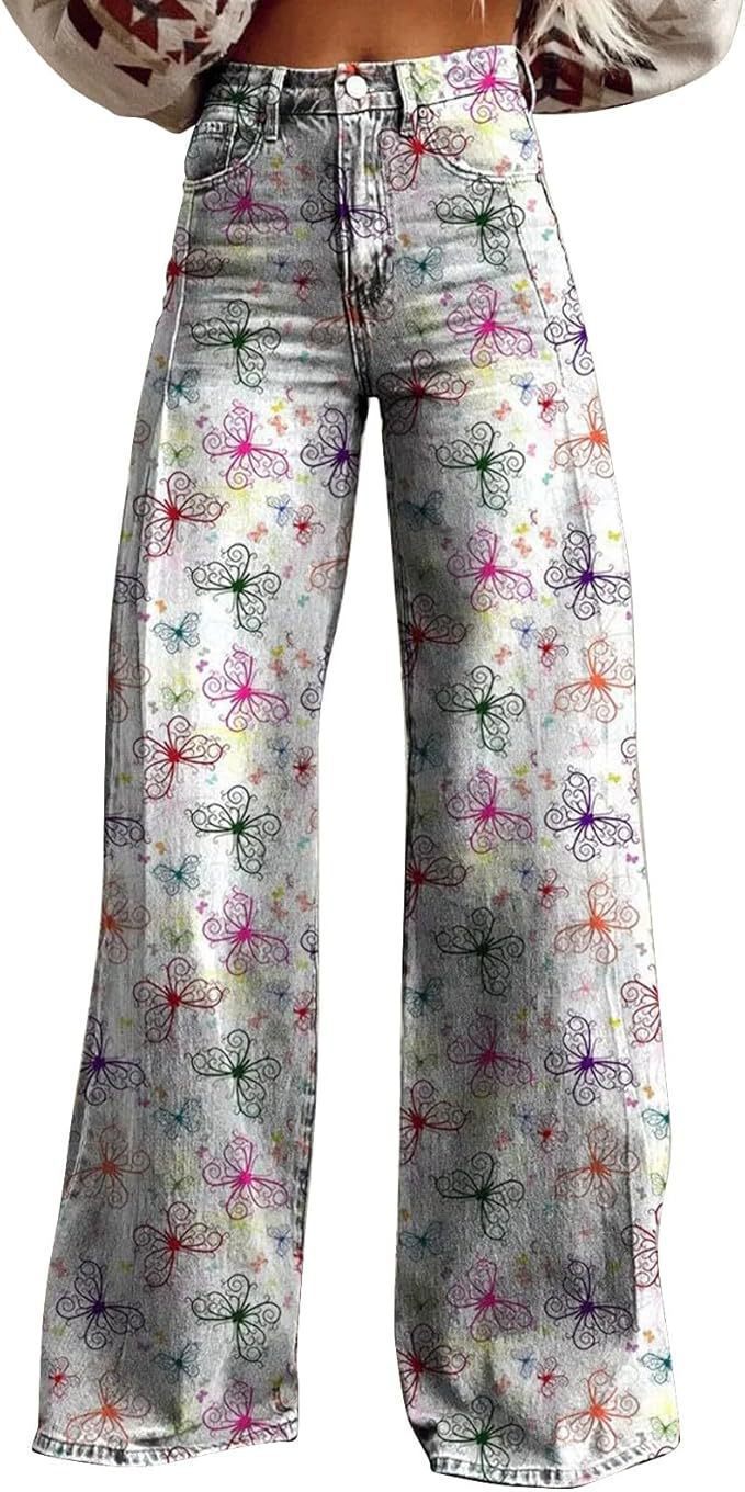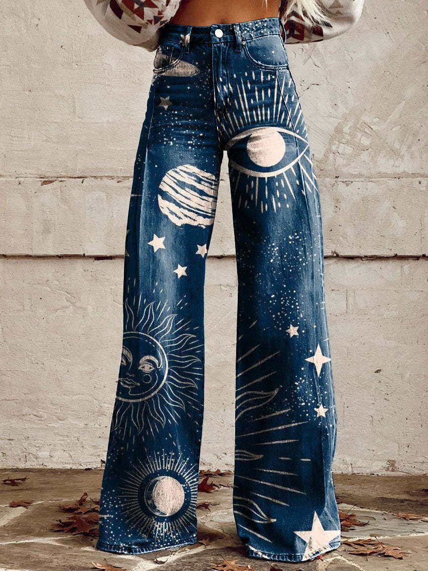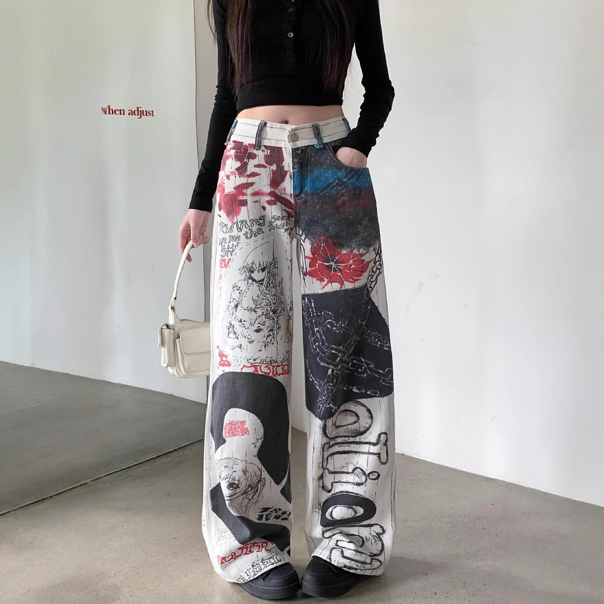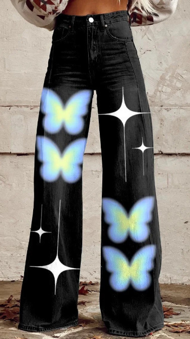 대외 무역 전자 상거래 여성용 와이드 팬츠 새로운 3D 프린트 플레어 팬츠 시뮬레이션 데님 바지 봄, 가을 얇은 스타일스토어 가기