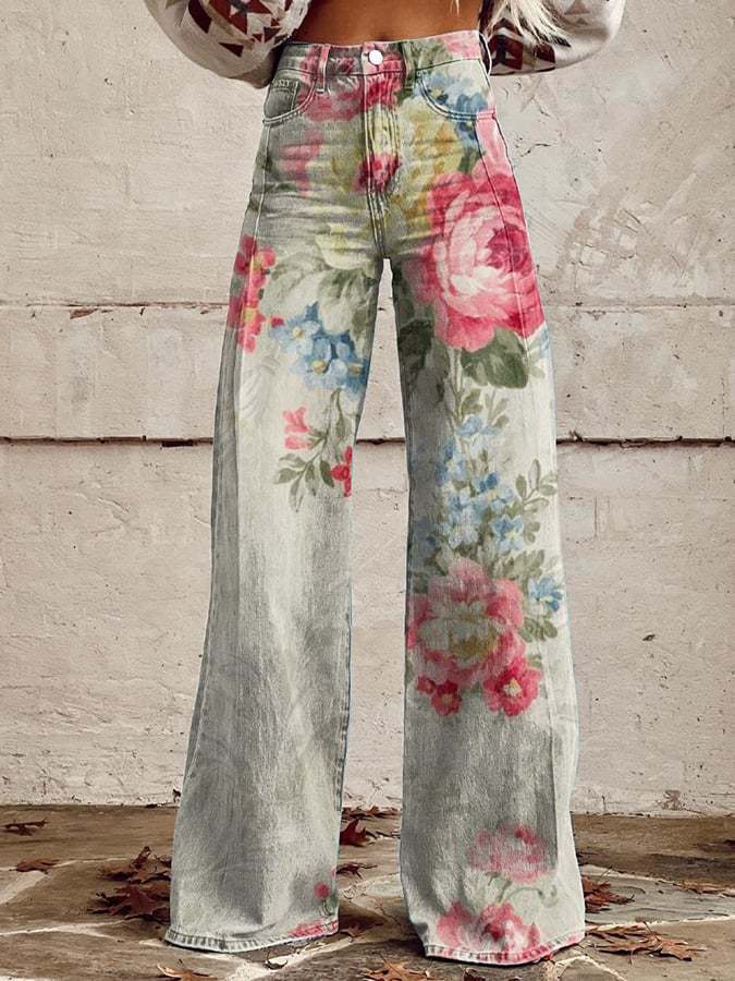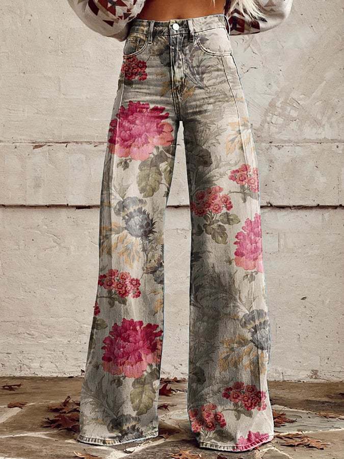 대외 무역 전자 상거래 여성용 와이드 팬츠 새로운 3D 프린트 플레어 팬츠 시뮬레이션 데님 바지 봄, 가을 얇은 스타일