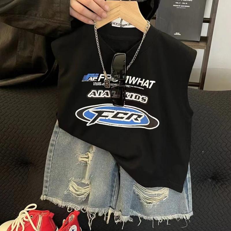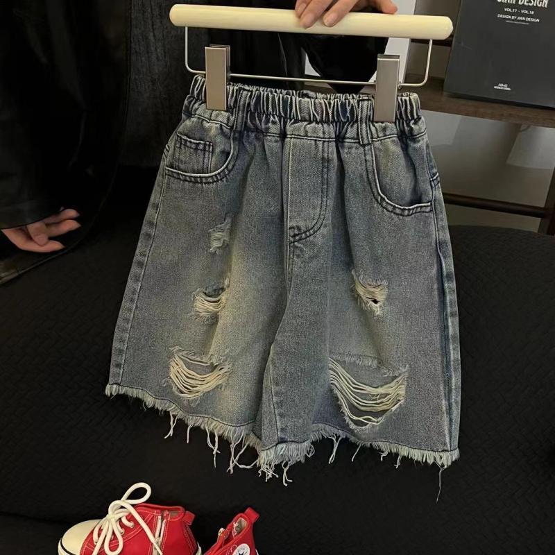 소년 2025 새로운 여름 한국 패션 정장 편지 인쇄 서양식 탑 찢어진 데님 반바지 스트리트웨어스토어 가기