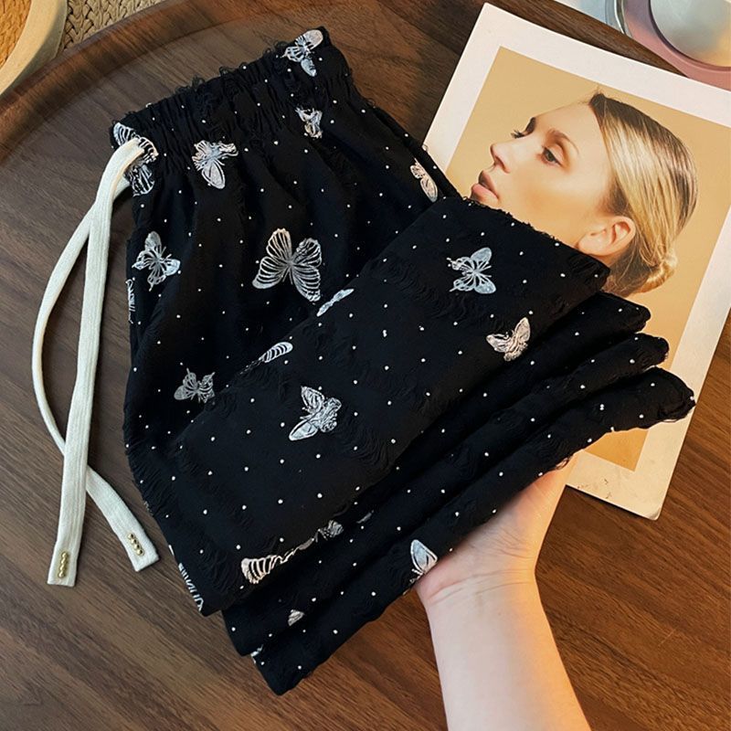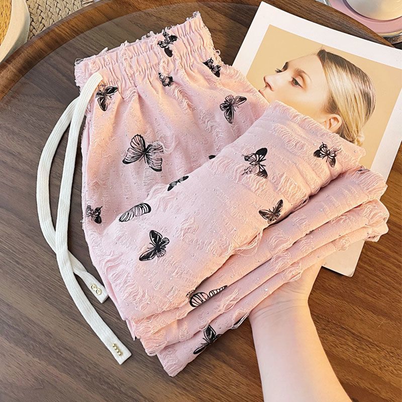 나비 인쇄 짧은 여름 얇은 찢어진 2025 Yamamoto 스트레이트 다리 바지 여성의 높은 허리 데프 캐주얼 와이드 다리 바지스토어 가기