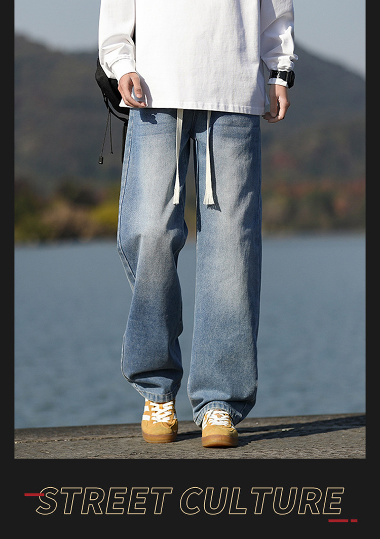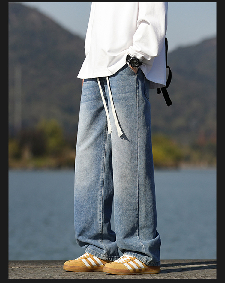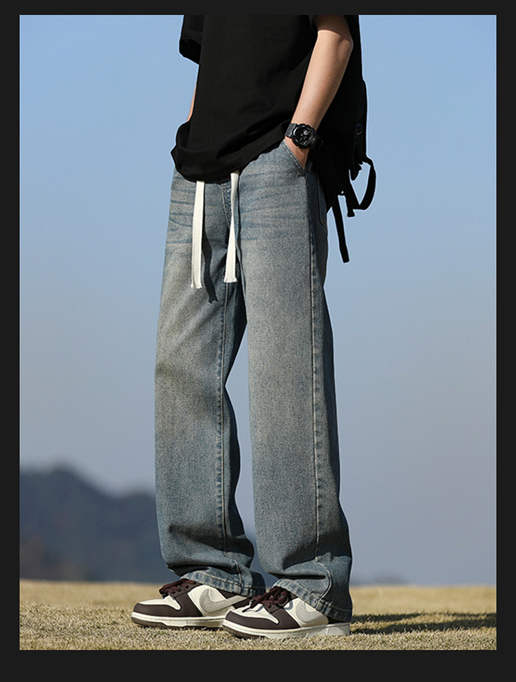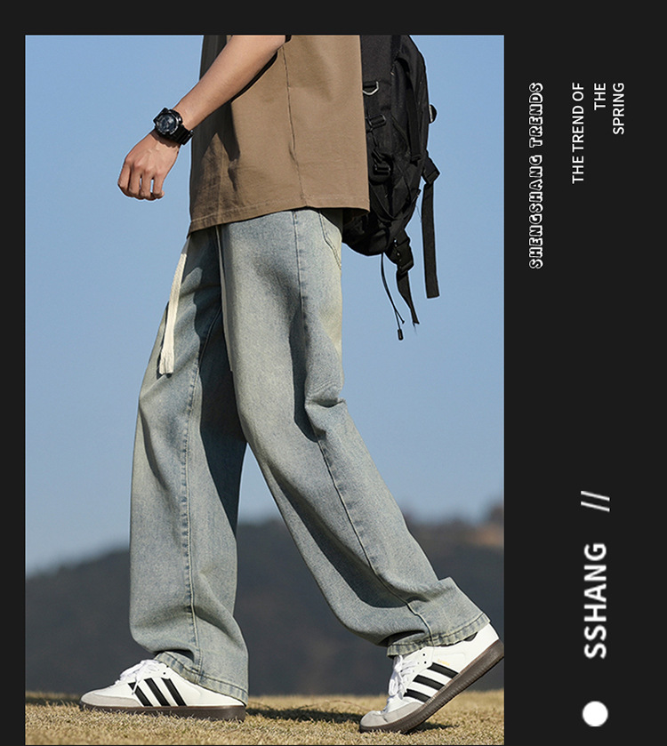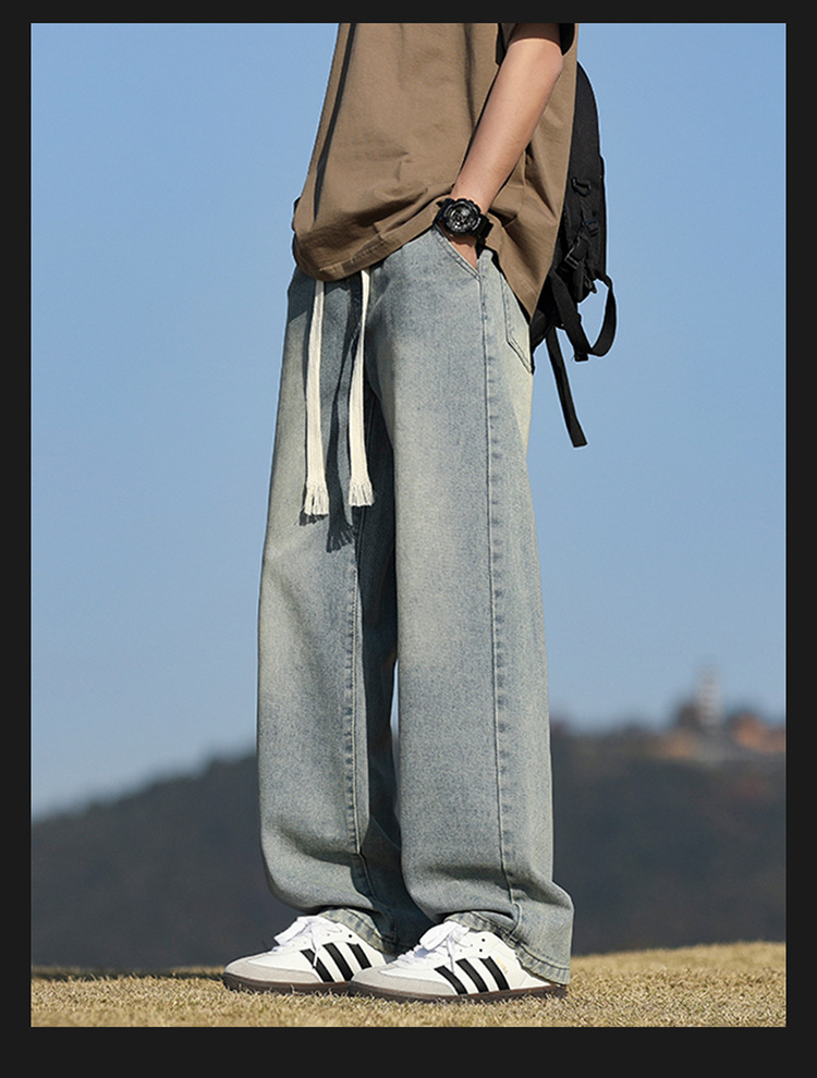 넓은 다리 청바지 남자 2025 년 새로운 봄과 가을 바지 느슨한 오래된 미국 스타일 복고풍 빨래 다리 바지
