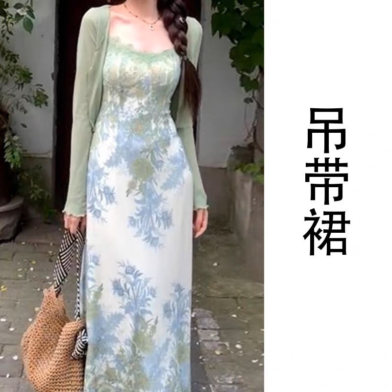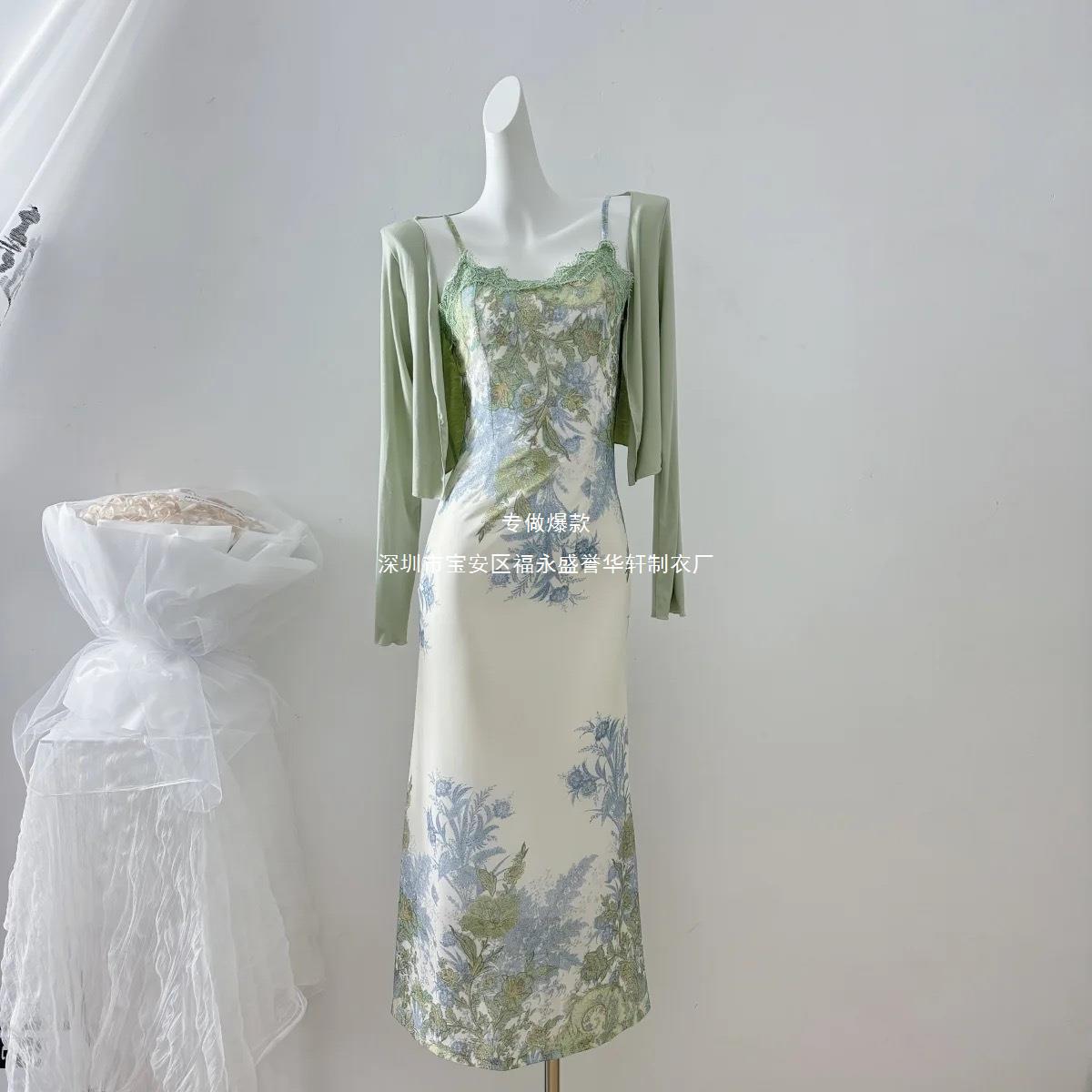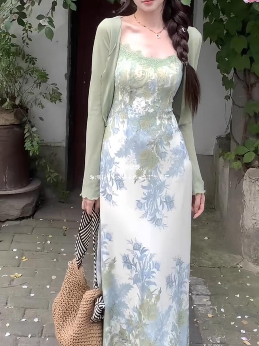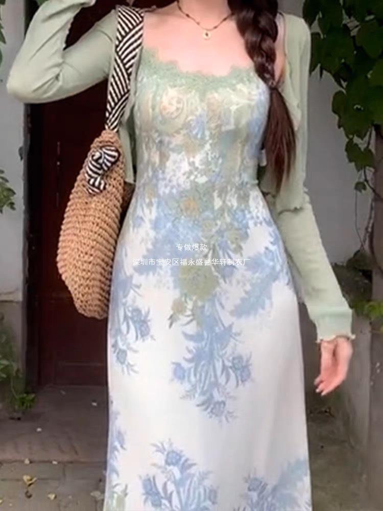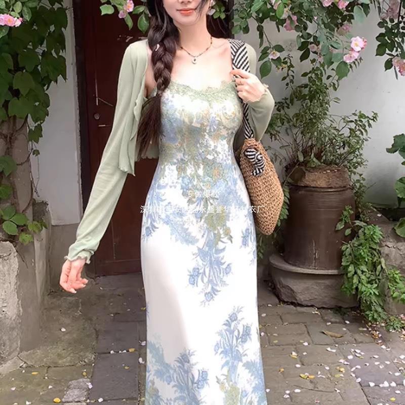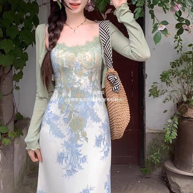 순수한 욕망 스타일 레이스 바느질 인쇄 슬링 원피스 여성 여름 프랑스 스타일 우아한 휴일 긴 원피스 카디건 투피스 세트