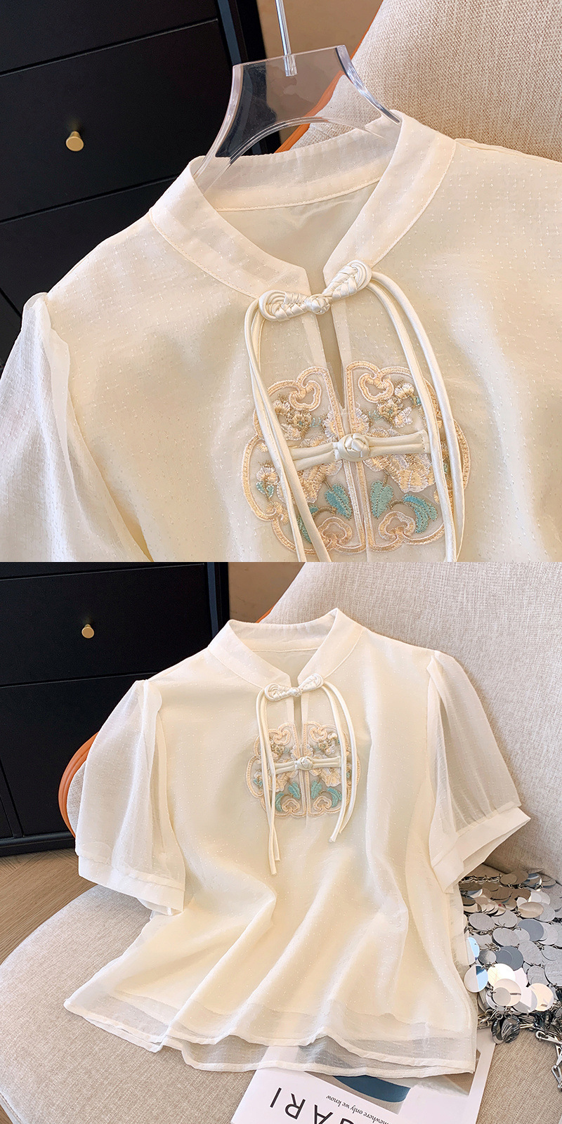 새로운 중국 스타일 국가 스타일 자수 쉬폰 반팔 셔츠 여성용 여름 플러스 사이즈 통통녀 슬리밍 작은 셔츠 버클스토어 가기