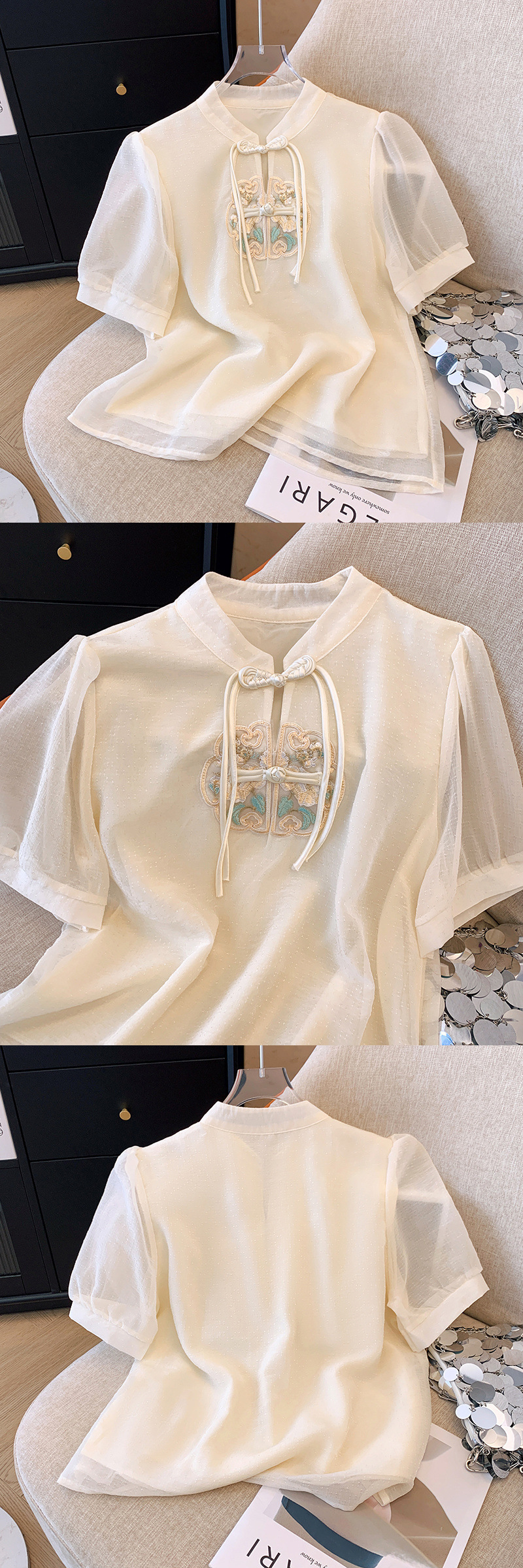 새로운 중국 스타일 국가 스타일 자수 쉬폰 반팔 셔츠 여성용 여름 플러스 사이즈 통통녀 슬리밍 작은 셔츠 버클