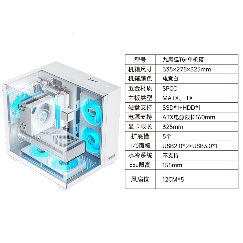 9 꼬리 여우 T6 기둥없는 채광창 바다 전망 룸 컴퓨터 케이스 데스크탑 3면 유리 측면 투명 matx 흰색