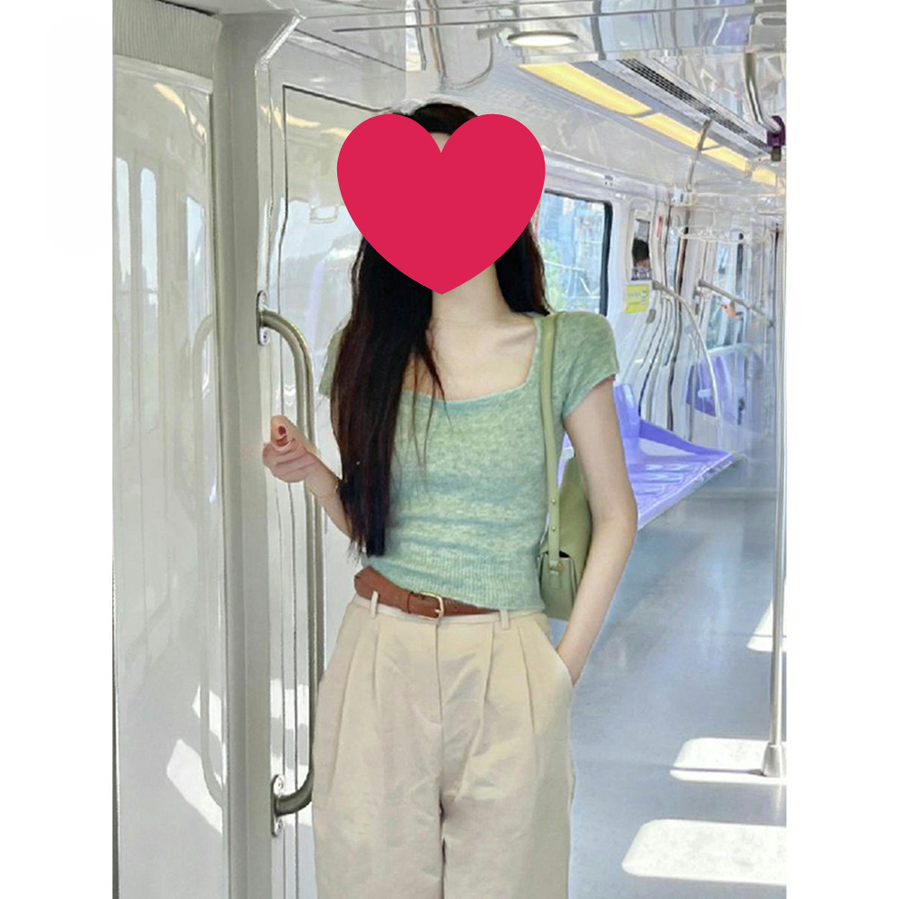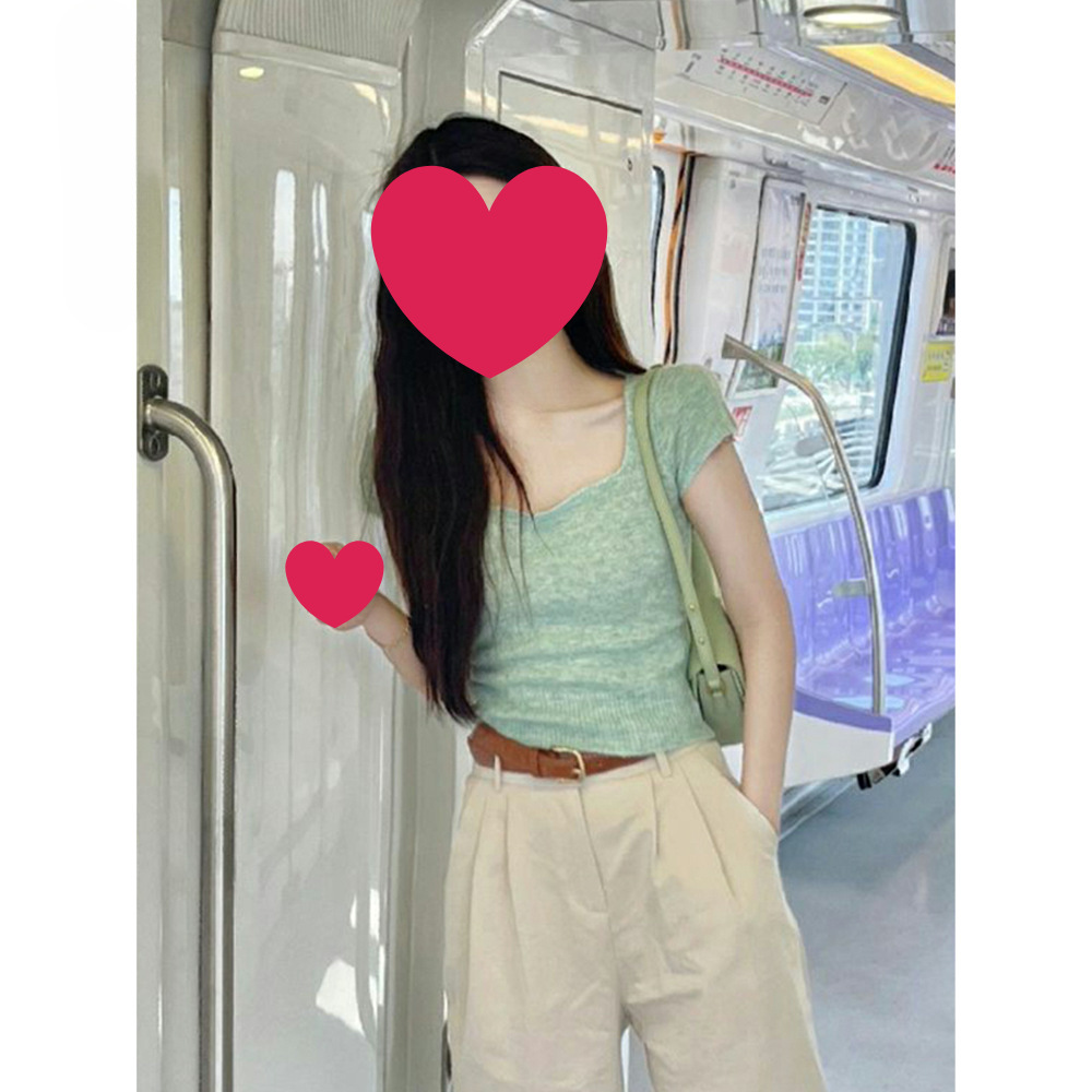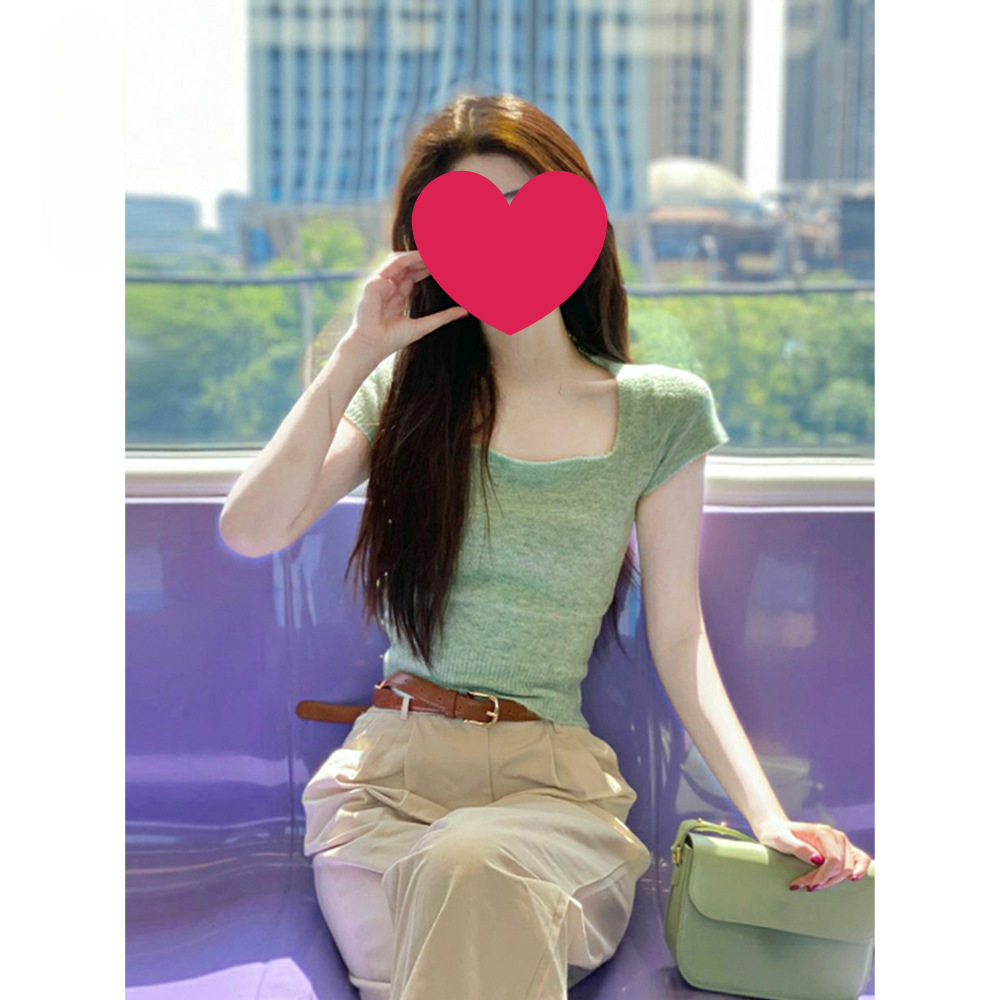 여름 2025 새로운 스타일 얇은 스퀘어 칼라 니트 스웨터 고급 그린 쇼트 탑 아이스 실크 반팔 티셔츠 여성용 여름스토어 가기