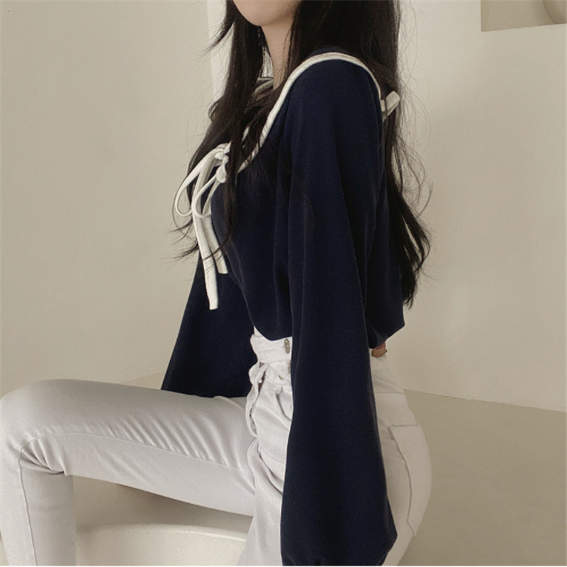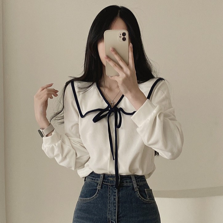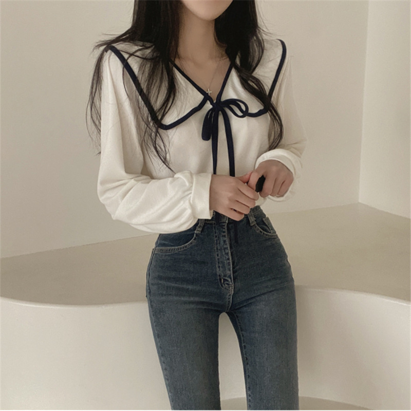 한국 세련된 봄 프랑스 기질 큰 옷깃 레이스 활 디자인 느슨한 올 매치 긴 소매 셔츠 탑