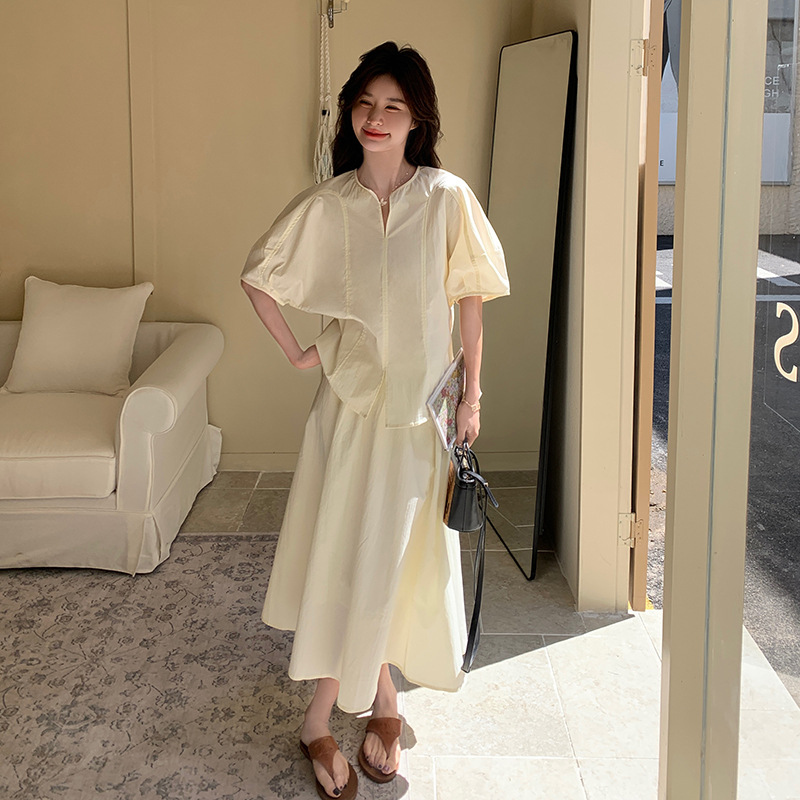 리얼 샷 반팔 셔츠 톱 스커트 세트 2025 새로운 루즈 캐주얼 슬림 스커트 투피스 세트