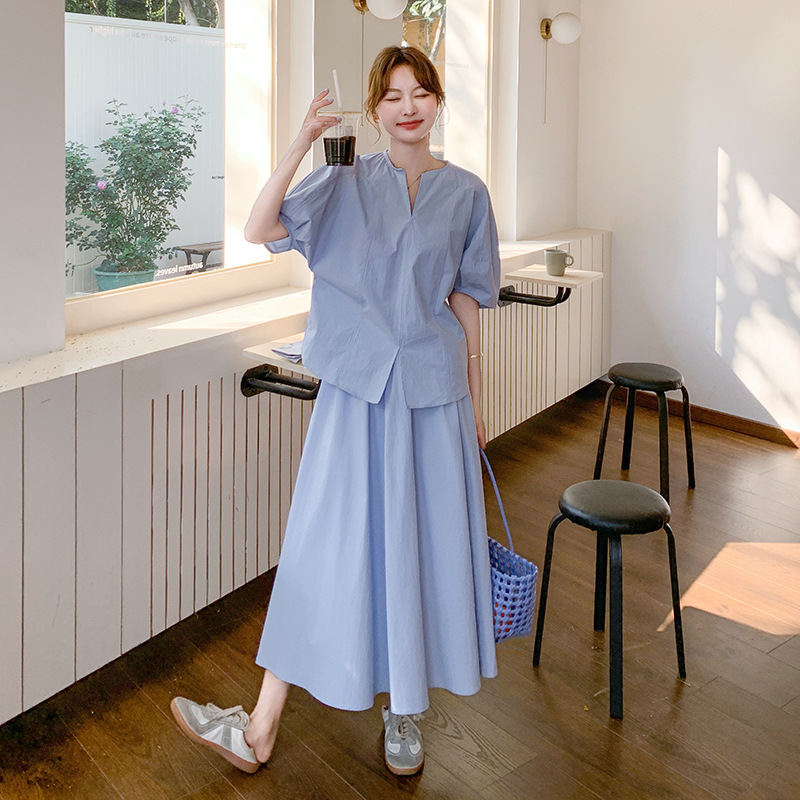리얼 샷 반팔 셔츠 톱 스커트 세트 2025 새로운 루즈 캐주얼 슬림 스커트 투피스 세트스토어 가기