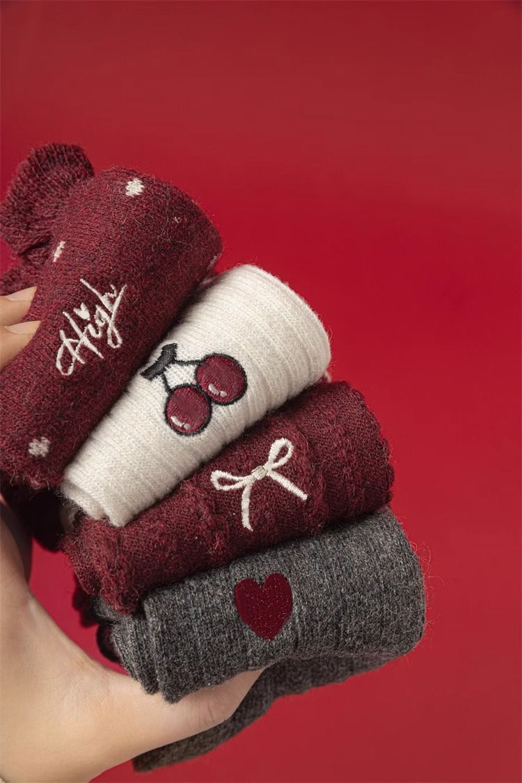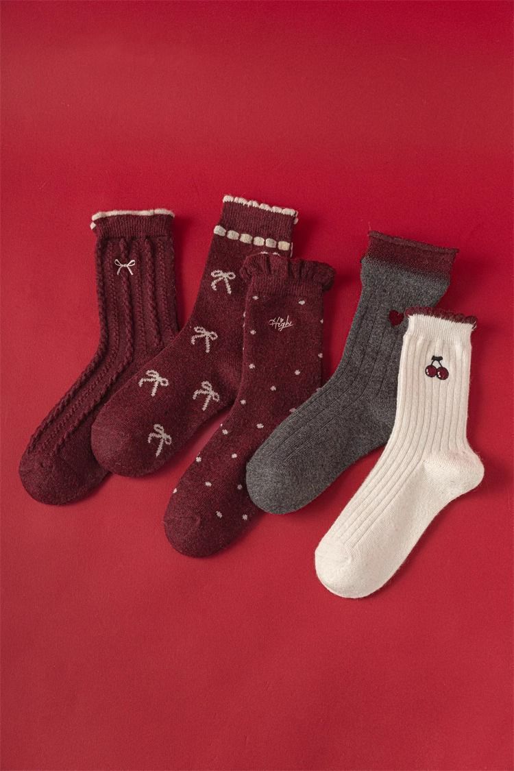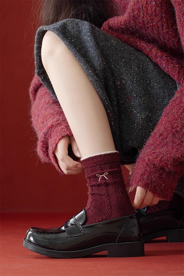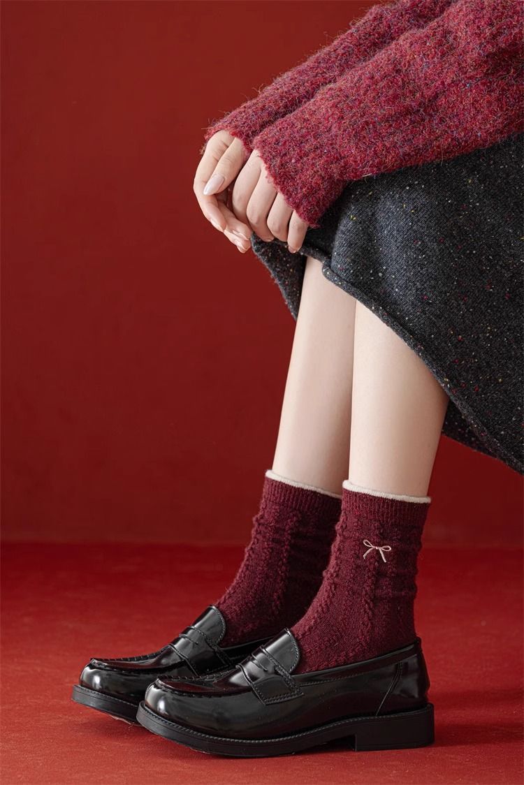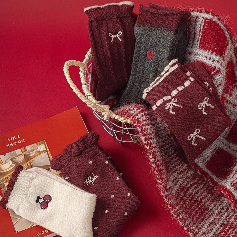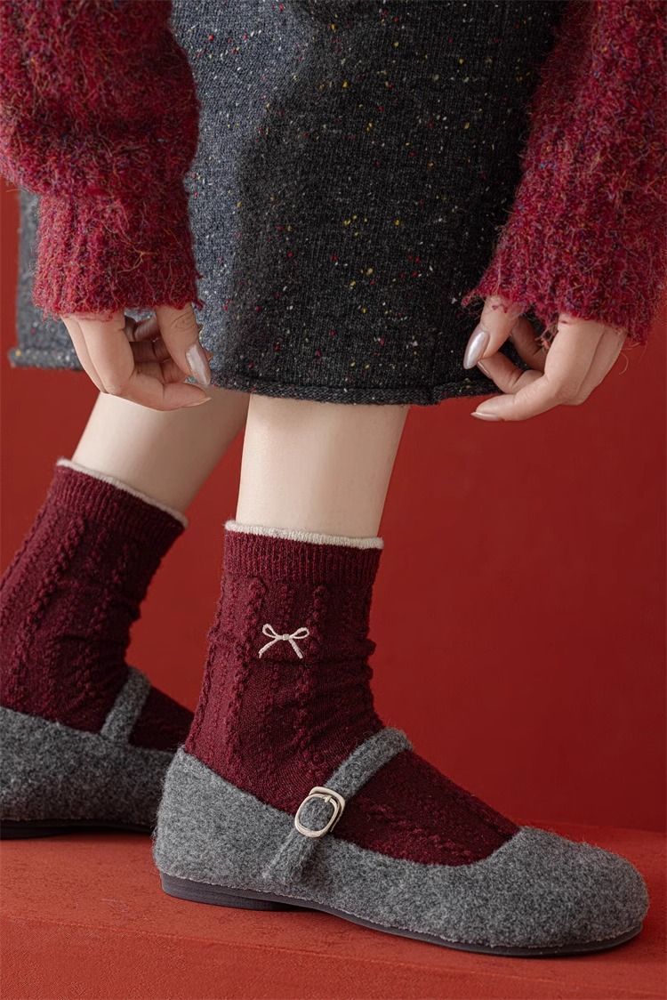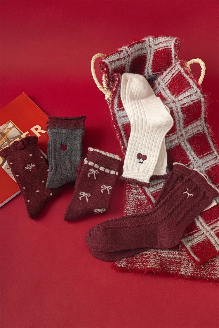 여아 안코라 레드 가을 겨울 양말, 중대형 아동용 종아리 양말, 회색 빨간색 리본 새해 양말스토어 가기