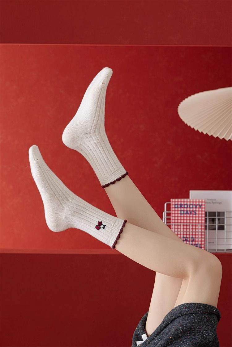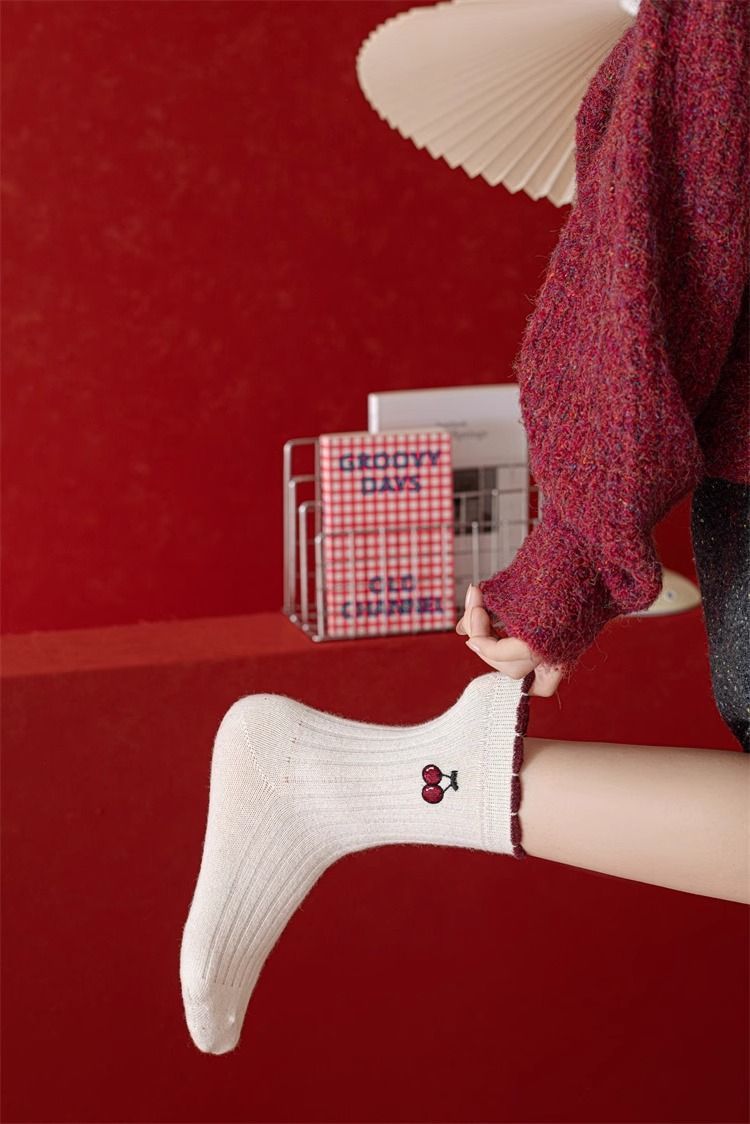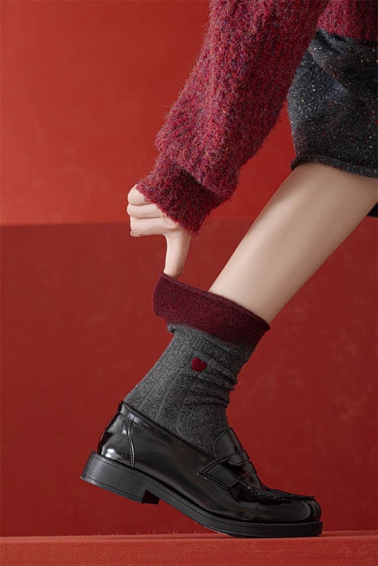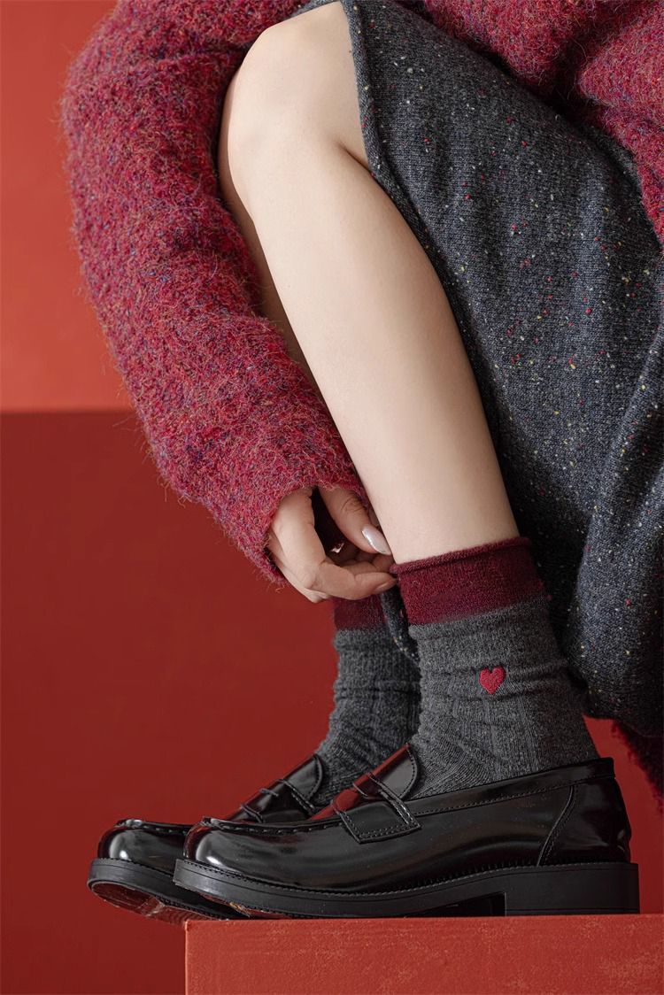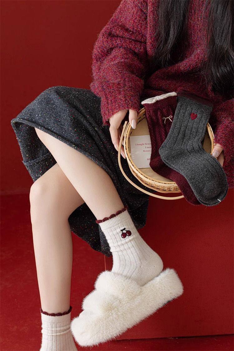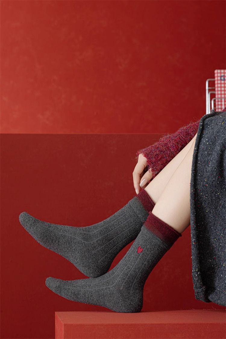 여아 안코라 레드 가을 겨울 양말, 중대형 아동용 종아리 양말, 회색 빨간색 리본 새해 양말스토어 가기