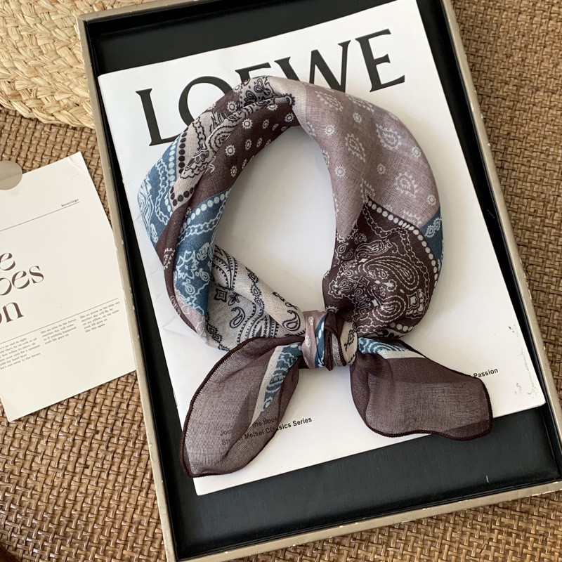 빈티지 컬러 블록 캐슈 플라워 코튼 리넨 헤어 밴드 실크 스카프 작은 스퀘어 스카프 여성의 봄과 가을 스카프 넥타이 가방 장식 스카프